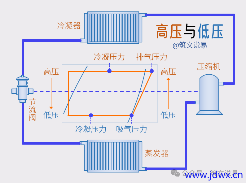 实际上,整个制冷系统中可以近似地认为只有两个压力,即高压压力和低压压力。高压压力即冷凝压力,低压压力即蒸发压力。