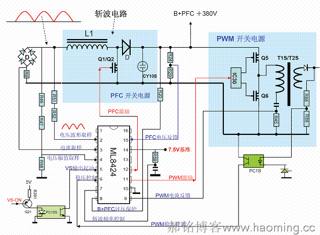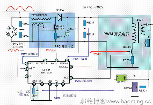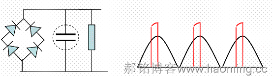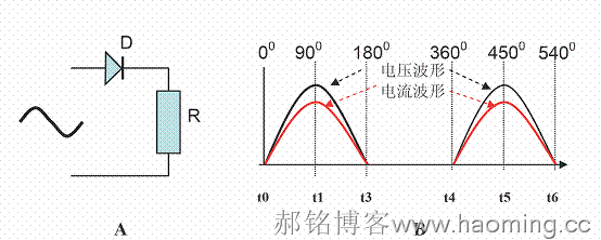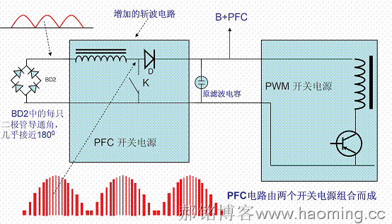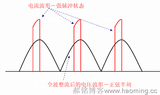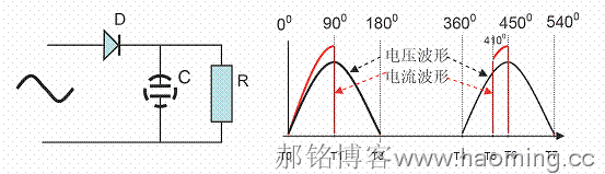 | 郝 铭 什么是功率因数补偿,什么是功率因数校正: 功率因数补偿:在上世纪五十年代,已经针对具有感性负载的交流用电器具的电压和电流不同相(图1)从而引起的供电效率低下提出了改进方法(由于感性负载的电流滞后所加电压,由于电压和电流的相位不同使供电线路的负担加重导致供电线路效率下降,这就要求在感性用电器具上并联一个电容器用以调整其该用电器具的电压、电流相位特性,例如:当时要求所使用的40W日光灯必须并联一个4.75μF的电容器)。用电容器并连在感性负载,利用其电容上电流超前电压的特性用以补偿电感上电流滞后电压的特性来使总的特性接近于阻性,从而改善效率低下的方法叫功率因数补偿(交流电的功率因数可以用dianyuan电源电压与负载电流两者相位角的余弦函数值cosφ表示)。 图1 在具有感性负载中供电线路中电压和电流的波形 而在上世纪80年代起,用电器具大量的采用效率高的开关dianyuan电源,由于开关dianyuan电源都是在整流后用一个大容量的滤波电容,使该用电器具的负载特性呈现容性,这就造成了交流220V在对该用电器具供电时,由于滤波电容的充、放电作用,在其两端的直流电压出现略呈锯齿波的纹波。滤波电容上电压的最小值远非为零,与其最大值(纹波峰值)相差并不多。根据整流二极管的单向导电性,只有在AC线路电压瞬时值高于滤波电容上的电压时,整流二极管才会因正向偏置而导通,而当AC输入电压瞬时值低于滤波电容上的电压时,整流二极管因反向偏置而截止。也就是说,在AC线路电压的每个半周期内,只是在其峰值附近,二极管才会导通。虽然AC输入电压仍大体保持正弦波波形,但AC输入电流却呈高幅值的尖峰脉冲,如图2所示。这种严重失真的电流波形含有大量的谐波成份,引起线路功率因数严重下降。 在正半个周期内(1800),整流二极管的导通角大大的小于1800甚至只有300-700,由于要保证负载功率的要求,在极窄的导通角期间会产生极大的导通电流,使供电电路中的供电电流呈脉冲状态,它不仅降低了供电的效率,更为严重的是它在供电线路容量不足,或电路负载较大时会产生严重的交流电压的波形畸变(图3),并产生多次谐波,从而,干扰了其它用电器具的正常工作(这就是电磁干扰-EMI和电磁兼容-EMC问题)。 图2 自从用电器具从过去的感性负载(早期的电视机、收音机等的dianyuan电源均采用dianyuan电源变压器的感性器件)变成带整流及滤波电容器的容性负载后,其功率因素补偿的含义不仅是供电的电压和电流不同相位的问题,更为严重的是要解决因供电电流呈强脉冲状态而引起的电磁干扰(EMI)和电磁兼容(EMC)问题。 这就是在上世纪末发展起来的一项新技术(其背景源于开关dianyuan电源的迅速发展和广泛应用)。其主要目的是解决因容性负载导致电流波形严重畸变而产生的电磁干扰(EMl)和电磁兼容(EMC)问题。所以现代的长虹PFC技术完全不同于过去的功率因数补偿技术,它是针对非正弦电流波形畸变而采取的,迫使交流线路电流追踪电压波形瞬时变化轨迹,并使电流和电压保持同相位,使系统呈纯电阻性技术(线路电流波形校正技术),这就是长虹PFC(功率因数校正)。 所以现代的长虹PFC技术完成了电流波形的校正也解决了电压、电流的同相问题。 图3 于以上原因,要求用电功率大于85W以上(有的资料显示大于75W)的容性负载用电器具,必须增加校正其负载特性的校正电路,使其负载特性接近于阻性(电压和电流波形同相且波形相近)。这就是现代的功率因数校正(长虹PFC)电路。 容性负载的危害 下面的图4是不用滤波电容的半波整流电路,图5是用了大容量滤波电容的半波整流电路。我们根据这两个电路来分析两电路中电流的波形。 图4 图4A中D是整流管,R是负载。图4B是该电路接入交流电时电路中电压、电流波形图, 在(00~1800)t0~t3时间:t1时间电压为零电流为零,在t1时间电压达到最大值电流也达到最大值,在t3时间电压为零电流为零。(二极管导通1800) 在(1800~3600)t3~t4:时间:二极管反偏无电压及电流。(二极管截止) 在(3600~5400)t4~t6时间:t4时间电压为零电流为零,在t5时间电压达到最大值电流也达到最大值,在t6时间电压为零电流为零。(二极管导通1800) 结论:在无滤波电容的整流电路中,供电电路的电压和电流同相,二极管导通角为1800,对于供电线路来说,该电路呈现纯阻性的负载特性。 A B 图5 图5A中D是整流管,R是负载,C是滤波电容。图5B是该电路接入交流电时电路中电压、电流波形图。 在(00~1800)t0~t3时间:t1时间电压为零电流为零,在t1时间电压达到最大值电流也达到最大值,因为此时对负载R供电的同时还要对电容C 进行充电,所以电流的幅度比较大。在t1时间由于对电容C进行充电,电容上电压Uc达到输入交流电的峰值,由于电容上电压不能突变,使在t1~t3期间,二极管右边电压为Uc,而左边电压在t2时间电压由峰值逐渐下降为零,t1~t3期间二极管反偏截止,此期间电流为零。(增加滤波电容C后第一个交流电的正半周,二极管的导通角为900 ) 在(1800~3600)t3~t4时间:二极管反偏无电压及电流。(二极管截止) 在(3600~4100)t4~t5时间:由于在t3~t4时间二极管反偏,不对C充电,C上电压通过负载放电,电压逐渐下降(下降的幅度由C的容量及R的zuzhi阻值大小决定,如果C的容量足够大,而且R的zuzhi阻值也足够大,其Uc下降很缓慢。)在t4~t5期间尽管二极管左边电压在逐步上升,但是由于二
