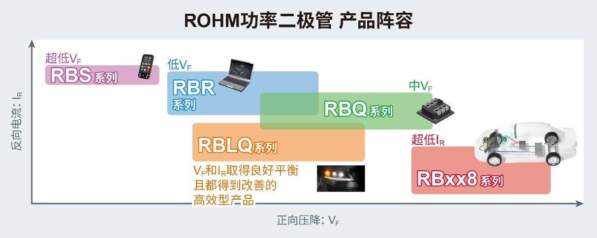 | {本文由家电维修技术论坛小编收集整理资料}近年来,随着电动汽车的加速以及物联网在工业设备、消费电子设备领域的普及,应用产品中搭载的半导体数量也与日俱增。其中,中等耐压的二极管因其能有效整流和保护电路,而被广泛应用在从手机到电动汽车动力总成系统等各种电路和领域中,半导体厂商罗姆在这些领域中已经拥有骄人业绩(图1)。 1. 前言 近年来,随着电动汽车的加速以及物联网在工业设备、消费电子设备领域的普及,应用产品中搭载的半导体数量也与日俱增。其中,中等耐压的二极管因其能有效整流和保护电路,而被广泛应用在从手机到电动汽车动力总成系统等各种电路和领域中,半导体厂商罗姆在这些领域中已经拥有骄人业绩(图1)。 图1. 罗姆在整流二极管和功率二极管领域的市场份额 VF(正向电压)和IR(反向电流)是二极管的重要性能指标,它们分别会影响到正向施加时的功率损耗和反向施加时的功率损耗。“理想的二极管”是VF和IR为0的二极管,也就是进行整流和开关工作时完全没有功率损耗的二极管。另外,VF和IR之间通常存在权衡关系,因此很难同时改善。而且,在实际的二极管中,当在开关工作期间关断二极管时,会产生一些功率损耗(因为电流在trr时段内会反向流动)。 肖特基势垒二极管(以下简称“SBD”)的VF和trr低于其他类型的二极管,因此在整流电路和开关电路中使用这种二极管可以实现低损耗,然而由于其IR较大,存在发热量大于散热量,最终发生热失控而造成损坏的风险。(图2) 图2. 在开关期间SBD和整流二极管的VF、IR比较 针对这种情况,罗姆开发出丰富的SBD系列产品群,客户可根据各种应用的需求(强调VF还是IR)选用产品。另外,还推出了更接近“理想二极管”的新系列产品,新产品不仅同时改善了本来存在权衡关系的VF和IR特性,还实现了SBD业内超高等级的trr特性。本文将概括介绍罗姆在SBD领域的行动以及罗姆各系列SBD产品的特点。 (有关SBD的详细技术文档,请参阅以下文章。) 车载用肖特基二极管小型高散热封装[PMDE]的优越性 车载小型高效肖特基势垒二极管“RBLQ系列”的优势 2. SBD需要具备的性能及其发展趋势 图3为SBD产品相关的市场情况示例,展示了一辆汽车中搭载的ECU数量。随着ADAS(高级驾驶辅助系统)和自动驾驶技术的发展,一辆汽车中所搭载的ECU数量与日俱增,其中所用的二极管数量也在持续增加,预计未来还会继续增加。由于汽车无法提供超出其电池和发电机能力的电力,因此制造商需要低损耗(低VF)的二极管,并且越来越多地采用VF和trr特性优异的SBD。而另一方面,燃油车的引擎外围电路、以及xEV的电池和电机外围电路是在高温环境中工作的,因此IR高的SBD的热失控风险成为直接关系到可靠性的重大课题。因此,在选择SBD时,关键在于如何在VF和IR之间取得平衡。 图3. 一辆汽车所搭载的ECU数量演变(罗姆调查数据) 在消费电子设备中,随着应用产品的功能越来越多,电路板密度也变得越来越高,甚至密度超过车载设备,因此需要更小型和超低损耗(超低VF)的SBD。另外,在工业设备应用中,其对高可靠性的要求与车载应用相同,而且由于应用产品的机型寿命较长,因此长期稳定供应也很重要。综上所述,身为通用器件的SBD,在不同的领域和应用中,其发展趋势大不相同,制造商在其产品开发过程中,要求一些存在权衡关系(例如更低损耗和更高可靠性、更小型和更大电流)的特性同等出色。为了满足如此广泛的需求,罗姆不断推动相应产品的开发,并建立了以垂直统合型生产体系为中心的长期稳定供应体系。在下一节中,将具体介绍罗姆的SBD产品阵容。 3. 罗姆 SBD系列产品阵容 罗姆最新的SBD产品有5个系列,客户可以根据对VF和IR的不同重视程度,从丰富的产品阵容中选择合适的产品(图4)。另外,每个系列都有丰富的封装阵容,客户还可以根据应用产品的性能要求选择小型封装(图5)。下页将对每种产品的特点分别展开介绍。 图4. 系列产品阵容 图5. 封装阵容 3-1.RBS系列 超低VF(耐压:20V) 该系列的VF最低,在主要用于正向电路中的损耗可大幅降低,非常适用于智能手机等使用电池低电压驱动的移动设备中的整流应用。 目标应用:笔记本电脑、移动设备等 3-2.RBR系列 低VF(耐压:30V/40V/60V) 该系列为通用型产品,与相同尺寸的罗姆以往产品相比,VF特性降低约25%。在车载应用中,正向损耗非常少,因此作为要求更高效率的汽车信息娱乐系统和车载LED灯等的保护二极管,非常受欢迎。2021年8月,封装阵容中又新增了车载用超小型PMDE封装,可满足市场对更小封装的需求。 目标应用:车载信息娱乐系统、车载LED灯、车载ECU、笔记本电脑等 3-3.RBQ系列 低IR(耐压:45V/65V/100V) 该系列利用罗姆自有的势垒形成技术,在VF特性与IR特性之间取得了良好的平衡。与罗姆以往产品相比,其反向功率损耗降低了60%,因此可以降低热失控风险,非常适用于需要在高温环境下运行的引擎ECU整流应用、高输出功率LED前照灯的保护应用、以及大电流工业设备电源等应用。 目标应用:xEV、引擎ECU、高输出功率LED前照灯、工业设备电源等 3-4.RBxx8系列 超低IR(耐压:30V/40V/60V/100V/150V/200V) 该系列产品具有超低IR,可以降低热失控风险,非常适用于需要在高温环境下运行的xEV电池和电机相关ECU、以及燃油车引擎ECU和变速箱ECU等的整流应用。该系列支持耐压高达200V,可以替换通常在这个耐压范围使