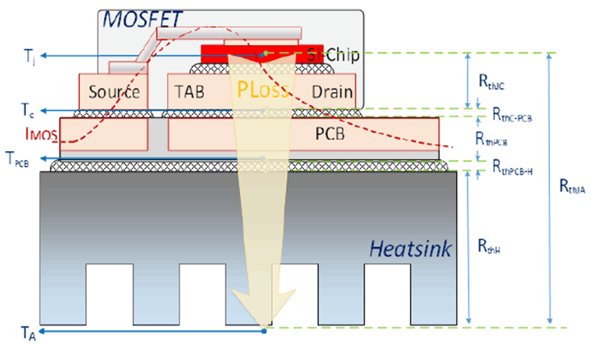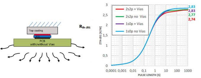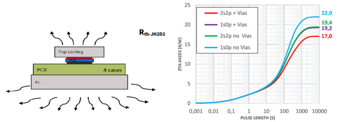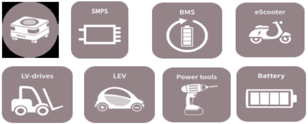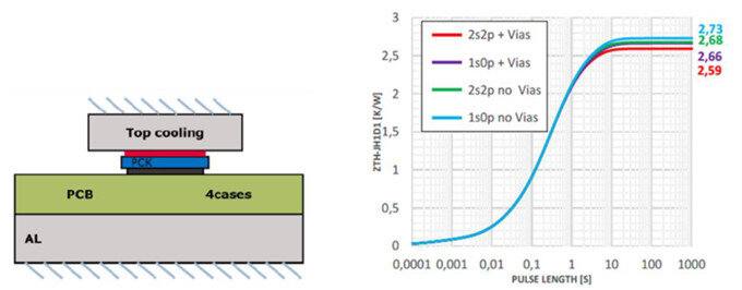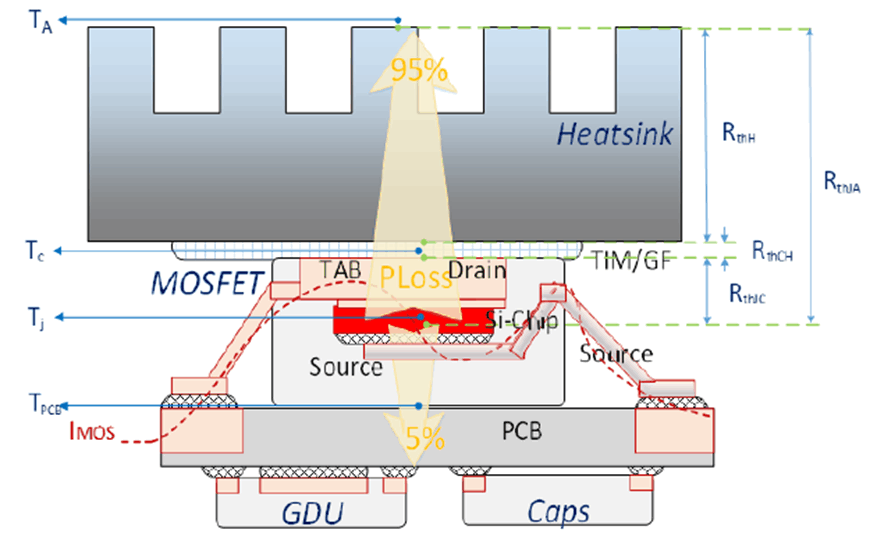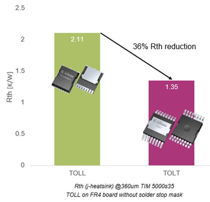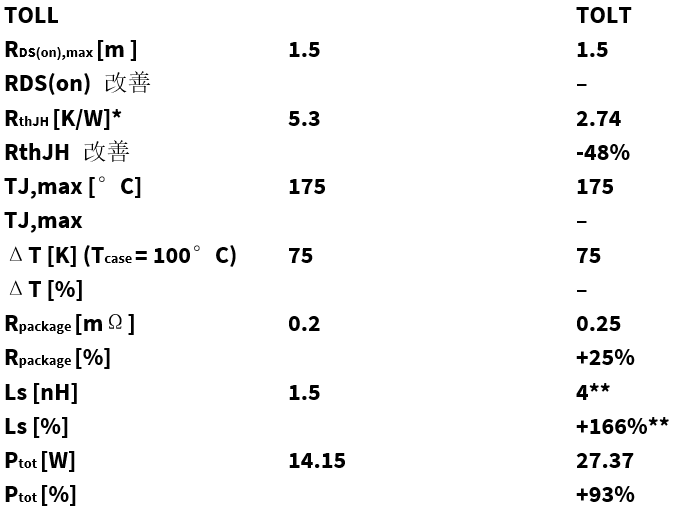 {本文由家电维修技术论坛小编收集整理资料}近年来,工业应用对MOSFET 的需求越来越高。从机械解决方案和更苛刻的应用条件都要求半导体制造商开发出新的封装方案和实施技术改进。从最初的通孔封装(插件)到 DPAK 或 D2PAK 等表面贴装器件 (SMD),再到最新的无引脚封装,以及内部硅技术的显著改进,MOSFET 解决方案正在不断发展,以更好地满足工业市场新的要求。本文介绍了 TOLT 的封装方案、热性能和电路板的可靠性。 关键特性,主要优势和应用 目标应用市场 英飞凌公司的 TOLT(JEDEC:HDSOP-16),封装OptiMOS™ 5 功率 MOSFET,有助于实现非常高的功率水平。由于通过顶部冷却改善了热阻,TOLT 可以在不增加器件数量和系统尺寸的情况下满足功率要求高的应用需求。因此,TOLT 封装的重点应用是大电流应用。该封装适用于功率水平高达 50 kW 的大功率电机驱动器,具体应用如下: 图1 具体应用 封装设计 新 TOLT 封装的概念不同于标准的底部散热功率 MOSFET。在 TOLT 中,封装内的引线框架倒置,漏极焊盘(芯片底部 = 漏极连接)暴露在封装顶部。图2 为带有倒置引线框架的封装的侧视图。 图2 TOLT 侧视图 封装外形 图3 和图4 为栅极、源极和漏极引脚。一排八个引脚连接到顶部的裸露焊盘,以与电路板进行漏极连接。在封装的另一侧,一个引脚用于栅极控制,其余七个引脚连接到电流源极。 图3 TOLT 3D 视图 图4 TOLT 底视图 图5为 TOLT 封装尺寸细节。两个方向的高度容差都保持在±0.05 mm。负引脚本体高差的容差为 0.01 至 0.16 mm。 图5 尺寸图 TOLT优势和准则 顶部散热不仅可以获得更高的应用功率,而且还有其他几个重要优势。在标准散热方案中(图6),散热器通常安装在 PCB 下方。从芯片到外部的热传递路径如下:这种解决方案的缺点是热性能降低,具体取决于 PCB 和 TIM/导热膏参数。这些组件的导热性差可能会导致过热和应用功率降低,还可能意味着需要更高的散热成本。此外,组装板需要承受更高的温度,这就需要使用更昂贵的 PCB。 图6 背面散热方式中的热路径 而得益于顶部散热方案(图7),热路径可以显著缩短:通过消除热路径中的 PCB 和焊料互连来减少热路径对 MOSFET 性能有巨大的影响。 图7 顶部散热方式中的热路径 英飞凌研究了这两种解决方案比较: 1.依托顶部散热设计,漏极暴露在封装表面,显著降低管芯和散热器之间的热阻,可将 95% 的热量通过散热器传递,只有5%通过PCB传递(图8),诸如 TOLL 或 D2PAK 等底部散热型封装(图9),其热量均通过 PCB 传导至散热片,从而会导致功率损耗较高。 图8 图9 2.SMD组件可以放置在PCB底部的TOLT MOSFET下方(图10),以优化可用面积; 图10 TOLL & TOLT 散热示意图 3.TOLT增加电流/功率处理能力,相较于 TOLL 封装,TOLT 封装的 RthJA 降低了 20%,RthJC 改善近 50%, Rth(J-heatsink) 降低了36% (图11)。 图11 4.额外优势 除了可以为散热系统实现更高的功率密度或节省成本外,TOLT 产品还有其他优势。以下是一些示例: ● 由于散热器没有安装在 PCB 下方,也没有热量通过 MOSFET 底侧传递到电路板,因此栅极驱动器或电容可以放在 PCB 的另一侧。这样的解决方案能够更有效地利用 PCB 空间。 ● 增加爬电距离(源极和漏极电势之间的距离)。 ● 可以使用具有较低玻璃化转变温度的 PCB。 ● 传递到 PCB 和附近组件中的热量更少。 5.热界面材料厚度 为保证 TOLT 封装的最佳热性能,并保证封装尽可能低的热阻,优化 TIM 厚度就显得至关重要。英飞凌为 TOLT 封装模拟了几种不同 TIM 厚度的情况(图12),从而分析其对从结到散热片总 RTH 的影响。在模拟中,散热片温度固定为 85°C 的环境温度。 图12 为 Rth 对于不同 TIM 厚度的 TIM 热导率的相关性 从图中可以看出,TIM 越薄,热阻越低。但是,应注意 TIM 的热导率 (λ) 值。更好的热导率补偿了 TIM 厚度的负面影响。 市场上现有的 TIM 的热导率通常在 3 到 6 W/mK 之间。为了达到最佳的热性能和足够的电隔离相平衡,系统工程师应优化 TIM 的厚度和热参数。下表为一些目前市场上现有的 TIM 示例。 客户最常用且在市场上广泛使用的材料是热导率在 3 至 4 W/mK 范围内的 TIM。根据对该值的仿真,MOSFET 结和散热片之间的热阻在 0.8 和 3K/W 之间变化,具体取决于 TIM 厚度。实际 TIM 厚度为 300 至 500 μm 时,热阻值可达 1.5 至 2.4K/W。当 Rth 等于 2.4 K/W 且 MOSFET 结与外壳之间的温差为 90°C(假设 Tcase = 85°C 和 Tjmax = 175°C)时,单个 TOLT MOSFET 可消耗大约 40 W 的功率。 6.电参数 TOLT 封装中的 MOSFET 具有与相应 TOLL 部件相同的 RDS(on) 值。例如,采用 TOLT 封装的出色的100V MOSFET(IPTC015N10NM5) 和相应的TOLL(IPT015N10N5),RDS(on),max 均为 1.5 mΩ。 参数比较:TOLL vs. TOLT 与 TOLL 相比,在带过孔的普通 2s2p 电路板和 85°C 的环境温度条件下,TOLT 的最大改进之处在于结到散热片的热阻 Rth 明显降低。Rth 降低了近 50%,这会导致总耗散功率提高 90% 以上。 TOLT的电路板可靠性 所有 SMD MOSFET 的另一个重要方面是不同应用条件下的电路板的可靠性。在苛刻的工业应用中使用这些 MOSFET 会使部件承受巨大的机械应力。用于评估 PCB 上封装可靠性的最常见测试是板上温度循环 (TCoB) 测试。TOLT 封装的散热片安装在封装顶部,因此还必须研究该部件可以承受的最大机械应力。 1. 板载温度循环可靠性 电子元件在工作期间会暴露在不断变化的温度下,这会导致材料膨胀。每种材料都有其自身的热膨胀系数,如果应力足够大,热
