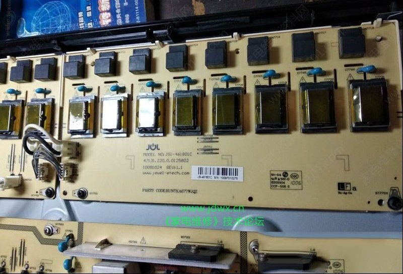 收到同行送来的故障机壹台夏普LCD-46G100A液晶电视,故障表现为插电红色指示灯亮,二次开机后,蓝灯亮,图声正常,4-5分钟后黑屏有声,然后又有图,然后又黑屏,三次后,待机红灯亮,为待机状态。按照网上老师们的方法,在R7794(82K)上并一支100K电阻后,试机正常。 |