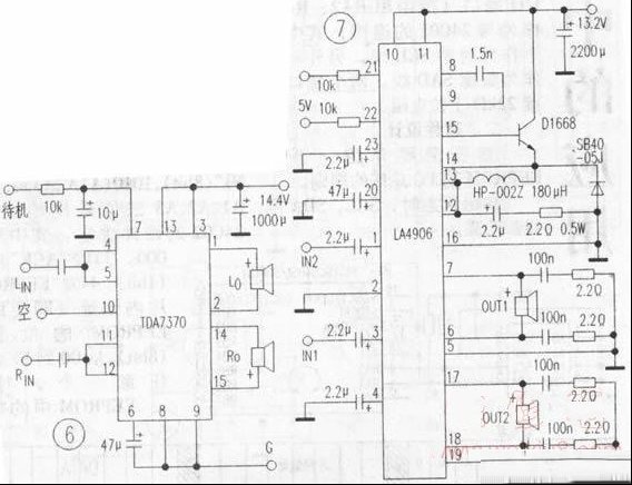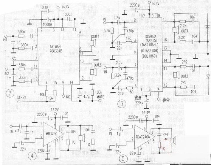 | 本文就车用收放机故障率最高的功放部分,结合本人实测和搜集资料对这 类IC作一专门介绍。 1.品牌机的专用lC 图1是日本先锋公司汽车音响专用功放IC PAL006A(实测机型DEH-P3300),该IC采用MOSFET输出级,25脚单边双列锯齿型封装,内含4组BTL功放,最大功率50W×4。图2是阿尔派公司(ALPINE)为福特汽车制造的Ford XLIF-18C870-ED收放机的功放级。IC为PHILIPS 70039AB型,17脚单边双列直插式封装,内含2组BTL电路。在日本歌乐公司的clarion Addzesl收放机中也有使用。 2.广泛使用的TA8210AH-TA8215L系列BTL立体声IC 如图3,其中TA8210AH为17脚单边双列锯齿形封装,TA8215L为17脚单列直插式。 3.单声道BTL专用IC MB3730(单列7脚直插式)在丰田面包车及一松下收放机内常有应用,图4实测机型为TOYOTA1806。 4.其他BTL专用IC(见图5-图7) 有些品牌的专用4声道BTL功放Ic(例如图1的PAL006A,还有类似的PAL005A)同市面的流通品TDA7382基本相同,可互换。另外新型车用音响的高密度装配工艺(例如图2“Furd”福特机XLIF的主电路板是采用厚度为1.8mm的双面双夹层即“四面敷铜板”),这就使得维修时对线路的跟进更困难。希望本文对读者有所启发,由于大部分原理图是根据实物测绘昕得,错漏之处希望指正。 |