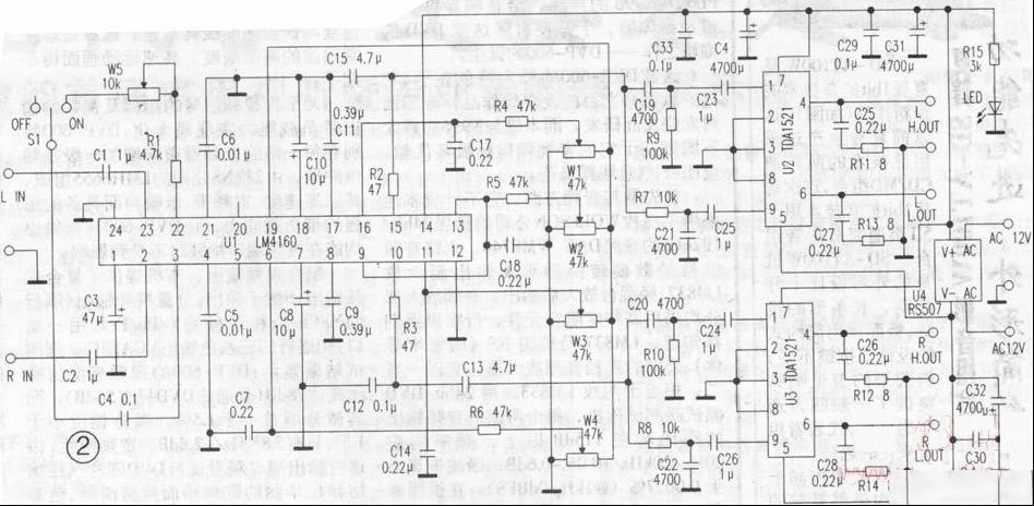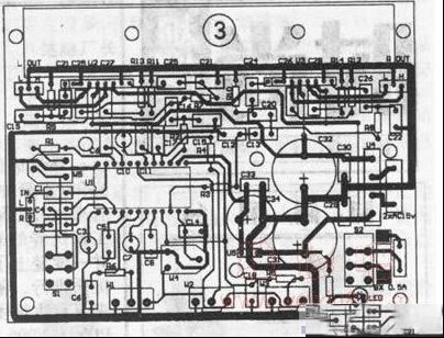 | 一、制作方案 1.前置放大部分采用集成电路LM4160。该集成电路为新一代音调控制IC,其内部除了具有性能优异的直流电压控制高低音调、平衡、音量功能外,还具有高品质的小信号前置放大与3D环绕声场处理功能。 2.功率放大部分采用集成电路TDA1521。该集成电路的主要优点是失真小、外围元件少、使用方便等。其最大输出功率20w,用于多媒体有源音箱应该是最佳的选择。 3.高低音分频采用无源电子分频电路,其目的是减小失真与提高音质。 4.音箱系统采用15mm厚的中密度纤维板打制。扬声器采用上海银笛扬声器厂产品,高音单元为YDQG4-7,低音单元为YD120-19,其目的是提高放音还原质量。 5.电源变压器采用50w、双12V的环形变压器,其目的是减小体积和提高效率。 6.将变压器和放大电路置于箱体之外,其独特的结构将有利于散热、减少干扰以及便于维修。 二、电路原理图与印制电路板图 电路原理图如图2所示。 在电路中:s1为3D声场控制开关;w1为低音调节电位器;w2为高音调节电位器;w3为音量调节电位器;W4为声道平衡调节可调电阻;W5为3D效果调节可调电阻;LED发光二极管为电源指示。L IN和R IN分别为左右声道的输入信号端;L H.OUT和L L.OUT分别为左声道的高、低音输出端,分别接至左音箱的高、低音扬声器;R H.OUT和R L.OUT分别为右声道的高低音输出端,分别接至右音箱的高、低音扬声器;两组AC12V为交流12v电压,三个端子对应接于电源变压器次级双12V的三根输出线。 印制电路板图如图3所示。采用100mm×130mm的单面敷铜板按图进行制作。该音箱的实际制作尺寸及元件安装位置见图1所示,可供音响爱好者参考。 信号输入线采用1.5米长的双芯屏蔽线,一头焊在电路板上信号输入端,另一头焊上φ3.5mm双芯插头与电脑连接。 |