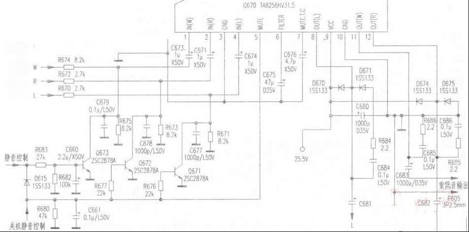 | TA8256HV是日本东芝公司的一款三通道(每通道10W)音频功率放大器。 内置三路放大电路及静音环路。具有工作电压范围宽(15V~35V)、失真度小(<0.5%)、噪音低、功率增益高(>30dB)等优点。其内部还有开关机静噪、静音控制、过压(>40V)、过热(>150℃)保护功能。 TA8256HV为12脚单列双排封装,主要应用于大屏幕彩电中作R、L路音频功率放大和w路(重低音)功率放大。附图是TA8256HV在长虹G2966(NC-6机心)彩电上的应用电路。附表是TA8256HV各引脚功能及在路实测数据,供参考。 TA8256HV引脚功能与实测数据(在长虹G2966彩电上用杭州U201型万用表测出) |