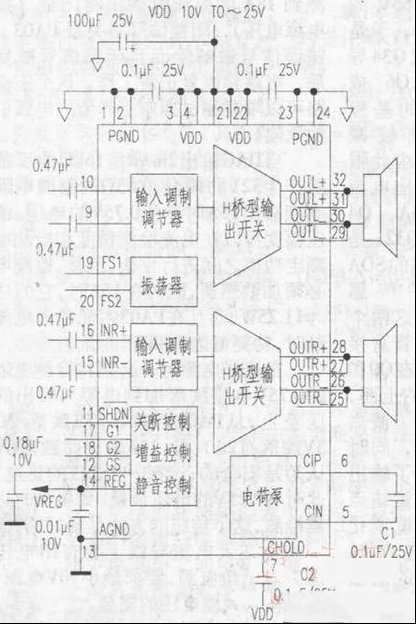 | MAX9704是美信公司推出的不需输出滤波器、具有扩频功能的双通道D类音频功率放大器集成电路,在提供2x15W功率时效率高达78%,具有80dB的高PSRR,0.07%的低THD+N,超过100dB的SNR,有短路与热过载保护,采用32引脚TQFN(7mm×7mm×0.8mm)封装。引脚功能见附表。 MAX9704的典型应用见下图。 1.固定频率调制(FFM)模式 MAX9704具有三种不同开关频率的FFM模式。在FFM模式下,D类放大器输出频谱由开关频率基波及其相关的谐波组成。MAX9704允许开关频率变化±35%,会有一个或多个谐波频率落入敏感频段。这种变化可以在任何时间进行,不会影响音频信号的恢复,根据不同应用场合选择不同的调制频率,可以有效地避开可能产生干扰的敏感频率。 2.扩频调制(SSM)模式 这种模式将宽带频谱成分展平,降低通过扬声器或电缆辐射的EMI,通过设置FS1=FS2=H来实现。在SSM模式下,开关频率在中心频率(670kHz)附近随机变化±7%。调制方案不变,但三角波的频率随周期改变。此时能量分散到随频率增长的整个频带上,而不是将大量频谱能量集中在开关频率的倍频处。在高于几MHz的频带上,EMI等效于宽带频谱的白噪声。 3.关断模式 将/SHDN引脚置为低 电平时,器件进入低功耗(0.2uA)的关断模式,可以降低功耗并延长电池寿命。标准模式下,将SHDN连至逻辑高电平。 4.杂音抑制和静音功能 MAX9704提供全面的杂音抑制,消除上电/断电或关断/打开过程中的瞬态噪音。另外,将SS下拉至GND,MAX9704则进入具有无杂音的静音模式:输出开关停止动作(而不是关断该器件),使扬声器静音。 5.差分输入与单端输入 MAX9704采用差分输人结构,可以有效地降低共模噪声的拾取,并提供比单端输入放大器更佳的噪声抑制能力,也可以不加输入耦合电容。 MAX9704也可以配置为单端输入放大器,只要通过电容将任一输入端耦合至GND,并驱动另一输入端即可构成单端输入的同相或反相放大器。 6.不需输出滤波器 MAX9704不需要输出滤波器,而是利用扬声器线圈自身的电感和扬声器与人耳的天然滤波作用,从方波输出中恢复音频成分。 |