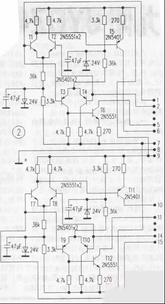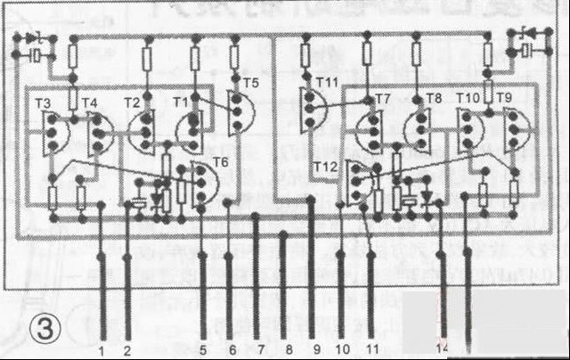 | 该机采用的是厚膜块与晶体管混和组成的主功放电路,如图1所示。厚膜电路是STK3062,分析该厚膜块相当于两个声道OCL功放电路的差动输入级和电压放大级。①脚和15脚是左右声道输入脚,②脚和14脚是反馈输入脚,③、④脚和12、13脚是内部恒流源外接RC端,⑥、⑤脚和⑩、11脚是两声道的正负输出脚,⑦脚是负电源输入脚,⑨脚是正电源输入脚,⑧脚接地。其后边是由达林顿管D1508构成的恒压偏置,C2240、D3298、A970、A1306组成复合电流放大电路,由一对东芝管C3280、A1301作功率输出。 接上信号源,用示波器检查可看到音频信号已送到STK3062的①脚和15脚,其⑥脚和⑤脚有放大后的波形输出,但⑩脚和11脚却无输出,只在强信号时有尖峰输出。用万用表测量⑥脚和⑤脚电压分别是正负1.7V,而⑩脚和11脚却都是正电压。在检查后级电路元件无损坏后,确定是STK3062损坏。在购不到该厚膜块时,可用分立元件组装电路来代换。 图2是组装电路的原理图,此电路采用全对称电路,T1、T2、T3、T4构成双差动输入级。为减少电压波动对输入级的影响,在T1、T2的e极设置了由3.3k电阻、24V稳压管、47uF电容构成的稳压电路,T5、T6是电压放大级,T7至T12组成另一声道。整个电路安装在一小块万能电路板上,如图3所示。按照STK3062的引脚间距在电路板上用裸铜线焊出引脚,③、④、12、13脚不用。为保证电路的对称性,三极管直流放大倍数要尽量一致,电阻也要用数字表挑选。将制作好的电路板安装在主功放板后,为避免后级功率管静态电流过大,可先将恒压偏置可调电阻调至最大,然后通电调试,使功率管b—e结电压达到0.5V,中点电压基本为0V,即可接上音箱试听。经此法维修后的功放,音响效果基本上与原机无差别。 |