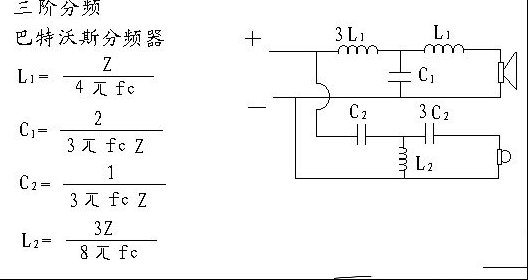 | 分频器英文为Crossover Network,直译应为“交叠网络”,中文已经约定俗成的译为分频器了。但我先前曾撰文提出异议,实际上,译为“分频器”对于实用来说并不是很贴切,或许“合频器”或“合成器”会更加贴切,当然分频器这种译法已经家喻户晓,已无可能改变。 为什么应该叫“合频器”而不是“分频器”呢?主要是由于虽然从电路上来看,是由高低过滤器构成似乎是起把高低频分开并分而治之的功能,但从本质上考究的话,其功能是把高低音(或者再加中音)单元有机地结合在一起,重放整个声频频带。(这也是由于目前尚无可能用一个单元很好地重放整个20-20K声频频带的条件下,不得已而为之的办法)? 虽然“分频器”还是“合频器”只是一个名词,但关键是要点明其真正的功用。几年来由于“分频器”这个叫法,使得大多数人自然而然地将“分频器”的功用,理解为把高低频分开,而体会不到其本质的功能是将高低单元结合为一体,从而导致对于低阶分频还是高阶分频好这个问题长时间的纠缠不清。 笔者先前提出的阴阳调和的观点,在哲学的层面上分析了分频器的功用,也即:高低音单元好似阴阳对立统一的关系一样。有其对立的一面,而通过分频器又有机地统一为一个整体,合二为一,而分频器的功能就是分而治之,达到阴阳交融之目的,故从其目的来说,“合成器”或“合频器”反而会更贴切。 开宗明义地谈了以上这么一大段哲学,和分频器的功用,并不是无谓地空谈,而在于明白了分频器的本质以后,就可以很好地掌握分频器整体设计这个关键。 分频器的整体设计是指高低音滤波器的分频点与阶数的选取,首先综合考虑高低音单元的幅频承受功率与失真度以及指向性来选取分频点。一般原则是首先考虑高音,选取分频点以三倍或四倍于的高音单元的谐振频率为佳,这样可以有效地避免高音单元过载,声音“发破”甚至烧坏高音。并且,选取的分频点越高,采用低阶高通分频的可行性越大。 其次考虑低音单元,一定要选取在幅频响应的平坦区内,一般情况下,幅频响应开始下降的频段意味着分割振动等不良因素开始作用,失真度等也会较大,一般以留有一定的平直频段为佳。 除了根据单元选取以外,决定分频点还有一个原则就是均衡原则,选取分频点不可使某一单元的负担相对太重,比如两分频的话,如选分频点在5KHz的话,则高音仅承担5-20KHz,二个倍频程,而低音单元以50Hz起计就有六个多倍频程,这样低音单元负担过重,并且互调失真会明显加大,一般来说,两分频时分频在3K左右,高音单元较差时取3.2-3.5,高音单元质量好,谐振频率低时可以取到2K附近。 对于三分频来讲选取分频点是非常考究的。其中一个重要原则是:两个分频点之间的距离足够大,高档音箱一般取10倍为宜,如300与3K、500与5K,这是为了避免两个分频点互相干扰打架,一般性的音箱也至少建议5倍以上。 笔者是主张低阶设计的,但不一定是越低阶越好,前面已经讲过是以分而治之的手段,达致阴阳融合之目的。分而治之就是把高低音单元的互相不协调的部分和缺点去掉,保留各自的优点,以达到互补融合之目的。所以说最理想的是找到两个单元,可以不用分频器(零阶分频器),而能互补调合,当然这在实际上是不太可能的,实际中只可能根据所选取的单元取较低阶的分频器,具体讲,首先是依据所选取高低音单元选取一个合适的分频点,一般在2-4KHz之间,然后根据低音单元在分频点以上部分的频响曲线,相位响应,失真度等来决定低音滤波器的阶数。如果分频点以上频段响应较差、不平坦、失真度过大的话,就需要用二阶或三阶滤波以将影响尽量降低,如果分频点以上该段频响很好的话,就尽量用一阶,以达到高低音阴阳调合的最佳效果。 高通滤波主要考虑高音单元的谐振频率,幅频响应特性,功率承受,失真度等问题。如果谐振频率低于分频点两个倍频程以上,而高音单元的功率承受与失真度特性都较好时,优选一阶滤波,否则只能选用二阶滤波三阶滤波,单元越差,阶数越高。 以上只是大致定了一个范围,并且是高低音孤立地分析的,考虑到要使得整个音箱的相频响应的平直,不能不考虑相位设计,也即通过实测高低音单元的相频响应,以分频频率处两者的相位差,来进一步决定高低滤波的最终阶数,和高音单元的接法(反相亦或同相),实际上讲穿了就是一句话,目的就是使高低音单元间在分频点处的相位差为0º或180º。这样高音单元同相接法(对应于0º),或反相接法(对应于180º),即可达致分频点处相频曲线的平直。而滤波器的所引起的相移可视为±n(π/2),其中n是滤波器的阶数,而低通取正,高通取负。当然这只是一个粗略的概念,实际上由于单元的阻抗的复杂性,上述的±n(π/2)并不是准确的数值,必须根据实测的相频响应为准。 根据以上原则确定了分频点与各个滤波器的阶数以后,就可以进一步设计各个滤波器的组成了,以下公式可供参考。 上述公式仅供参考,实际使用中需要根据单元的特性以及单元相互间的水平及垂直距离而调整。根据前文已经提到,由于要考虑到相位设计,以及考虑到分频点附近幅频响应曲线的上升或下降,并不是一定是高低通用同阶滤波器的。 并且即使用同阶的高低通滤波,也要根据需要进行灵活的调整。以二阶分频来说,即使单元的相频响应、幅频响应极佳,不需要考虑的话,也需要根据经验对上述
