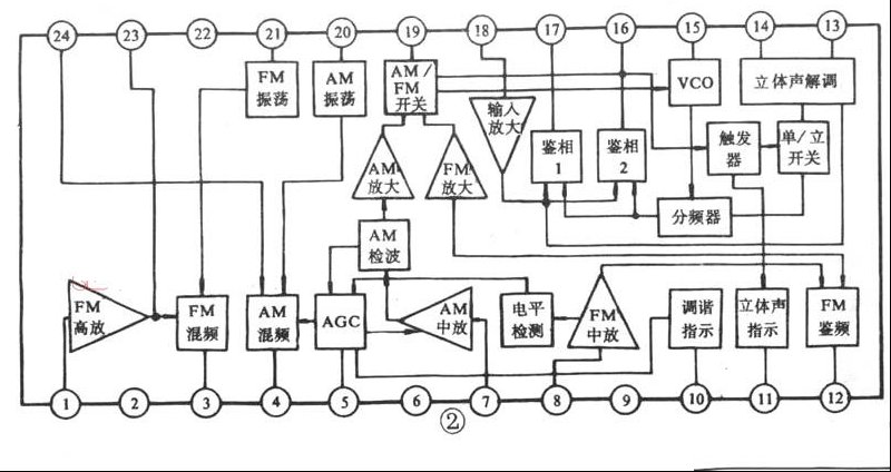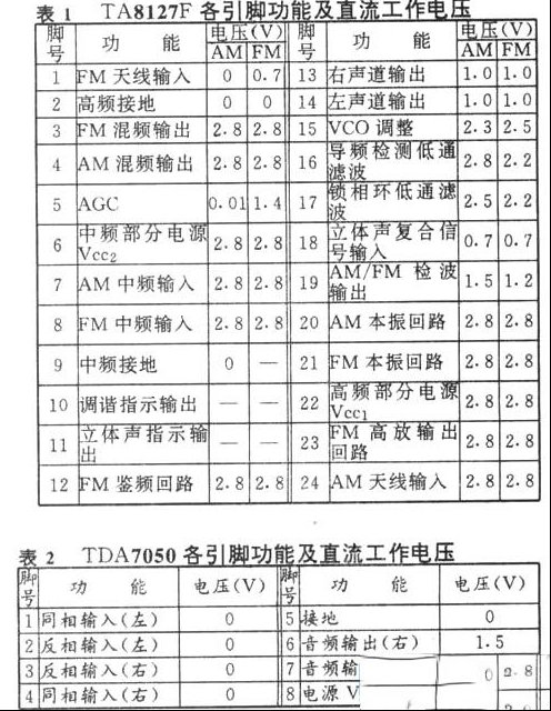 | 迪桑牌R-707AM/FM是广州迪生电子有限公司生产的一款立体声收音机,款式新颖,流线型机身配以皮带夹,携带方便。收音机的立体声耳机插座兼FM外接天线接口。不插耳机时为机内扬声器放音,此时为提高FM广播的收听效果,可插上随机附带的FM天线;插入耳机后,机内扬声器自动断开,耳机线代替了FM天线。 市售R-707不带电路图。笔者根据实物检测和参阅有关资料,绘出整机电路原理图(见图1)。 该机主要由日本东芝公司生产的AM/FM单片立体声收音机集成电路TA8127和飞利浦公司生产的小功率双功放集成电路TDA7050组成。TA8127F是收音机专用集成电路,其内 电路框图见图2。 它内含调幅混频、本振、中放、检波、AGC;调频高放、混频、本振、中放、鉴频、立体声解调电路等。附属电路有调谐显示驱动、立体声指示驱动、AM/FM切换开关等。其各引脚功能及静态直流工作电压见表1。该集成电路工作电源电压范围宽,VCC=1.8~8V,功耗小。在3V工作电压下,FM状态时小于60mw,AM状态下小于。40mw。由于TA8127F内部不具有音频功放电路,因此需外接一只双功放集成电路。这里采用的是TDA7050集成块,它体积小,为8脚双列扁平塑料封装,各引脚功能及静态时的直流工作电压见表2。TDA7050所需外围元件甚少,在电源电压3V、耳机阻抗32Ω、失真度10%时,输出功率为35mW;用机内扬声器放音时,为BTL工作状态,输出功率为140mW。 |