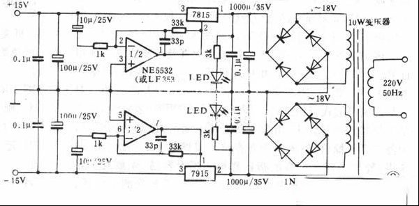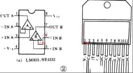 | 单片集成功率放大器LM3875(及LM3876)它是发烧友所熟悉的LM1875升级产品,具有很高性能指标。它在20Hz~20kHz频率范围内,在负载为8Ω时,可连续输出40W以上的平均功率,但谐波失真(THD)只有0.05%。另外,芯片内部具有完善的过压、欠压、过载、电源短路、热击穿以及瞬时高温冲击等保护功能,性能优于一般分立元件和混合器件组装的放大器,而且外围电路简单,装配方便。 为了制作收到其他维修同行的一台音色好的合并式集成电路放大器,笔者选择了LM833做LM3875的最佳搭配。由单片集成电路构成的合并式放大器整机电原理图如图1所示。 LM833的电气特性(TA=25C,Ve=±15V)见表2。LM3875和LM833的引脚功能见图2。 一、元器件选择 功放LM3875及前置LM833均用美国NSC公司原装芯片,质量上没有问题。关键是周边元件的品质对音质起很大影响。耦合电容对频响低端和高端均有影响,故C3选用日本松下公司或ELNA公司产无极性铝电解电容,再并联上一只小容量无感CBB电容以通高频。有条件者C3可选用法国SOLEN 4.7uF/400V金属化聚丙稀电容。功放整流部分采用6A/400V整流管做低噪声双桥式整流,功放级滤波电容对音质影响较大,采用两只日本“木石”(marcom)或“红宝石”(Rubycon)10000uF/50V电解电容,其它电解电容采用日本“木石”(marcom)牌即可。无极性电容均采用北京无线电元件二厂进口线产无感CBB电容。前置部分采用1/4瓦金属膜电阻,功放部分采用1/2瓦金属膜电阻。L1用直径1mm的漆包线在铅笔上密绕10圈脱胎而成。电源变压器选用150瓦以上E型或环形变压器,次级输出必须采用双线并绕,否则可能内阻不一致,导致放音效果变差。 |