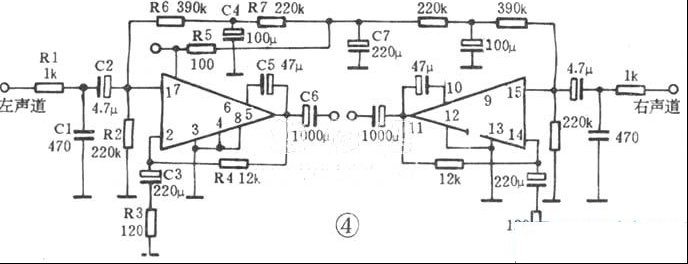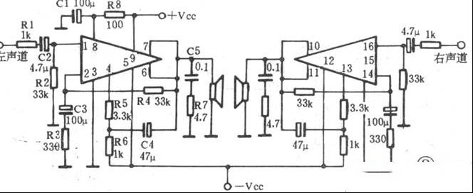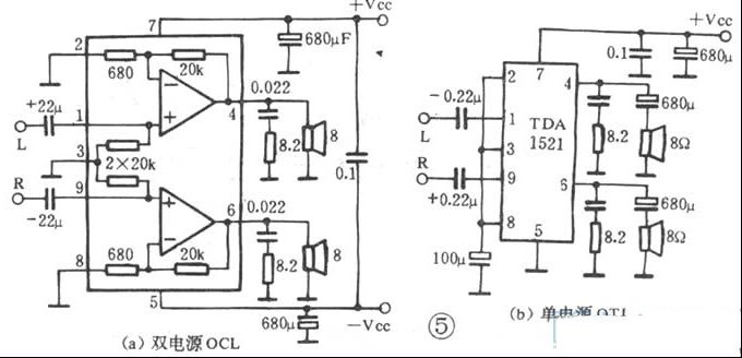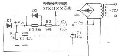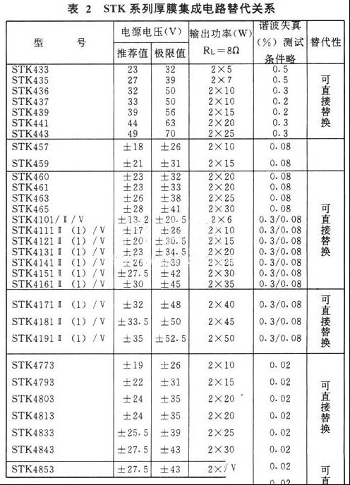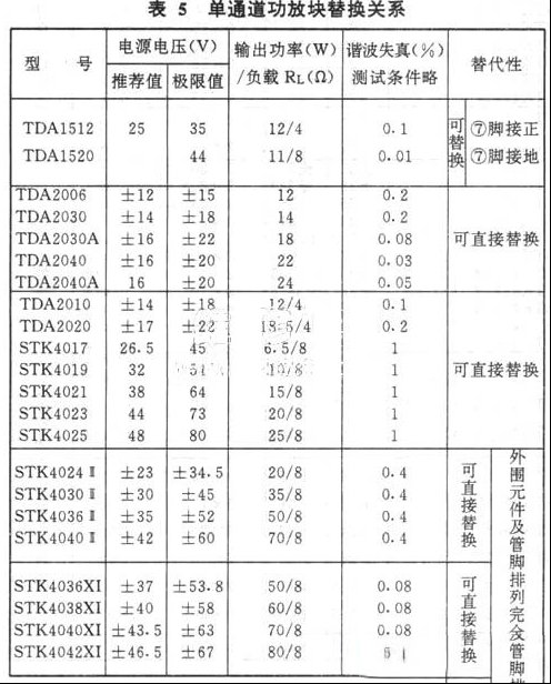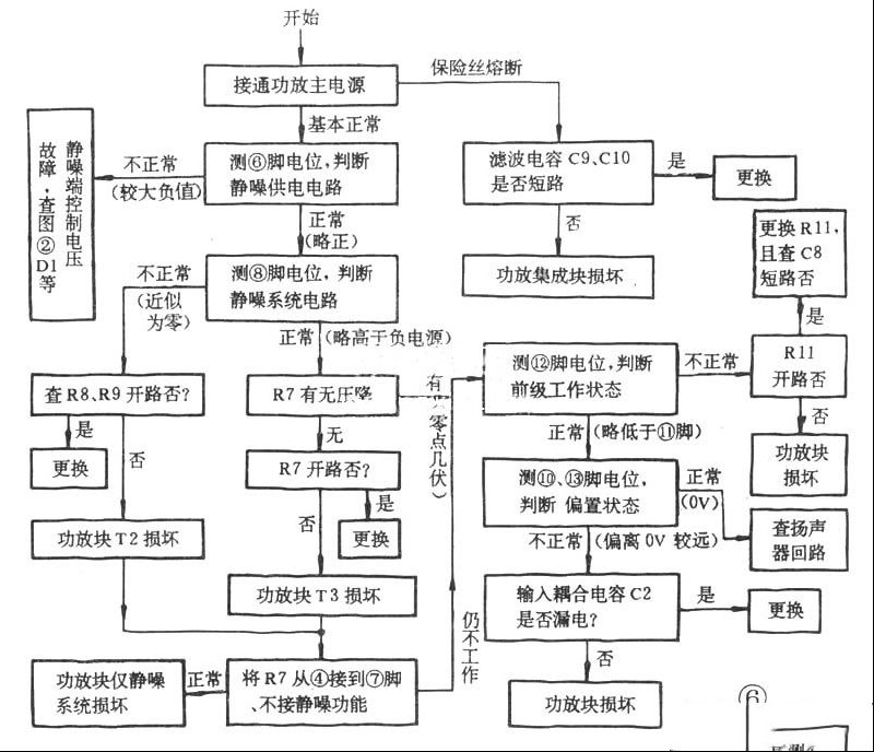 | 组合音响内部电路的功放级消耗功率最大,大电流及较高电压使该电路元器件的负担颇重。再者,市售音响功率都标记为峰值功率,这比正常最大功率大5~10倍,稍有不慎,功放块极易损坏。本文从原理着手,较系统地介绍组合音响功放部分故障的判断、检测和维修的规范步骤,希望对读者有所启迪。 市面上流行的组合音响及功率不大的带卡拉OK机的功放部分大都采用音频厚膜集成功放电路。这种集成块体积小、功能全、电特性优良,且元件一致性好,安装调试方便,故障率又远比分立元件为低,因此得到广泛采用。其中,日本三洋公司的sTK系列厚膜集成功放电路用得最为普遍:进口的日本先锋、山水、索尼等组合音响及国产星河、华强等都采用这一系列集成块。国产组合音响用的功放块较杂,除sTK系列外,还有飞利浦公司的TDA、日本电气公司的uPc系列芯片及国产同型号集成块。尽管种类很多,但功放集成块的内部结构大同小异,外接元件也很有规律,仅是功率大小及引脚排列、多寡不同而已。搞通一种就能触类旁通。 一、功放集成电路原理及标准接法 1.STK4101Ⅱ/V~STK4191Ⅱ/V 本系列功放块为双通道、双电源供电,内含静噪功能。其中,V系列性能指标较Ⅱ系列为高,但Ⅱ系列应用却非常广泛。 图1为简化的sTK41xx系列集成功放块的内部结构和典型外接电路。 图中标准的双端输入、单端输出差动电路,前置推动放大电路和复合互补推挽电路均用方框表示;T1和T1’为差动放大电路的恒流源管,向差动电路提供偏置电流;T2为静噪管,T3为静噪电路中的偏置控制管。其外接元件功能如下。 R1、C1为输入滤波元件,用于滤除高频噪声和外来干扰。C2为隔直电容,R2用来调整放大器输入阻抗,以期与前级匹配。R3、R4、C3构成集成功放级的交流负反馈回路,c3隔去直流。R4和R3决定功放级增益,维修替代时必须保持这两个电阻的比值不变,否则整机增益指标将发生变化:比值变小则功率输出不够,变大则有可能毁机或毁扬声器。R5、R6、c5用于改善放大器瞬态响应,实质是一个正反馈回路,用于克服深负反馈对高频信号的滞后作用,改善高音音质。R5、R 6阻值不当或变值,会引起失真。 R7、R8、R9和C6为静噪电路外围元件。负电源-Vcc经R9、C6滤波后,经R8接到⑧脚即静噪管T2的集电极及偏置控制管T3的基极。T2的发射极由③脚接地,电位为零。正常工 作时T2基极接⑥脚即静噪控制端,需外加略正电位,使T2管截止。⑧脚仅有T3基极偏流,R8、R9上几乎没有压降,⑧脚电位略高于负电源电位,T3导通。恒流管T1发射极经过发射极电阻一④脚一R7一T3一⑨脚一-Vcc,前级差动放大获偏置正常工作。若⑥脚为负电位,静噪控制管T2导通,T3基极通过T2接地,电位高于T3发射极电位,T3截止。恒流管T1随之截止,差动放大级无偏置电流,停止工作。 接到⑥脚的静噪控制电路见图2。负电源-Vcc由桥式整流器产生;正电源+Vcc通过D1、R1、c1从同一绕组上半波整流获得。+Vcc与-Vcc电压值基本相等,经R2、R3和R4分压获得1v左右正电压,使全电路正常工作。当交流电源切断时,由于c1容量较小,正电压先于负电压消失,这相当于调小音量后再关机,抑制了电源切断时的冲击噪声。 图1中⑩脚外接的c7、R10为相位校正元件,因扬声器为感性元件,需加容性回路加以校正。否则,电流突然切断会感应出高电压,可能会损坏功放块。同时c7还能对寄生高频加以旁路。R11、c8为差放及前放电源滤波电路,故12脚电位应略低于正电源。c4、C6、C9、c10都是电源滤波电容,若开路或容量减少,均会引起音质变坏或自激振荡,出现啸叫或汽船声。图1为0cL接法,故输入、输出电位基本为零,即①②17、18⑩13脚为零电位。 2.STK457/459/460/461/463/465标准接法 标准接法如图3。STK465系列也是双通道,双电源供电,与STK41XX系列集成电路比较,除了省去静噪电路的一批外围电路外,其他元件都一一对应。决定功放级增益的元件为R4与R3。 3.STK433/435/436/437/439/441/443标准接法 该系列标准接法如图4。它与STK465系列相比又少了几只改善瞬态特性的外围元件。另外,它是双通道、单电源供电,接成OTL电路,C6为输出隔直电容,⑤、11脚电位为1/2Vcc,输入端①②14、15脚不再是零电位,而由R2、R6、R7及c4分别滤波、分压后供电,以保证输出端为1/2Vcc。 4.TDA1521/A/AQ/BQ/B标准接法 TDA1521是飞利浦公司生产的双通道功放集成电路,其外接元件少,且含短路保护、过热保护和静噪功能,可自由接成双电源或单电源供电。外接端子仅有输入、输出及接地端。不同型号的外形封装不同,因此不能直接替换。 图5为TDA1521分别接成0cL和oTL的电路。该芯片的缺点是电压增益为固定的30dB,替代其他集成块时要注意。 二、功放级故障检测 音响集成电路功放故障检测主要判断两点:一是判断故障确实在功放级;二是判断集成块损坏还是外围元件故障。可分三步进行。 1.询问观察 询问故障表现为和故障前现象,这是至关重要的,切勿贸然通电以免扩大故障。开盖后检查有无开裂的三极管或集成电路,电解电容有无鼓涨、漏液或爆裂,电阻、二极管、三极管等有无烧焦变色的,引线塑料皮有否变形或粘贴上机壳。如有异常应先及时检测处理之。 2.通电检查通电时首先检查保险丝。不少音响设备有两级保险丝:总电源交流保险丝1~2A,置于变压器初级回路上;直流大电流保险丝5A左右,位于主电源整流滤波级至功放的回路中。先将正负两路直流保