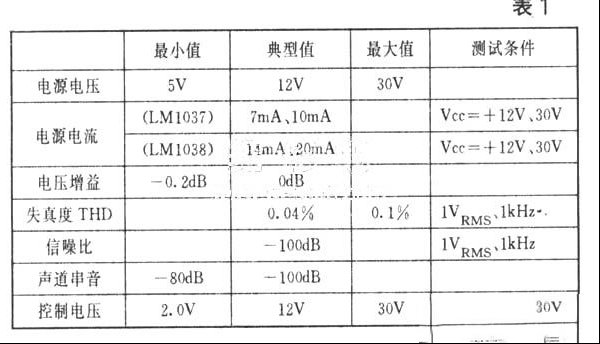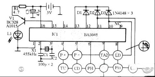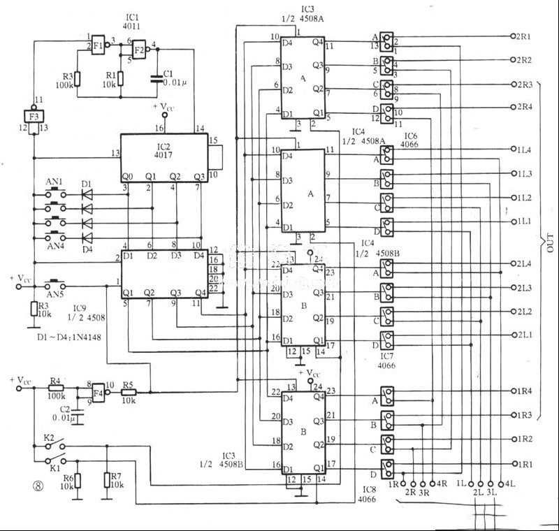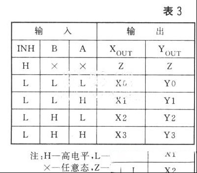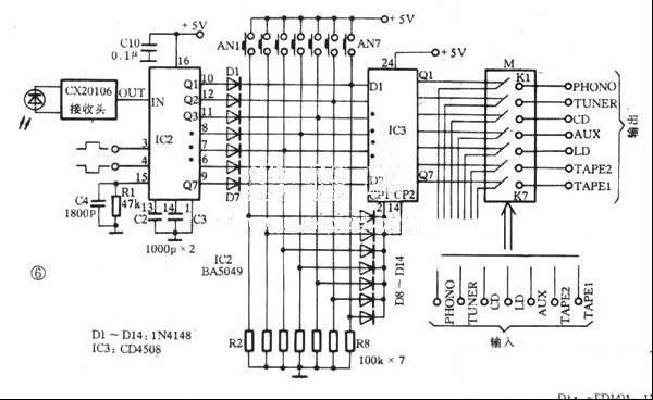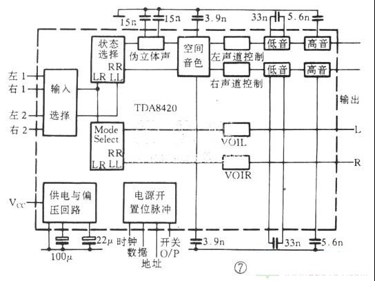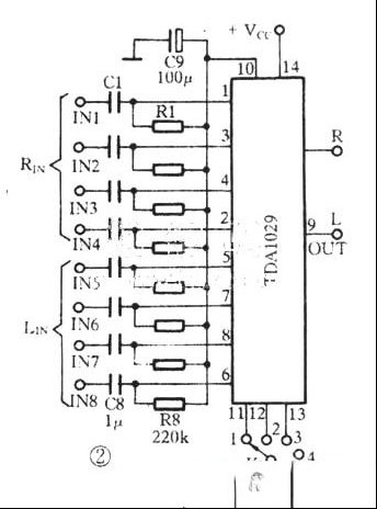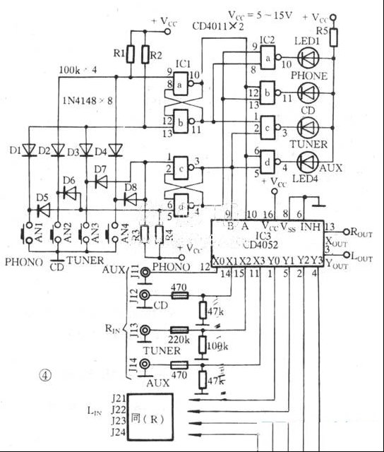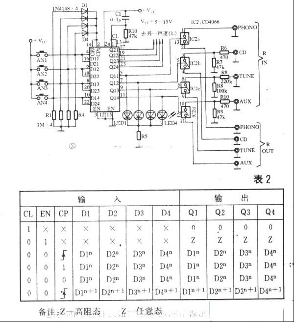 | 不少高档音响的音频切换、控制功能都是用轻触式电子开关IC完成的。电子开关不存在机械开关和电位器的接触不良问题及长信号屏蔽线引入的干扰噪声,因而性能可靠、寿命长。本文介绍六种音频电子开关电路,以满足音响爱好者及有关技术人员开发、改进产品的需要。 一、LM0037/1038四路立体声切换开关电路 LM1037/1038系18脚DIP封装的电子音频开关集成电路,其内部电路框图及基本应用电路见图1。 LM1037/1038内含逻辑控制、电子开关、缓冲、静音控制等电路,其外围电路亦很简单。LM1037/1038的②和④脚、⑥和⑧脚、11和13脚、17和15脚分别为四路立体声的输入端,①、③、16、18脚为开关控制端。LMl037高电平有效,LM1038为BcD码控制。控制端为高电平或BcD码时,把1R1L~4R4L 中任意一组输入信号切换到F4F5缓冲器,缓冲后分别从⑨⑩脚输出。例如K1接“3”端时,2R2L端输入信号切换至⑨⑩脚,其余端输入信号与⑨、⑩脚处于断开状态。 ⑦脚为静音控制端,高电平有效。⑦脚为高电平时,F4F5输入端分别被F3F2短路到地,⑨10脚无信号输出。Kl置空档“O”时,F1输出为高电平,F2F3短路F4F5的输入端,Ic也处于静音状态。 LM1037与LM1038的引脚功能、电参数均相同,区别仅在于控制端、前者为电平控制,后者为BCD码控制。 它们的主要电参数见表1。 二、TDA1029四路立体声切换开关电路 TDA1029的外围电路比LM1037/1038更简捷,仅三个控制端就能切换四路立体声。它虽然无静音功能,但失真度、信噪比等指标比LM1037/1038稍优越。典型应用电路如图2所示。 TDA1029主要电参数为:Vrr=6~25V,在20Hz~20kHz内典型失真度为0.01~0.03%,声道隔离度大于70dB(主要取决于外围元件),信噪比为12dB以上;输入电压最大为5.0V(RMS);可在低至400Ω的负载上获得电压增益为1,电流增益为10的五次方的信号输出;转换率为2V/us(1.3MHz)。 K分别接到1、2、3、4位时,INl和IN5、IN2和IN6、IN3和IN7、IN4和IN8端的输入信号分别切换到输出端。 三、轻触式四路立体声切换电路 图3为一例轻触式音频电子切换电路。 该电路由一块双四D锁存器4508和两块四双向模拟电子开关集成电路4066构成。4508的真值表见表2。4508的CP端在脉冲的上升沿作用下接收二极管D1~D4端数据,在高低电平期间接收的数据被锁存。cL端为“1”电平时无条件清零;EN=“l”电平时,输出Q1~Q4端为高阻态。这里cL和EN端不使用而接地。c1R1在开机时产生的脉冲用以对4508清零。 ANl~AN4为常开轻触式开关,任意按一下其中一个开关,例如AN3,+Vcc经AN3加至Icl的⑧、20脚,另一路径D2、加至Icl的②、14脚(cPl及cP2端)。在+Vcc上升沿作用下,Icl接收⑧、29脚数据(+Vcc),AN3松开后此数据被锁存,即Q13=Q23=“1”。Q23=“1”接通L声道电子开关;Q13=“l”使电子开关Ic2c导通,TuNE输入信号经R8、Ic2c送到TuNE输出端口。 图4为又一例轻触式四路立体切换电路。它是由4011及4052型CMos集成 电路构成的音频电子切换电路。4052的真值表见表3。 IC1构成二个RS触发器,若按一下AN1,则Icl⑤、13脚获瞬间低电平,输出端④、11脚翻转为高电平,Ic2a门⑧、⑨脚也为高电平,⑩脚变为低电平,LEDl被点亮,表明输入信号为PHONO;与此同时,Icl的③、⑩脚为“O”电平,即IC3的⑨、⑩脚为“00”电平,根据真值表Xout=X0,Yout=Y0,信号被切换到J11、J21输入端口。同理,按一下AN3,则信号被切换到J13、J23输入口。 四、遥控式音频电子切换开关电路 BA5048/5049为一对多通道遥控发射接收处理电路。5048为发射电路,5049为接收电路。 BA5048内含振荡器、分频计数器、时序脉冲发生器、驱动电路等。其应用电路见图5。②、③脚外接455kHz陶瓷振子,与内电路作用产生455kHz时基振荡信号,当任意按下一键时,键扫描信号经内部编码处理被调制在38kHz载频上,已调制信号从15脚输出,经V1放大后驱动红外发射管L1把信号发射出去。 接收与解调电路为大家熟知的CX20106A,此处简化成框图。cX20106A输出的数字信号送BA5049处理。原理如图6所示。 按下发射器上相应键后,Ic2的Q1~Q7相应的输出端输出正脉冲。例如,按一下cD键,Ic2 11脚输出一正脉冲,此正脉冲经二极管到IC3的D3端,同时也作用到cPl、cP2端。Ic3在其上升沿作用下接收D3端数据“1”,并在脉冲过去后锁存此数据,则有Q3=D3=“1”,M组件中K3接通,信号切换为cD信号。ANl~AN7为本机操作键,用于手动切换。这里M组件中K1~K7由用户自己选取,可以使用晶体管、继电器,模拟电子开关cD4066等,使用微小型继电器时,可以不失真地传送信号。 IC2还输出两个彼此反相的高低电平。按P+键,Ic2③脚为高电平,④脚为低电平;按P一键,③脚为低电平,④脚为高电平。③、④脚可用来控制电机的正转或反转等。 五、可与微处理器接口的音频切换与控制集成电路TDA8420 飞利浦公司的系列音频切换与控制Ic有TDA8420、TDA8425、TDA7300等,适合于与微机接口。图7为TDA8420的内部电路框图及基本应用电路。 TDA8420具有两路立体声输入选择、伪立体声、空间音色、高低音、音量控制等功能。上述功能的控制通过CLOCK、DATA、ADDRESS端与微机接口来实现。经过切换与控制处理的信号从L、R端输出。 六、多路输人/输出音频切换电路 上述介绍的几种电路均把多路输入切换到一路输出端,这在某些场合还不够用。图8为把多路音频输入切换到8路输出端口的一例实用电路。 ICl中的F1、F2两个“与非”门构成8kHz左右的振荡信号送入IC2 14脚(cP端)。IC2为时序脉冲分配计数器/十进制计数器,这里⑩脚Q4