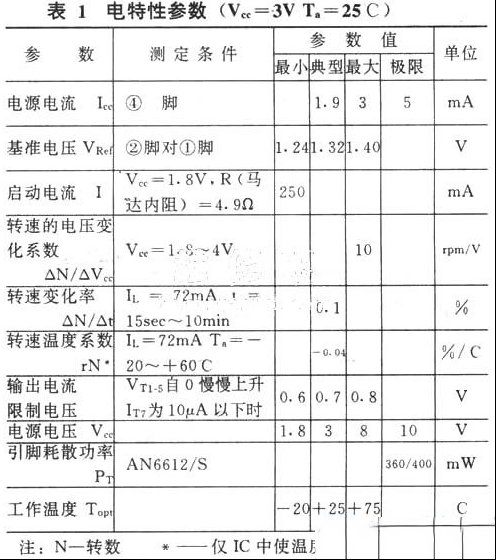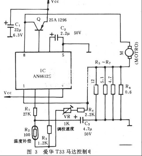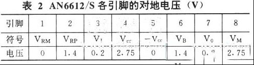 | 爱华J/T系列随身听是日本爱华公司的产品,轻巧而精制。具有电子开关控制与磁带自动反转、电台频率间隔扩展、自动搜索、预调与不同时钟设定、立体声音质优美,带杜比“DOLBY”噪声减低器、BBE多音响处理与超低音等功能,深受人们喜爱,社会拥有量很大。 爱华J/T系列随身听是日本爱华公司的产品,轻巧而精制。具有电子开关控制与磁带自动反转、电台频率间隔扩展、自动搜索、预调与不同时钟设定、立体声音质优美,带杜比“DOLBY”噪声减低器、BBE多音响处理与超低音等功能,深受人们喜爱,社会拥有量很大。 目前,市场上销售的多数为日本爱华公司机芯,但组装式“水货”也不少。不管是“J',机芯还是“T”机芯,电路连接形式和结构原理大同小异,马达控制电路基本相同,只要掌握了一种机芯马达控制电路的检修思路,其它的也就不难分析和检修了。 一、AN6612/s直流马达控制集成电路 T33随身听使用的AN6612/S直流马达控制集成电路,是日本松下(NATI0NAL)公司的产品,是微型马达转速控制的一种集成电路。该芯片能完成非线性的速度变化和线性的微调速度,低电源工作电压(1.8~8V)和低功耗(内含输出电流限制电路),常用于微型收录机中的马达转速控制电路中。 1.引脚排列与内部电路说明 AN6612/S为8脚扁平双列直插式塑料封装芯片。外形引脚排列如图1所示。④和⑤脚分别为正、负电源输入脚。工作电压范围较宽,可从±1.8V到±8V。③脚为稳定马达转速比较电压输入脚,外接马达负载电阻,用来设置加在比较器同相端的输入电压。②脚为基准电压输入脚,调整连接在该脚电路中的电阻,可改变基准电压的大小,用于调校马达转速。①脚为马达转速信号负输出脚。⑦脚为电流调节输出脚。⑧脚为马达转速信号正输出脚。⑥脚为Ic内部组合调节管偏置电压设置脚。用外接电解电容旁路形成正偏置直流电压。 AN6612/s内部电路框图见图2。该芯片内含电压比较器(Voltage Comparator)、基准电压形成电路(Ref.Voltage)、组合调节器(V1、V2)和电流源与启动电路(Start Circuit)等。 2.主要技术参数 AN6612/S电特性参数如表1所列。 3.在路直流电压 当直流电源电压为3伏,正常工作时,应放音(PLAY)状态下,用数字式万用表测得的AN6612/s各引脚对地直流电压值参见表2。因为随身听正常工作,允许电源电压有一定的波动范围,所以不同在路电源电压下测量的各引脚对地直流电压会略有差异。但各引脚的对地电压值与在路电源电压之间却存在着一定的内在联系。检修时,根据测出的各引脚电压大小与表2电压值比较,则不难找到故障的所在位置。 二、实用马达控制电路 爱华T33随身听马达控制电路原理如图3。图中Ic④脚和外接扩展驱动三极管Q发射级所加的工作电压+VCC由电源提。 马达稳速控制过程:当马达转矩电流增大时,串联在马达上负载电阻的电流增加,使IC③脚电压升高,AN6612/S内部电压比较器同相端输入电压增大,而②脚对①脚所设置的比较器的基准电压(加在V2管的基极)保持不变,经过比较、判定的结果使输出电流增大。v1管集电极电流也随之增大,外接Q管基极与集电极电流上升,导致马达转矩电流下降。反馈的结果,从Ic⑧脚输出的转速信号,可保持马达转速变化最小。同理,当马达转矩电流减少时,通过反馈作用,使比较器输出电流减少,导致马达转矩电流上升,而保证转速信号电流几乎不变。也能保持马达转速的稳定。 总之,稳速是通过反馈环路来实现的;从马达中流过的变化电流经过负载电阻,由IC中的电压比较器、电流调节器和外接扩展驱动电流三极管等电路调节控制马达转速的稳定性;从马达中引出的电流反馈信号同电压比较器等电路的输出信号相加,去补偿马达速度的变化,即达到用调节电流的方法控制转速的目的,又拥有快速瞬态稳速的特点。 在收录机中,马达速度控制是非常重要的。马达不转放音无声,转速不稳也会直接影响放音的音质和音色。 三、故障检修 先将音带装入T33机带仓盒中,再装入二节1.5V5号电池。把“TAPE与RADIO'’拨动开关拨到RADIO位置时,收音各波段均正常。拨到TAPE(即RADlO0FF)位置,并按下“PLAY”键时,放音无声,其它的操作功能全无效。说明马达不转。 先检查电源,用数字万用表测量电池电压为3V正常值(测量附加的外接直流供电器也正常)。检查内部电路,卸下随身听后盖三个螺丝,小心拨开后盖盒(注意不要把前机壳上的卡夹和后盖盒上拨动开关套卡拨钮弄断),便可看到印制板右下角的马达控制电路。仔细观察印制板表面焊点及器件,没发现异常现象。而后检查马达;马达内部短路或断路,内阻必然反常,测量马达内阻为4.5Ω,属正常值范围,表明马达没有问题。 再检查马达控制电路。先查Ic外围电路,测量外接电阻、电容和连接线通路均正常。再测量外接扩展驱动电流三极管Q(2SA1296)各极电压值:发射极2.8V、基极2.3V、集电极0V(这也是马达+端电压)。由于马达+端无输入电压,故而不转。有关2SAl296管主要参数见表3。怀疑2SAl296管不良,焊下后测量,be正向显示O.663,反向∞,bc间正向显示O.665反向∞,ec间正反间均为∞,经验证明此管良好,重新焊上。 在判定外围电路没问题的情况下,肯定是集成电路问题了。在放音的情况下,测量IC各引脚电压值:⑦脚为2.3V,④脚为2.8V,其它各脚电压均为0V(与表2比较),说明电源电压已加到IC上,可IC不能工作。显然,AN6612/S已坏。因该芯片体积很小(5×5×