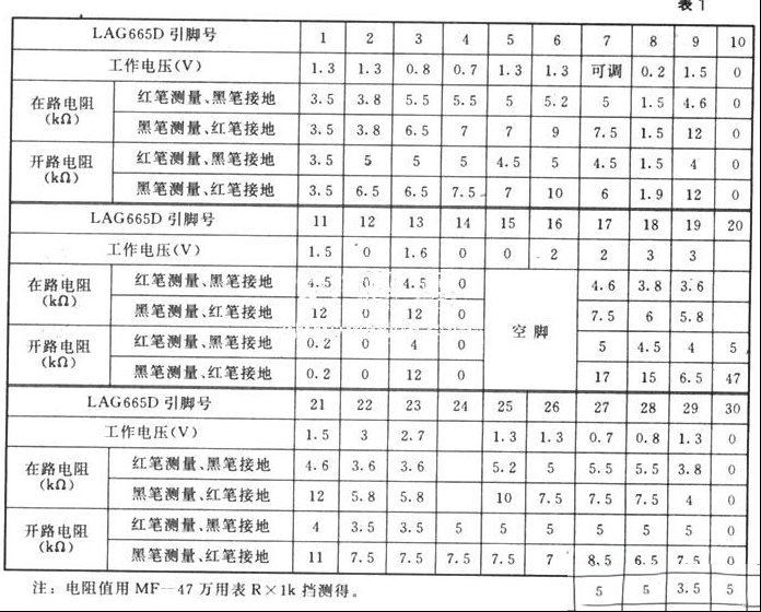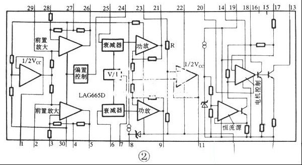 | LAG665D除具有一般立体声放音机集成电路所具有的双前置放大器、双功率放大器和电子直流音量控制功能外,还具有直流电机稳速功能。ST-2000型随身听放音机由一块单片集成电路LAG665D为主构成,相关电路如图1所示(该图根据实际电路测绘而得)。LAG665D除具有一般立体声放音机集成电路所具有的双前置放大器、双功率放大器和电子直流音量控制功能外,还具有直流电机稳速功能。也就是说,它包含了立体声放音机的全部功能。其内电路方框图如图2所示。 一、电路工作原理 从图1及图2中可看出,放音磁头输出的电信号由②脚和29脚输入至LAG665D内的前置放大器,经放大后从⑤脚和26脚输出。③脚和28脚外接补偿电容,④脚和27脚外接负反馈电容。由⑤脚和26脚输出的信号直接加至⑥脚和25脚,分别通过衰减器输入到功率放大器。衰减器的衰减量由V/I(电压/电流)变换电路控制,以实现电子音量的控制。⑧脚提供音量控制的参考电压,通过⑦脚可以改变音量控制电压。音量控制后的信号经过功率放大后由⑨脚和21脚输出,驱动立体声耳机发声。 LAG665D的24脚为“前置切断”控制端,若该脚外接一只开关与电源接通时,内部前置放大器被切断,以便同来自收音机的检波输出连接。这一功能在该机中未使用。17脚为直流电机速度调节端。13脚为电机提供控制电压,该电压的变化受集成电路内部电机控制电路的控制。14脚和20脚在接通电源时可分别对电机进行强制性的启动和停止。18脚为转矩控制端。23脚为前置放音电路电源外接退耦电容端,电源电压由22脚输入。 二、常见故障检修思路 1.无声或音小这两种故障的检修思路有些类似,故这里仅以无声故障为例。检修此类故障时,首先观察电机转速是否正常。若电机转速基本正常,说明整机的供电电源无问题,应进一步测量集成块LAG665D①~⑧脚以及23~30脚上的Dc电压。若这些引脚上的电压均消失,则说明放音前置放大电路的供电电压有问题,应重点检查集成电路23脚外接的c5电解电容器,看其是否击穿短路。因为23脚上的电压是由22脚电压经Ic内的一只限流电阻R后得到的,由该脚内的稳压电路将此电压稳压成2.7V提供给放音前置电路。因此,23脚上的电压直接反映了前置放音电路的供电情况。如检查c5无问题,则故障多为集成电路22与23脚内的这只限流电阻R开路引起的,可用一只180Ω左右的电阻并接在22与23脚间试试,如放音恢复正常,则说明判断正确,此时只要将该电阻直接焊在22与23脚的连接铜箔上即可。若检查23脚上的2.7V直流电压无问题,则问题大多为LAG665D本身有损坏引起的。对此,只有更换新的集成电路。另外,如LAG665D 22与23脚内的这只限流电阻值变大,或23脚外接的c5电容漏电,使前置放音电路的供电电压下降则此时的故障表现为视损坏的程度不同而不一样,一般主要表现为:声小;声小有噪声,且噪声会随音量的增大而变大。 2.某一声道无声 只有一个声道无声,说明整机的供电及Ic的各部分的供电都是正常的,问题仅出在无声通道的电路上。在排除了耳机及插头以及放音磁头出现问题的可能性以后,应进一步重点检查无声通道的电路部分。不过,由于LAG665D的集成度较高,两路放音前置放大及功放电路均集成在Ic内,外围除了连接铜箔外,其它没几个外接元件,故此类故障在排除了Ic连接铜箔断裂的可能性之后,问题多为IC内电路不良引起的,一般只有更换同型号的集成电路。 若故障属放音时某一声道声音发尖或异常,则应重点检查补偿电容C1或C2以及负反馈电容C3或C4。 3.一个声道放音正常,另一个声道噪声大(指用外接稳压电源供电的情况下) 遇此故障时,可先用干电池试听。如果放音正常,用外接稳压电源时出现上述现象,说明这多为稳压电源滤波不良引起的,可通过加大C5、C6容量值的方法来解决。如用干电池试听时故障仍存在,则故障可能是磁头上有污物或严重磨损引起的。可先对磁头进行清洗,并对磁头的方位角进行适当的调整(应使用无感螺丝刀,以防剩磁影响放音效果)。如清洗和调整均无效,则只有更换新的磁头。 4.电机“吱吱”声窜人放音电路遇此故障时,先取下电机传动带,让电机空载运转。听“吱吱”声是否仍存在。如果仍有“吱吱”声,则多为磁头磁化或磁头外壳接地不良引起的。如上述检查均无问题,还可通过适当增大滤波电容器c6容量值的方法来解决。如果空载“吱吱”消失,一加载“吱吱”声就出现,这种现象多为电机本身不良,内部打火引起的,可将电机外壳接一地线,看“吱吱”声能否消除。如仍不能消除,则只有拆开电机进行修理或更换新电机。 5·电机不转 电机不转,首先应检查其本身是否卡死,可将其引线的一端焊下,用二节干电池给其通电看能否转动,以确定是否卡死。如检查电机无问题,再检查机心上控制电动机电源的开关接触是否良好。若上述检查均无问题,再测LAG665D 13脚上的电压是否为1.6V左右。如无此电压,多为Ic本身损坏。 6。放音变调 放音时带速过快,可先检查微调电阻RP2是否接触不良;仔细缓慢地微调RP2电阻看转速能否恢复正常。若恢复正常,则说明故障属调节不当或Ic内调速电路中某(些)元件参数发生了变化。若调节无效,或将IC 13脚与外电路断开,测得13脚电压始终保持在2.5V以上的不变值,则可判断为Ic内的调速控制电路损坏。 三、LAG665D的修补与代换 1·电机调速电路的修补 从多例实测结果来看,LAG6