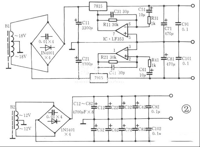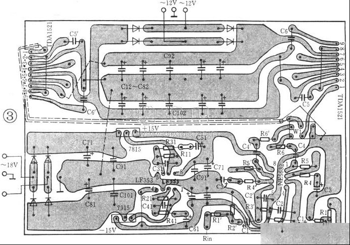 | 飞利浦公司的TDA1521功放集成块,具有短路,过热,静噪等保护功能,双声道输出额定功率12w×2,BTL输出可达30w以上,且外围电路简单,制作容易。由于芯片价格较低,对于初烧友选择TDA1521集成块制作功率放大器,仍不失为一种较好的选择。 本人制作的这台功放,是为了推书架箱作纯音乐欣赏。采用二片TDA2521功放块作BTL输出。遵循简洁至上的原则对电路进行了精选,采用前后级独立供电。前级电源为有源伺服电源,大动态输出下性能优良。功放电路见图1。 该电路前级为10倍线路放大器,倍受发烧友推崇,受音源限制,这里只采用菲利浦公司的NE5532N运放做前级放大,免除音调电路,信号直通后级,保持了音乐原汁原昧,也符合Hi—Fi纯功放发烧潮流。 图2为前后级电源电路。 图3是印板图(原尺寸为160×107mm),爱好者也可根据需要另行设计。 元件的选用是关键。TDA1521市面上假冒品较多,输出功率小,耐压值低,容易“爆机”,选购时要小心。耦合电容和无极性电容不追求高级进口“补品”,只用国产优质超小型金属化CBB电容,前级输入耦合电容因容量较大,最好采用钽电容。电阻用1/4w金属膜电阻。左右声道的电阻,电容用数字万用表进行筛选配对,以保证较小误差。电源滤波电解电容选购8只4 700uF、35V优质国产铝电解,总计容量达37000多uF.价钱却实惠很多。前级电源采用二块.3300uF、35V电容,容量相当充裕。前级和后级电源变压器分别用一只25w旧仪表变压器和一只80W电子管电源变压器改绕而成,可算是废物利用。 焊机时,先从电源部分开始,焊好后通电测量前级电源应为±15V,后级应为±17V左右.然后,焊上NE5532N(也可用IC插座,方便更换不同的运放)和TDAl521功放集成块。本机左、右声道为用一块体积为50×50×60mm重达400克的铝质翼形散热器,功放块与散热器之间加垫云母片,用万用表10k档测量阻值为无穷大,散热器方能接地。机内连线使用优质屏蔽线,前后级做到一点接地。 功放机外壳是用仪表壳改制,电源变压器为全屏蔽式,不必担心电磁干扰。装配时,要注意功放的输入端子与输出端子左右声道要对应。由于BTL输出,声道的输出极性更要注意。一切做好后,就可以联机试听了。 注意,图中阻容标号为便于区分位置,标号并未按顺序排列,安装时只要按图注标号对号入座即可。 |