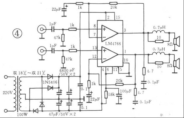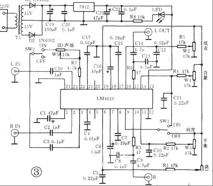 | QS7779PM/CM是一款虚拟杜比环绕声处理大规模集成电路。该集成电路不仅可以将杜比定向逻辑编码信号及DVD(AC-3编码)输出信号解码后处理成虚拟环绕声.而且还可以将普通立体声信号3D环绕声声场增强处理,从而仅用两只音箱即可获得空间感及包围感强烈、音源定位准确的环绕声放音效果。 与声音恢复系统SRS相比,由于QS7779内部的信号处理流程分为环绕解码和虚拟编码两个环节,听感上的差距非常明显:SRs的包围感也较好,但声像虚飘;QS7779处理器的声像聚焦真实而准确,即使在聆听者侧后方,也有明确的位置与尺寸。由于该集成电路性能优良、外围元件简单,故十分适合发烧友用来组合安装家庭用虚拟杜比环绕声功率放大器。 第一部分、由QS7779组成的虚拟杜比环绕声处理器 虚拟杜比环绕声功率放大器由三部分组成见图1。 全电路见上图2; 第二部分、3D/音调/平衡/音量控制前级,全电路见图3; 第二部分使用美国NS公司功能强大的Hi-Fi前级LM4610。它是广大发烧友熟知的优质前级LM1036的换代产品,也是利用直流电压来调节两声道高低音调、平衡、音量;它还具有3D声场展宽调节。高音调节范围(16kHz)为±16dB。低音调节范围(40Hz)为±15dB,平衡调节范围为1~20dB,音量调节范围为75dB,总谐波失真仅O.0003。信噪比80dB,频率响应高端达250kHz。当3D声场控制开关SW2接通时, 3D功能起作用;SW2断开则3D功能消失。SW1是响度补偿开关,其作用是因人耳在音量较小时对声音中的高、低频信号敏感度下降,故有必要在不同音量(响度)时对高、低频段作适度附加提升补偿,以使人耳在任何响度下始终能听到平坦、均衡的响应。当SWl接通时,响度补偿电路将随音量变化大小对L、R声道信号作恰到好处的高、低音提升;当SWl断开时,无响应补偿功能。LM4610纯音前级不仅起着阻抗变换和电平匹配的作用,它的3D/高音/低音/平衡/音量五个调节作用还可让发烧友按自己的欣赏习惯对音乐信号进行再修饰。它是家庭音频功率放大器不可缺少的部分。 第三部分、立体声功率放大器 第三部分是功放部分.为了适合对音乐输出功率的不同需要,功率放大器可根据听音房间面积大小、音箱尺寸和灵敏度及对功率储备的要求来确定,对于家庭音响系统,一般在40W×2~150W×2之间选择。 如果房间面积在20m2之内,音箱为中小书架箱,40W×2的功率已能满足听音需要。若发烧友未配备功放,可选用美国NS公司最新推出的音色温暖醇厚颇具胆机风格的优质立体声功放LM4766(见图4)。 该集成功放在输出功率30W×2,总谐波失真和噪声都很低,加上过压、欠压、过载、超温等完善的保护电路及可以消除开关机输出冲击的静音电路。这些优异性能使其成为小型家庭立体声自制功放的首选。 对于房间面积在30m2内或使用大、中型落地音箱的发烧友,功放的输出功率应为70W×2~100W×2,若无现成功放,可选用欧洲sGs—THOMsON(意法)公司音色细腻圆润的DMOS大功率集成功放TDA7294组装的功率放大器。TDA7294可提供连续100W输出功率,频率特性平坦。在20Hz~20kHz、输出功率为0.1w~50W条件下,总谐波失真低达0.0005,噪声1~2uV,具有负载短路、超温关断等完善保护电路,其静音、待机电路也可消除开关机时对扬声器的冲击。 若发烧友的听音室、歌舞厅面积大于30m2,或在露天广场、或发烧友渴望极大的功率储备.以便在大鼓、枪炮的轰鸣声中寻求天摇地动、震撼心脾的体验,这时可选用由四只TDA7294与四只10000uF50V红宝石组成的立体声BTL功放,它可连续输出150W×2功率,能将“爆棚”效果推演至极致。 由虚拟杜比环绕声功放产生的声场见图5所示,图中音箱1是虚拟杜比环绕声功放所用的两只音箱,虚线所画音箱2、3、4描绘虚拟环绕声所营造的声场。 |
