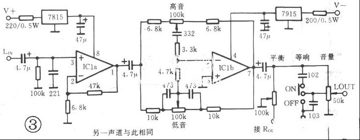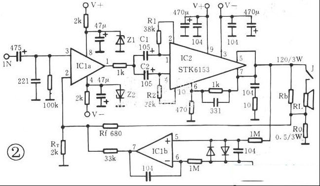 | STK6303及STK6153均为日本三洋厚膜电路,常用于100W纯后级放大。该电路工作电压宽、允许温升高,大功率下具有低噪音、低失真、宽频带、高保真等优点。通常多采用电压负反馈或准直流功放形式。为进一步发挥其潜在性能,本文介绍一种有源直流伺服直流负反馈新接法。 上图1为STK6303的恒流功放接法。ICl为NE5532N,IC2为STK6303F的B面,其中IC1a用于电压放大,IC1b构成中点零电位伺服电络,Ic2用于电流放大。其负反馈网络由R。、Rf、Rt等构成,电路十分简洁。内部集成了电源反接保护,输入端静态偏流电路等。 上图2为STK6153的恒流功放接法。IC1为NE5532N,IC2为STK6153,IC1a为电压放大级,ICIb与周围元件构成直流伺服网络,IC2为电流放大级。R1、R2、c1、C2与内部电路构成输入端的偏流电路,以使功率管工作于甲乙类状态,减少交越失真。注意R1、R2取值不可太小,以免功放块过热。保留功放级局部负反馈,以使工作更稳定,降低非线性失真。自带散热片与内电路已电气绝缘,使用更安全方便。 以上两款功放IC内部均为全对称结构,因此装毕无需调试即能稳定工作,实测中点电位均在1mV以内,且发热量较其它接法更低。Z1、Z2为1/2w、12V稳压二极管,R。为0.512/3W金属膜电阻,Rb为120Ω/3W金属膜电阻,其余电阻采用1/4w五环金属膜电阻,电容采用钽电容或cBB电容,电源退耦电容应取大一些。所有元件耐压均>50V。所配电源板可采用10A、10000uF×2或×4板。电源变压器采用300W以上优质环形变压器,次级有单9V、双15V、双28V三组输出。两声道共用一块230×65×50mm散热器,中功率连续工作时基本无温升,可直接接地或机壳。输出为四线制,不允许有公共端。 当接好扬声器保护板后即可试音。本机信噪比低、音场定位准确,音色自然优美,动态范围大,解析力高,特别是中高音的“胆味”,低音的力度和速度感均有较好的表现。如将NE5532N换成OP275,听感更佳。可以与本机配合的负反馈式音调控制电路是成品中高档机常采用的电路,其独立成板可方便地与功放配接,图3为一款较成熟的电路。图4为其控制曲线。 该电路板高、低音调节采用同轴双联电位器实现双声道独立调节,音量调节采用双联带等响抽头的步进式电位器控制。等响度开关采用2×3直键开关控制。板上设有7815、7915稳压,电源可直接引自功放电源(须大于±18V)。音量电位器设置于最后,可显著提高信噪比。 另一种直流电平控制音量、音调、平衡等响电路,只用单连电位器就可实现双通道同步控制,具有优良的配对特性,控制线无需屏蔽。 图5为TDA1524应用原理图。音量控制级设置于音调级之前,即使输入高达2.5V的强信号,也不会使音调级过载,输出电压最大可达3V,易与前后级实现匹配。内部具有电压放大增益,可直驳末级功放。 |