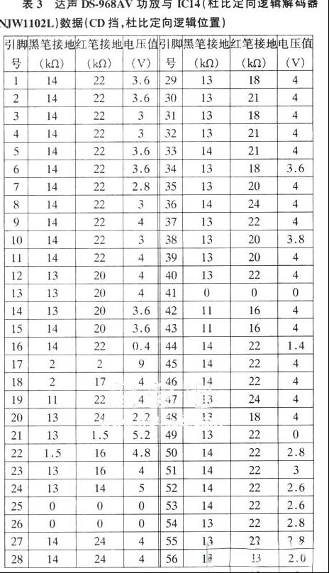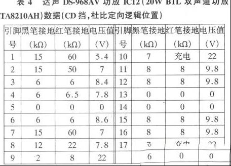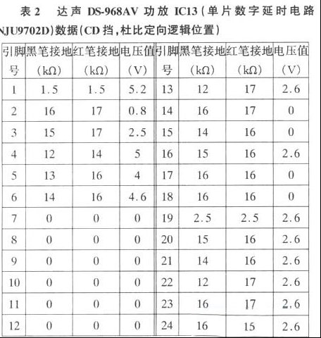 | 表1、达声DS-968AV功放解码板在路阻值实测数据 表2 、达声DS-968AV功放IC13(单片数字延时电路NJU9702D)数据(CD挡,杜比定向逻辑位置) 表3、达声DS-968AV功放与ICl4(杜比定向逻辑解码器NJWll02L)数据(CD挡,杜比定向逻辑位置) 表4、达声DS-968AV功放ICl2(20W BTL双声道功放TA8210AH)数据(CD挡,杜比定向逻辑位置) |