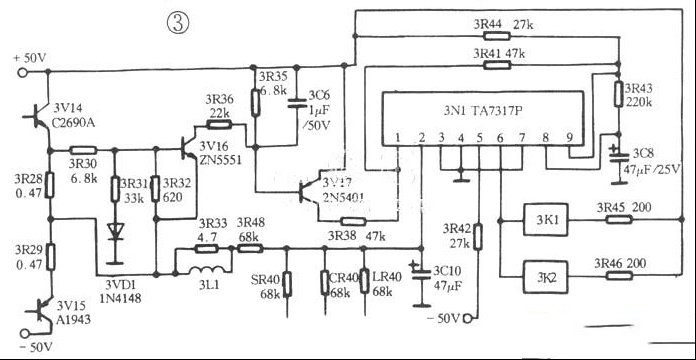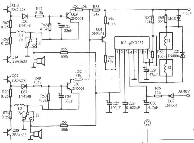 | 在音频放大器中一般都设有功能完善的保护电路,可以在功放输出管过载、输出端电位偏移时进行可靠的保护,还可以在开机时延迟接通扬声器,避免开机损坏扬声器和开机“嘭”声,关机时瞬时断开扬声器,可避免关机时的冲击。 一、分离元件保护电路 图1所示是湖山BK2X100JMKⅡ-95型纯后级功率放大器功放保护电路。放大器刚接通电源时,+56V电压通过R143对C116充电,约延迟4s,C116上电压充到9.5V左右时,稳压管V126导通而使V124、V125导通,继电器K101吸合,才能接通扬声器,避免开机时的电流冲击而保护扬声器。 v126、v129组成功放输出端的电位检测电路,当输出端的电位偏移时,通过一51k电阻R144,使V126或V129导通。当输出端的电位是正偏移时,V129导通。反之,当输出端的电位是负偏移时V126导通。无论v126或V129中哪一个导通,C116正端电位为0V,稳压管V126截止,V124、V125截止,使继电器释放,断开扬声器,这样就完成了输出端电位偏移保护。 当功放因输出短路或负载过重时,输出管V134、v135射极电流大增,在R132、R133上产生的压降增大经R134、R135分压加至V118基极,使V118导通,使V127基极电位降低,v127导通,稳压管V126截止,V124、V125截止,继电器释放,断开扬声器,这样就完成了输出管的过载保护。 二、uPC1237保护电路 图2所示是天逸AD-5100A型AV放大器功放保护电路。J1、J2为接在功放输出端的继电器。刚开机时,+56V电压经R57、R58对c29充电,几秒后,当C29充电到一定电压时,IC2(uPC1237)⑥脚内的开关电路接通,输出低电平,使J1、J2吸合,接通扬声器,实现开机延时保护功能。当功放输出端直流电压因某种原因发生偏移,使IC2 2脚电压超过+0.7V,或低于-0.23V时,⑥脚内开关电路截止,输出高电平,使J1、J2释放,断开扬声器,实现功放输出端的直流电压偏移保护。 当功放输出极短路或负载过重时,使功放输出级的电流过大(超过8A),R67或R70两端电压达到约2V时,可使Q29或Q30导通,Q31也随之导通,使IC2 1脚输入一电压值,使J1、J2释放,断开扬声器,实现功放末级电流过载保护。电源变压器交流40V绕组的一端,经D32、R59加至IC2 4脚,关机时,交流电压瞬时消失,而其他直流供电暂没消失,J1、J2瞬时释放,扬声器断开,以避免关机时的冲击。 三、TA7317P保护电路 图3所示是湖山AKV100型AV放大器功放保护电路。刚开机时,+50V电压经3R44、3R43对电容3C8充电,数秒后3N1(TA7317P)⑧脚电压上升到约1.2V时,继电器3K1、3K2吸合,接通各路扬声器,完成开机延时保护。当右声道输出级的负载过重或出现短路时,输出管电流急剧增大,使3V14射极电阻3R28两端电压增大,经3R30、3R32分压加至3V16基极,使3V16导通。这时集电极为低电位,使3V17导通,3N1①脚电压也升高,继电器3K1、3K2随即释放,断开负载完成过载保护。 当因某种故障使输出端出现一定的直流电位时,经3R48加至3N1②脚,此脚检测到直流电位,随即释放继电器3K1、3K2,完成输出端电位偏移保护。同理,当左声道、中置声道、环绕声道输出端直流电位偏移时,经LR40、CR40、SR40加至3N1②脚,此脚检测到直流电位进行保护。 四、故障检修实例 例1、湖山AKVl00型AV放大器。开机时有冲击声。 此故障是延时保护电路的问题,因为在正常情况下,功放应在开机时延迟接通扬声器,以避免冲击噪声。 参阅图3,正常情况下,3N1的⑨脚在接通电源后应为2.9V,⑧脚在通电后5s左右从0V增加到1.2V。这时3N1⑥脚输出0.9V低电平,使继电器吸合,接通扬声器。而此机3N1⑧脚在通电瞬间即上升到1.2V,继电器很快吸合,无延时效果。焊下3C8检测,发现此电容已失效,用一47uF/25V新电容更换后,故障机修到这里,终于修好值得探讨。。 例2、天逸AD-5100型AV放大器主声道无输出 打开电源开关后,听不见继电器的吸合声。正常情况下,打开电源开关后几秒钟,就可听到“嗒”一声,即继电器的吸合声。 参阅上图2,若测得功放输出端电压高于正负1v,则是功放输出端电压不正常所致,常见原因是因为电源电路中某一滤波电容失效变质、漏电,桥式整流臂某一臂二极管性能变差,造成正负电源电压不对称,或是功放电路的直流工作状态不正常;若测得R67或R70两端电压超过2V,这是功放管Q13、Q14、Q27、Q28已击穿或漏电,或是前级推动管击穿或耐压不足。 实际测试上述两项均正常。将功放电路正负电源切断,单独给保护电路供电,因为功放电路的电源切断后,就不会有过载或输出电压偏移,所以保护电路在通电几秒后继电器应吸合。现此时继电器仍不吸合,这是保护电路本身出了故障,测IC2各脚电压正常,仔细检查,发现两个继电器相接的线路板出现一裂缝,补焊后故障机修到这里,终于修好值得探讨。。 |