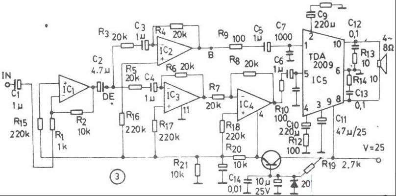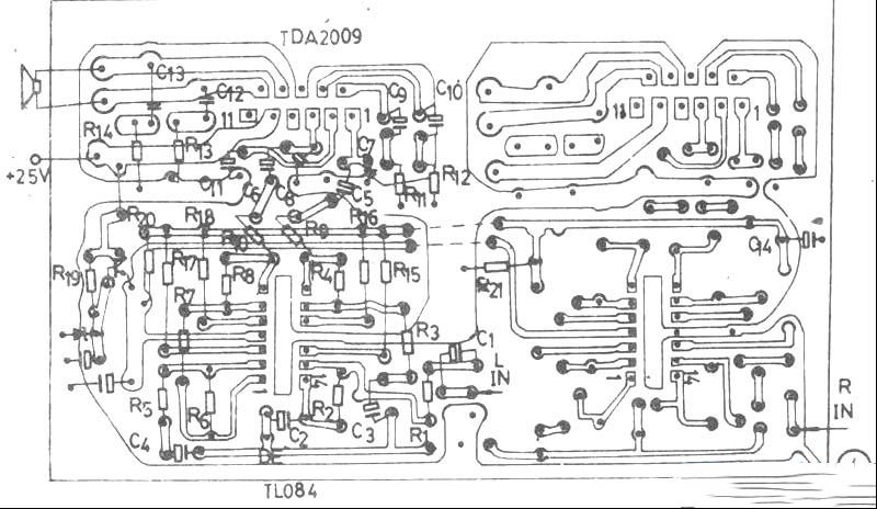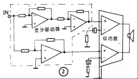 | 常见的BTL功放电路如下图1所示(如用TDA2030接成的BTL电路就属这种形式),所用的功放集成电路,其增益都是由外接电阻R1R2确定,接成BTL电路,只要元件准确无误,一般无需调试都能达到要求。但对于一些带前置放大或内部反馈电阻不清的功放集成电路(如TDA2009、TA7240AP等),用图1所示的方式设计成的BTL电路,都要通过调试才能达到要求,而对于一般业余爱好者,由于缺乏相应的仪器,无法调试好这种电路。本文介绍一种无需调试,失真度小的BTL电路,并且读者可根据自己具体情况任意选取功放集成电路,通用性强,这无疑给读者把自己原有的机子装成立体声的BTL电路,带来很大的方便。电路的程式如图2所示,虚线方框内是由运算放大器构成的高性能差分放大器,与差分放大电路驳接的是双功放集成电路。 一、电路简介 图3只画出L声道,R声道线路完全相同。音频信号从A端输人,经IC1放大后(放大倍数由R1R2确定),一路经IC2作反相放大,增益为1,另一路经IC3、IC4作两次反相放大,增益仍为1。实质IC3和IC4共同构成增益等于1的正相放大器,所以在IC2输出端B点和IC4输出端c点,得到两个大小相等相位相反的音频信号。这两个互为反相的音频信号分别通过R9R5和R10C6加到双功放集成电路TDA2009的两个正相输人端1脚和5脚,经TDA2009内部两个功率放大器放大后,在10脚和8脚输出,推动喇叭工作。 二、元件的选取及电路变通 上面图3中IC1~IC4选用TL084,由于选用高质量运放,故差分放大器频响宽,噪声低,瞬态指标高。R3~R8尽可能选取精度高的电阻,目的在于使B、c两点信号大小相等。其它阻容元件无特殊要求。 读者可根据需要,在图3电路所示的DE间断开,接人RC衰减式音调电路,由于信号经IC1作一次放大,且这种运算放大器的输出阻抗低而输入很高,接人RC衰减式音调电路非常适宜,保真度高,效果明显,笔者通过接人RC衰减式音调电路,收到了良好的音响效果。 本电路最大的通用性是:任何OCL输出或OTL输出双功放集成电路,都可直接与差分放大器的两个输出端驳接,构成BTL功率放大电路。 本电路虽用两块TL084,两块TDA2009,但其余元件均是阻容元件,线路结构简明。按本文推荐的印刷电路板图组装的扩音板,噪声低,在离喇叭一米远的地方,听不到任何噪声。 |