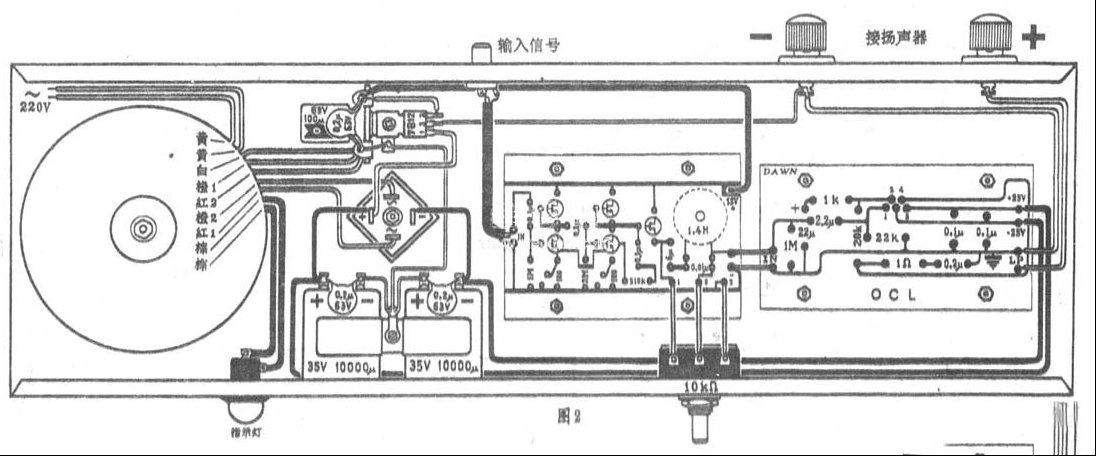| 欲使LM1875放大器靓声,除了要优选外围零件之外,还必须高度重视直流电源的品质,在图1的OCL放大器里,采用了大容量的桥式硅堆、滤波电容以及先进的环形电源器。环形电源变压器的内阻低、效率高,在音乐信号出现大变压动态时,能使声音有足够的力度,听上去透明无瑕。 当负载阻抗为8Ω时,LM1875的额定电压增益为26dB(约20倍),由此可推算出其输入灵敏度约为0.63V。激光唱机的线路输出电压通常在0.1V左右,因而需要在LM1875之前一个增益为20dB(即10倍)的前级放大电路。在考虑选用哪种前级放大电路时,应该留意前、后级之间转换速率的搭配,LM1875的转换速率为8V/us,一般说来,后级的转换速率宜比前级的稍许大一些,否则容易诱发令人讨厌的瞬态互调失真。 图1里的OCL电路焊装在印刷线路上,线路板不钻小孔,全部零件都焊在有铜箔的那一面,这样,线路板的背面是光板子,可以直接固定在金属底盘上。LM1875佩戴的小型铜质散热器应注意与金属底盘保持绝缘。 用于控制音量的10000Ω电位器一定要买阻值变化规律是线性的品种,线绕电位器亦可使用,例如国产的wx3-12型电位器用在这里就很合适。1.4H的罐形磁芯电感可自制亦可购用售品,安装时应以塑料螺钉固定在线路板上。两只100Ω的微调电阻用于校正两级电压放大的工作点。图中的6uF和2.2uF是两只高介质系数的玻璃釉电容,宜选购优质产品。 本机每个声道单独做成一个完整的实体,图2(左边)是揭去底盖后见到的实体装配情形,线路板上的零件未曾绘出,以便照样子翻拍制版,金属底盘用1mm厚的铁板制作,尺寸为:长415mm、 宽130mm、 高70mm,表面镀锌防锈。 该电路的输出功率可达25W。 |