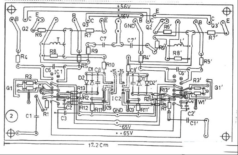 | NEC公司继性能优异的宽带低失真50W推动电路pPC1225H之后,为了适应大功率的要求又推出了新一代音响驱动IC—uPC1342V,该IC除具有uPC1225H的所有优点及基本相同的外围电路外,其输出电压偏差更小(±5mV)、电压适应范围更宽(±20-±70V)、推动功率更充裕,堪称烧友自制功放的首选IC。用二块uPC1342V组成的2×110W功放电路结构见图1(虚线内的保护电路为两声道共用一套),图2为除保护电路外的功放印板图。 一、电路原理分析 图1,IC1供电±65V,功放管供电士56V、保护电路及直流伺服环路供电分别为±25V和±15V,采用这种前后级高低压、各级分离供电的方式对降低级间干扰、提高功放动态范围及音质有着决定性作用;IC1内电路由优良的DC放大器用镜象对称互补差动放大前置电路、功率驱动及完善的恒流恒压、开机启动、保护、温度补偿等电路组成。IC1③脚及外接C2完成前级静噪功能,Q1、R3、W为IC1外接偏置电路,C4为消振电容,在保证IC1不出现高频自激的前提下应尽量减小其容值。 IC2及外电路组成直流伺服环路能将输出中点失调电压控制在±2mV内,使放大器DC化、令功放解析力提高、高频相移失真减小,工作更加稳定。 保护电路由音响保护专用IC - uPC1237HA为中心组成,Q4、Q5及外电路构成多谐振荡器,LED在功放正常时常亮作电源指示,当功放出现故障表现为时,继电器立即断开喇叭,同时LED每秒闪动二次。 二、元件选择及调试 1、音频部分的阻容元件首选RJ、CBB系列。Q1为C2073中功率管,Q2、Q3为C2922、A1216三肯管,L用φ1.2mm漆包线密绕成内径为10mm的空芯线圈10匝,IC1需加60×60×1.5mm的散热板。 2、电源部分变压器若用普通铁芯的最好为B1、B2作一个金属屏蔽盒,TWH33为1000W抗干扰过压保护组件。3、检查无误后通电试机,微调w使输出功率最大、失真最小即可。 对本功放感兴趣的烧友如果严格选择材料、精心焊接制作,相信这款功放一定会给您一种“发现新大陆”的感觉。 |
