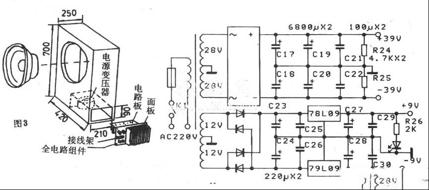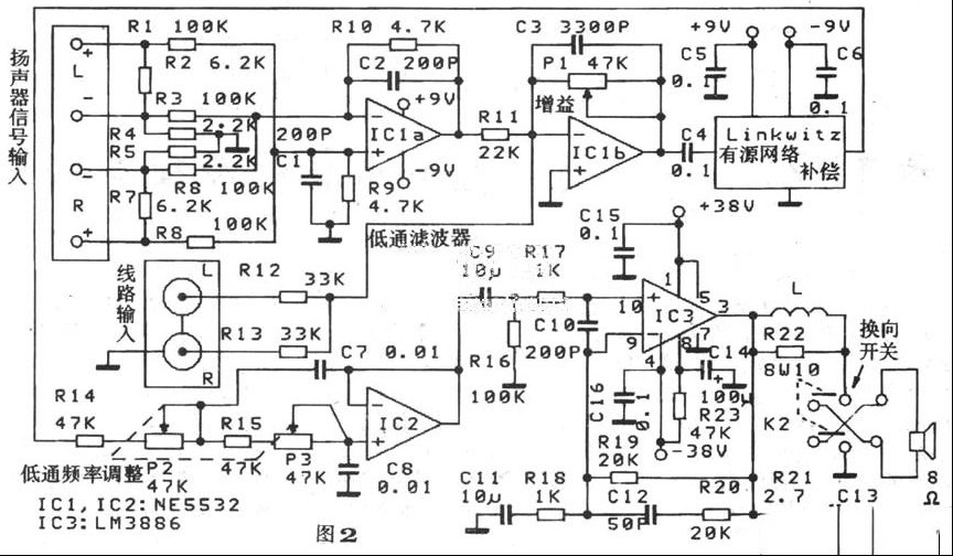 | LM3886是美国NS公司最新面市的大功率高性能集成功放,在5Hz~100kHz范围内线性良好,互调失真低达0.004%,谐波失真和噪声仅0.03%,且有过压、欠压、过流、超温等完善保护功能及开机防冲击静音功能。本文介绍LM3886在家庭影院系统中的几种实际应用。 一、优质双声道功放;LM3886在额定电压下输出连续功率近70W,峰值功率达150W。双声道功放采用简洁典型线路,可取代多种中低档发烧功放,适合用作家庭影院左右主声道功放。全电路装在同一印制板上,两只LM3886各配一只长140厚50高75(mm)专用铝型材散热器,固定在印制板两侧以利散热。电源变压器可选用双24~28V、3~5A环牛。 二、强力BTL功放:由运放皇NE5532和两只LM3886同相、反相放大器组成纯BTL桥式放大器,可轻松输出200W以上不失真功率。可用于歌舞厅、卡拉OK厅、剧场扩音等场合。此电路在小音量放音时音质仍能保持自然流畅。BTL功放电路见图1。每声道一个电路板,有独立的整流滤波及推动电路,两只散热器尺寸为长140厚50高100(mm)。 三、超重低音有源音箱:图2是一款家用超重低音有源音箱电路。 图中Linkwitz有源补偿器通过精确控制补偿峰的中心频率f1及其Q值,可使自然转折频率50Hz左右的封闭箱(见图3)频响曲线(见图4)平坦地向下延伸,低端-3dB点达到25Hz。 图4中曲线a为自然频响,b为补偿曲线,c为系统频响。低通滤波器的转折频率为80Hz~200Hz连续可调,使有源超重低音音箱能与读者的不同频率下限的双声道音箱相配。扬声器选用银笛YD310—43,盆直径310mm,磁体直径158mm,共振频率25Hz,Q=0.35,连续功率50W,灵敏度高达95dB。与灵敏度为88dB的惠威S8单元相比,两者灵敏度相差7dB。如果同是闭箱,银笛YD310-43输入50W时的输出声压相当于惠威S8单元输入≥200W时的输出!也可用南鲸YD310-8XA代银笛。箱体不采用瞬态性能差、灵敏度低的倒相箱,而用最简单的封闭箱。箱体应结实、不漏气,内部填充玻纤棉或保暖用腈纶棉吸声,箱体下部小腔用来安装电路部分。 为安装简洁起见,全部电路均装在印制板上,印制板、散热器、开关、输入输出接插件部固定在金属面板上,再用6只螺钉固定在音箱上,接通喇叭和变压器即可工作。用低频信号发生器配合DN60频谱仪测量,本有源音箱低频下限达25Hz。将本超重低音有源音箱与家庭立体声音箱相连,即组成3D放音系统,立即就能体会到“低音是音乐的基础”这句话的无比正确!播放《悲情世界》No.1及No.5等曲时,感觉不仅耳朵、皮肤处于浩瀚声场之中,甚至整个身心均受到超重低音的震撼性冲击。 |
