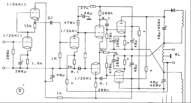 | 这种胆机推挽功放原理见图1。输出级的两管直流电路是串连的,交流电路是反向并联的。各元器件构成一个电桥,其中两臂是管子的内阻,另外两臂是电源E1和E2的内阻。RL是有抽头接地的负载。 具体线路见图2,这里只绘出一个声道。前置级由6N11构成SRPP电路,取其输出阻抗低、失真小。高频响应好的特点,倒相级则采用常用的长尾倒相电路,这里不作详细分析,读者可参考有关文章。末级则是由两只输出管构成反向并联推挽电路,输出管各电极的接线与通常的推挽放大器末级管的接线是不同的。另外,电源要有两套,且各自独立。不难看出,所谓的反向并联推挽电路,不过是在普通推挽放大电路的基础上增加了一套电源,然后把其中一只管子的极性掉换,再把电源和负荷的位置对换而已。 电路最大的特点就是输出变压器构造极为简单,为自耦变压器,而性能却很好。因为输出变压器只有一个线圈,所谓的初、次级不过是从其上抽头而已,因此耦合紧、漏感小,可不用夹层、分段、交叉绕制。又因负载上无直流通过,故以同样体积的铁芯,可以得到较大的电感。 图2中带※号的元件,要根据所有管子的不同,适当加以调整。 |