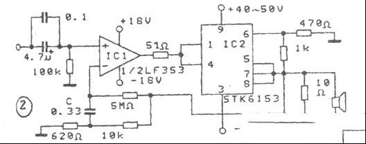 | 功放厚膜集成块STK3048与STK6153(电子报)已对其内部电路与使用作过详细介绍。本人试用后发现其放音音质确实令人刮目,性价比极高,特别适合于初级烧友和偏爱集成功放的朋友们制作。 1.用STK3048直接推动互补大功率管 STK3048的使用电压高,动态宽,差分输入管配对精确,其共发射极端与输出集电极端均采用恒流源负载,故失真低,增益高,对电源纹渡抑制力强。用STK3148推动大功率管不但性能优越而且省去了许多配对与调试,简单可靠。 图1是用STK3048推动功率管2N3055和MJ2955的电路图,线路简浩到不能再少一个元件。R1和R2可以直接使用成品板上的。通电后如果管子不烫手也无其它异常即可空载调整RP,使R1和R2上的压降为10~13mV,这样Q1和Q2的静态电流为40-50mA,工作于甲乙类状态。焊接时可将退耦电容与集成块第⑧脚焊在一起,其它的入“地”端都接于此。中点电压如果>10mV,则可接入伺服电路(本人使用时为30mV)。调好后即可驳接扬声器工作。试听时感觉与一些中档机相比亳不逊色。 2.用LF353推动STK6153 STK6153采用全互补对称结构,有速度高、精变高、噪音低、功率大等优点,由于内部使用恒流源偏置,故状态稳定。其外露散热器已与内电路电气绝缘,使用方便。电路如图2。适当改变电阻阻值可以调整电路的增益。小容量隔直电容选用优质CBB电容能改善音质。 本电路无须调试。试听时感觉高音出奇的鲜亮,甚至觉得是否有点夸张,但非常剔透毫无勉强感。主观评价比TDA1514的LM3886的高音分明,低音的弹跳感和质感也相当强,听感非常好。 |