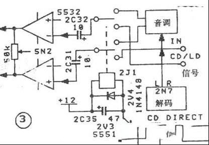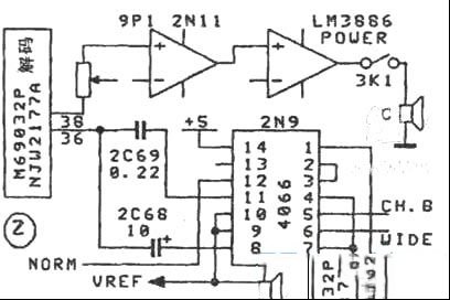 | 湖山牌AVK100杜比家庭影院放大器,是湖山公司于1997年底推出的一款机型。它具有杜比定向逻辑解码、独立数码卡拉OK、CD直通、等响度控制、六组音频和三组视频同步切换、遥控操作等功能。该机输出功率较大,主声道在8Ω负载时可获得100W的有效功率;4Ω负载时可达到150W。其中置和环绕声道采用美国国家半导体公司生产的LM3886做功率放大。 一、AVK100常见故障 1、整机各个声道均无输出,显示正常。 遇到这种情况,首先检查保护电路是否已经保护。由图1可以看出,该机型保护电路采用日本TOSHIBA(东芝)公司的OCL功放及扬声器保护专用集成电路TA7317P,为9脚单列直插式塑封,具有开机延时静音功能,可靠性高。当整机出现过载、输出端为直流电压输出时,3N1第⑥脚输出高电平,继电器3K1、3K2切断输出。检修时,首先测3N1第②脚对地电压为+0.8V(正常工作时为零电位),故怀疑有一个声道输出端出现直流漂移。再测L、R均为0V,而c、s声道输出端有+13、5V的直流电压。检查LM3886的正、负电源均正常,各外围元件也无异常,故怀疑两个LM3886已损坏。更换后,故障机修到这里,终于修好值得探讨。。造成这种故障的原因主要是电网电压太高,使LM3886因无法承受过高供电电压而被损坏。 2、开机荧光屏无显示。但输出及遥控操作正常。 首先检查给显示部分供电的线扎1x1(6P—SCN)各脚对地电压,未发现异常。 从图2可以看出,整机的主要功能控制和显示控制都由CPU(1N2 PIC16C57)完成。由于输出信号和遥控操作正常,说明CPU没有问题,故障出在驱动VFD部分。正常时,CPU发出指令给1N4(NJU3421),再由1N4驱动VFD。测1N4各输出脚对地电压均为-27V,而且不受CPU控制,说明1N4没有工作。怀疑晶振1G2(4MHz)没有起振,取下后发现1G2一只引脚接触不好,更换后,故障机修到这里,终于修好值得探讨。。 3、中置声道没有声音。 如图2所示,该机型解码芯片为日本MITSUBISHI(三菱)公司生产的M69032P或JRC公司的NJW2177A。输入立体声信号经2N7解码处理产生的中置(c)信号,由第36脚通过电子开关2N9的模式选择后,再由第38脚输出到总音量控制器,然后经2N11放大、c音量控制器、功放、保护电路,输出推动中置音箱。首先检查功放部分,没有发现问题;关机测量连接线,也未发现接触不良;再测由CPU传送到2N9第⑥脚和第12脚的控制信号。在C.MODE模式选择在宽带(WIDE)时,第⑥脚立即置为高电平(+4V),这说明由CPU发出的指令传送没问题,用万用表1K挡测宽带模式时2N9第⑧、⑨脚之间阻抗,也处于高阻抗状态,说明2N9已经损坏。更换后,故障机修到这里,终于修好值得探讨。。 4、左、右声道输出时有时无。 故障表现为表现为左、右声道输出有时正常,有时没有输出,这说明线路中存在接触不良现象。打开机箱,将所有接插件重新插好后连机检查,输出正常。用力震动几次,故障再次出现。将机器置于PRO.LOGIC(定向逻辑)状态时,中置和环绕输出始终正常,说明解码和解码之前的电路没有问题。 由图3可以看出,解码出来的L、R信号经过音调部分,再经过一只继电器切换到平衡控制器后到音量控制、运放、功放输出。关机用万用表测量这一流程中的连接线扎,没有接触不良情况。除连接线外,机械性接触的只有继电器2J1(用于CD直通选择控制)。CD直通有效时,继电器常开触点接通,只能接入CD/LD信号,解码和音调被切断。CD直通取消时,继电器常闭触点接通。按前面板上的CD直通键(CD DIRECT),能清楚听到2J1动作的声音,但在故障出现时,2J1的常闭触点处于开路状态。更换2J1后,故障机修到这里,终于修好值得探讨。。 |
