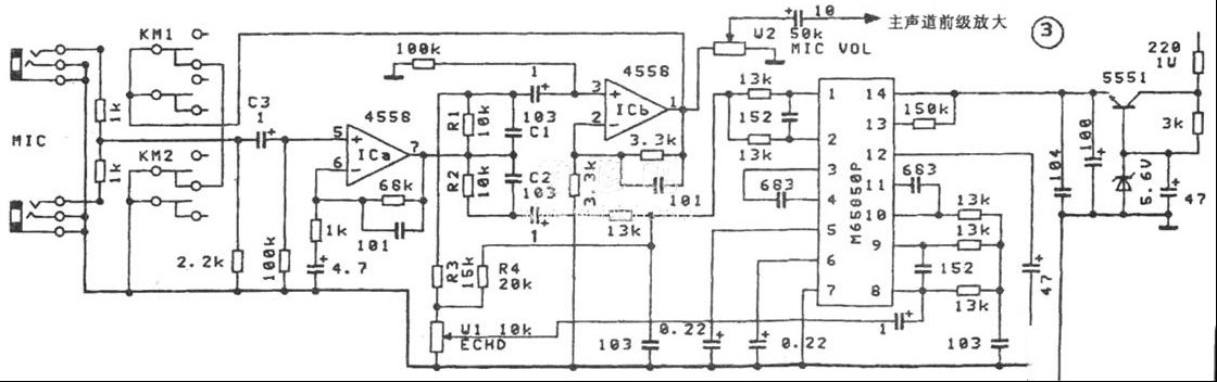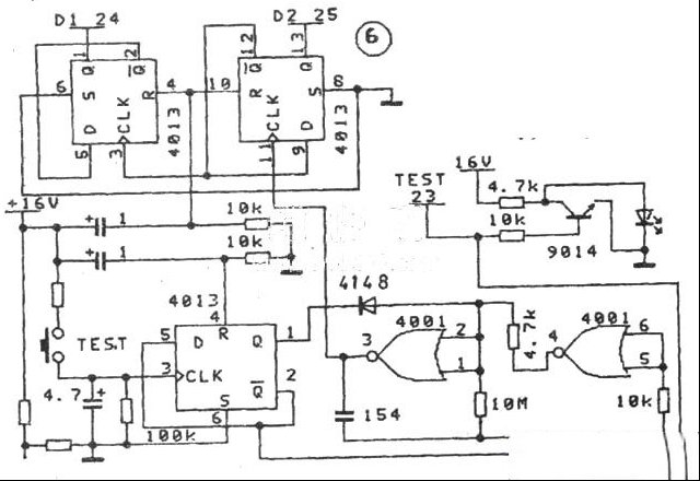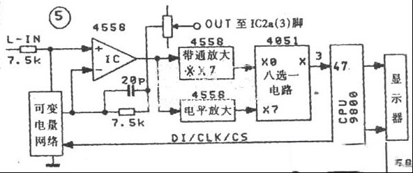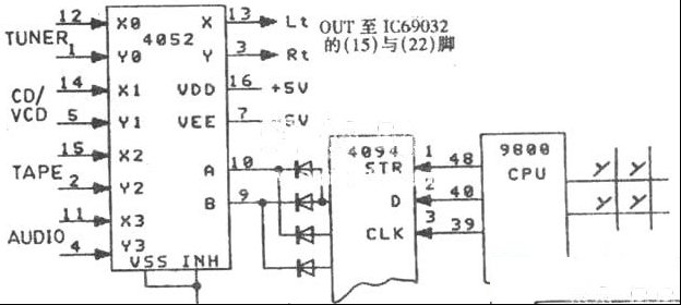 | 奇声(Qisheng)AV-737是带杜比定向逻辑环绕声的功率放大器,功能齐全,能与其他影音器材搭配,组合成较高档次的家庭影院,在市场上有较高的占有率。同类产品有AV-757、AV-767等型号。 一、电路原理筒析 AV-737功率放大器,由音源选择电路、杜比定向逻辑环绕声系统、卡拉OK电路、电控均衡电路、功率放大电路、电源电路、保护电路等组成。图1是其方框图。 1.音源输入选择电路。本机的音源选择电路与传统的机械选择电路不同,其原理见图2。 音源的选择是由输入矩阵电路输入用户指令,经微机(CPU)9800编码处理后输出控制数据流,通过三态八个一级移位寄存器与四个二极管简易组合,控制双四通道模拟开关MC4052来实现,具有简单可靠、接触电阻小、无噪声、寿命长等优点。 2.卡拉OK电路。 卡拉OK电路见图3,主要以数码回声混响电路M65850P为核心。两路话筒信号分别经1k电阻后相加,由c3耦合到电压放大器IC1a的⑤脚,放大后由⑦脚输出:一路经R1、c1加至缓冲放大器IC1b的③脚;另一路经R2、C2加至数码回声混响IC(M65850P)的①脚,输入到M65850P,由内部电路数化处理后,延迟信号由其⑧脚输出。经混响电位器W1后分成二路:一路经R4重新输出到M65850P的①脚,形成多次延时效果;另一路一次和多次延时混合信号,经R3在IC1b的③脚与直通信号相加输入缓冲放大器IC1b放大后。从①脚输出,再经音量电位器加至主声道的前置放大级。调节w1可改变卡拉OK的混响深度,调节W2可控制卡拉OK与原音乐的信号比。 KM是话筒输入插座自带的一组串联开关,当任一话筒插入后,开关自动断开,避免信号短路到地。当话筒不插入时,开关把缓冲级IC1b的①脚与地短接,防止卡拉OK电路部分的杂波(噪声)干扰主声道的正常工作。 3.杜比定向逻辑环绕电路。杜比定向逻辑环绕系统,主要由杜比定向逻辑解码Ic(M69032P)与数码延时器BA5096组成,左、右声道信号分别从L-IN、R-IN端输入到M69032P的15、22脚。由于该Ic的最佳输入电平为300—500mV,故在其输入端加了一个6dB的RC衰减器。经解码处理后的L、R主声道信号从32、33脚输出。分别经1k电阻加到后面的电控均衡电路,c、s声道信号从38、29脚输出,经1uF电容耦合,分别加至电压放大器。 外接数码延时电路采用BA5096(同类品YSS228可直接代换),也可以选用M50194、M50197、M65830、M65813等数码延时Ic。输入信号取自M69032P的39脚,经延时后送回M69032P的47脚进行7kHz低通滤波。延迟时间由BA5096的⑥脚外接电阻控制。为了确保原始环绕声场的准确性,延时电路与一般卡拉OK延时处理不同,输入、输出端之间不设反馈电路(即只具备一次延时)。 M69032P内部噪声发生器的开关及检测顺序由23-25脚的电平控制。控制电路由两块双D触发器CD4013和一块或非门(CD4001)组成。噪声信号可用来检测各声道的音量大小。 M69032P的工作方式由31脚的电平控制。31脚接VREF,悬空和接地时,对应的工作状态分别为杜比四声道、杜比三声道和二声道(L、R直通)。控制电路由CD4017和CD4052组成,见图4。 中央声道工作模式的转换,是通过一个三位机械开关在M69032P的36脚接入不同宽度脉冲来控制与实现的。当36脚通过0.22uF电容接VREF端,悬空和通过10uF电容接VREF端时,对应的工作模式分别为普通、幻象和宽广状态。接入的电容容量愈大,控制脉冲就愈宽,工作状态也随之变化。 4.均衡电路。均衡电路方框图见图5。主要由放大器IC4、双七段可调均衡MJU7305与三极管等相关元件组成的模拟可变电量网络、七路带通放大和CPU(9800)等组成。输入信号加到IC4放大器的反向端⑥脚,经放大后的均衡信号,一路输入主功率放大器前置级,另一路经七路带通放大器、电平放大器、八选一电路输入CPU(9800),经内部电路处理后驱动显示屏显示。电控均衡是通过CPU(9800)控制电平去调节MJU7305内部变阻器,使可变电量网络的电量发生变化,从而使加到放大器反向端的反馈量随之改变,实现各频段的频率分量的提升或衰减。该均衡电路除了任意自编均衡曲线和选择十四种频谱显示外,CPU内还固化了五种典型的均衡曲线,即“迪斯科”、“摇滚”、“流行”、“爵士”、“古典”曲线供选择。 二、维修实例 1.故障表现为:L、R声道输出不平衡。 分析与检修:输入信号,利用示波器,观察比较EQ输出端或音量电位器除。 2.故障表现为:放音时S声道小,且失真,启动噪声检测电路,当检测按左、中、右、环绕检测过后,立即退出测试状态(正常情况,应不断地循环检测)。 分析与检修:声音小,且失真,说明S声道电路不正常。首先测功放IC(LM1875),前置电压放大器IC(4558)的静态工作电压正常,根据噪声测试电路在测完S声道后立即退出这一现象,怀疑S声道在动态时异常。开机输入信号,检查发现16V供电严重下跌约为8v。动态时电压下跌原因:电源电路有问题;LM1875、4558软击穿。先查电源电路,发现一整流二极管开路,原先的桥式整流方式变成了半波整流方式。静态时,工作电流不大,滤波大电容的充放电电压没什么变化;动态时电流大增,电压下跌严重。这个上下波动电压使s声道工作异常,反馈到噪声测试电路,就使CD4013a触发电路置“1”位,即测试电路退出测试状态,更换新的二极管,开机,工作正常。 3.故障表现为:AV737杜比功放,插上电源开机,显示屏不亮。 分析与检修:AV737功放显示屏正常显示条件是其CPU(9800)必须具备时钟振荡信号正常;两路5V复位电压正常;显示屏-33V栅压正常;3V(交流)灯丝电压