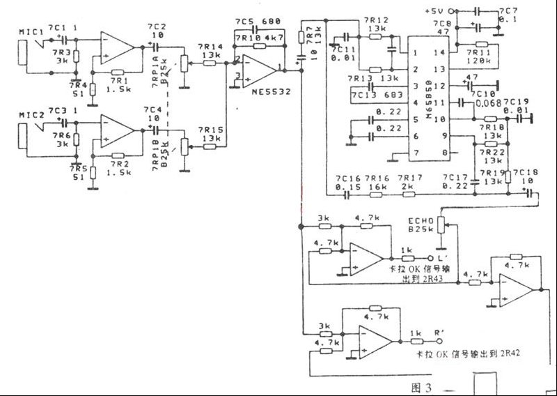 | 一、电路原理分析 湖山AVK100型AV放大器采用了全分立元件的主声道功放电路(见图2)。 此电路继承了湖山公司的高保真放大器设计经验和对放音性能的重视,加之在用料上毫不含糊,故此机的放音质量极高,输出功率足(100W×2),可满足音响爱好者欣赏音乐的需要。此机还设有信号直通模式,在此模式CD/LD信号从输入插口输入后,可绕过信号源选择电路、前置放大电路和信号处理电路,直通到后级功放电路。这就更能达到音响发烧友欣赏“原汁原味”音乐节目的要求。 此机采用多功能遥控电路和大型荧光显示屏,外形美观大方,使用操作也很方便。 AVK100机采用了M69032杜比定向逻辑解码电路和性能优良的M65830延时电路,中置和环绕功放均采用美国NS公司的优质功放IC LM3886,因此以优良的性能取得杜比公司的认证。AVK100机还带有性能优良的卡拉OK电路(电路图见图3),可满足家庭卡拉OK演唱的要求。 二、AVK100放大器的检修实例 1.收到其他维修同行的一台返修机,环绕声道无输出。 经测试环绕声道功放的输入端无信号输入。进一步检测M69032的29脚也无环绕声信号,测39脚却有经解码的环绕声信号输出。由此可判断出可能是延时电路的故障。经检查发现M65830 17、18脚的接地电容坏,更换后可恢复正常。有一批AVK100机的延时电路采用PT2398,其中也发现有极少数PT2398损坏的情况。 2.收到其他维修同行的一台返修机在噪声测试状态时,左声道无声。 经测试左声道的功放电路的工作状态正常,输入信号检测,左声道功放输出端也有信号输出。进一步检查发现系保护继电器接触不良。更换继电器后即可修复。 3.收到其他维修同行的一台返修机,噪声测试各声道均正常发音,但在两声道状态时左声道无声,信号直通状况正常。 从整机原理分析,信号直通状态时是绕过了音源切换和信号处理电路的。故此故障可能是音源切换或信号处理电路不正常引起的。测试M69032 32脚无输出,再检测15脚也无信号输入。此时故障可能在音源切换电路(4051)或前置放大电路上。进一步检查发现系左声道信号通道上的电阻2R23断路。 4.收到其他维修同行的一台返修机,在杜比定向逻辑模式下工作正常,但在信号直通模式时左声道无声。 此故障大多是信号直通继电器接触不良造成的,更换继电器后可修复。 5.环绕声道声音时有时无。 若测试M69032 29脚的环绕声输出信号正常,可进一步检查环绕声功放的信号输入或信号输出接插件有无接触不良的问题。有时环绕音箱的阻抗过低(如4欧姆,两个环绕音箱并联工作,只有2欧姆),造成功放电路LM3886过热,电路内的保护电路动作,也会造成声音时有时无。 6.开机后所有声道均无声。 此故障应先检查电源电路是否正常,或观察显示屏是否显示正常。显示屏正常显示,说明电源变压器基本正常。再检测主声道功放和中置、环绕声道电源是否正常。由于此放大器的保护电路是由一片TA7317P完成的,一般来说只要任一声道的输出端出现直流电压,保护电路即可动作,断开所有音箱,造成所有声道均无声。常见的故障是某一个声道的电源出现故障(如某一个滤波电容失效、整流二极管断路)使正、负电源不对称,造成功放输出端电位偏移。 7.卡拉OK演唱时无混响。 此故障可能是延时电路M65830失效或混响电位器损坏引起的。最好先检测该部分电路的电源电压是否正常。 8.其它常见故障: 输出信号中夹杂交流声故障,通常是电源滤波电容失效。 开机烧保险丝通常是主声道功放管烧坏或电源变压器内部短路。 杜比解码电路出现故障时,通常是外接的0.1uF电容失效。很少有M69032损坏的情况。延时电路不工作时,通常也是外接电容器失效。 |