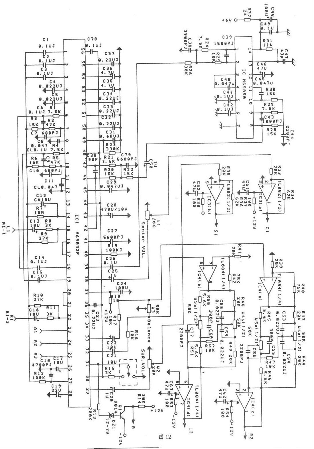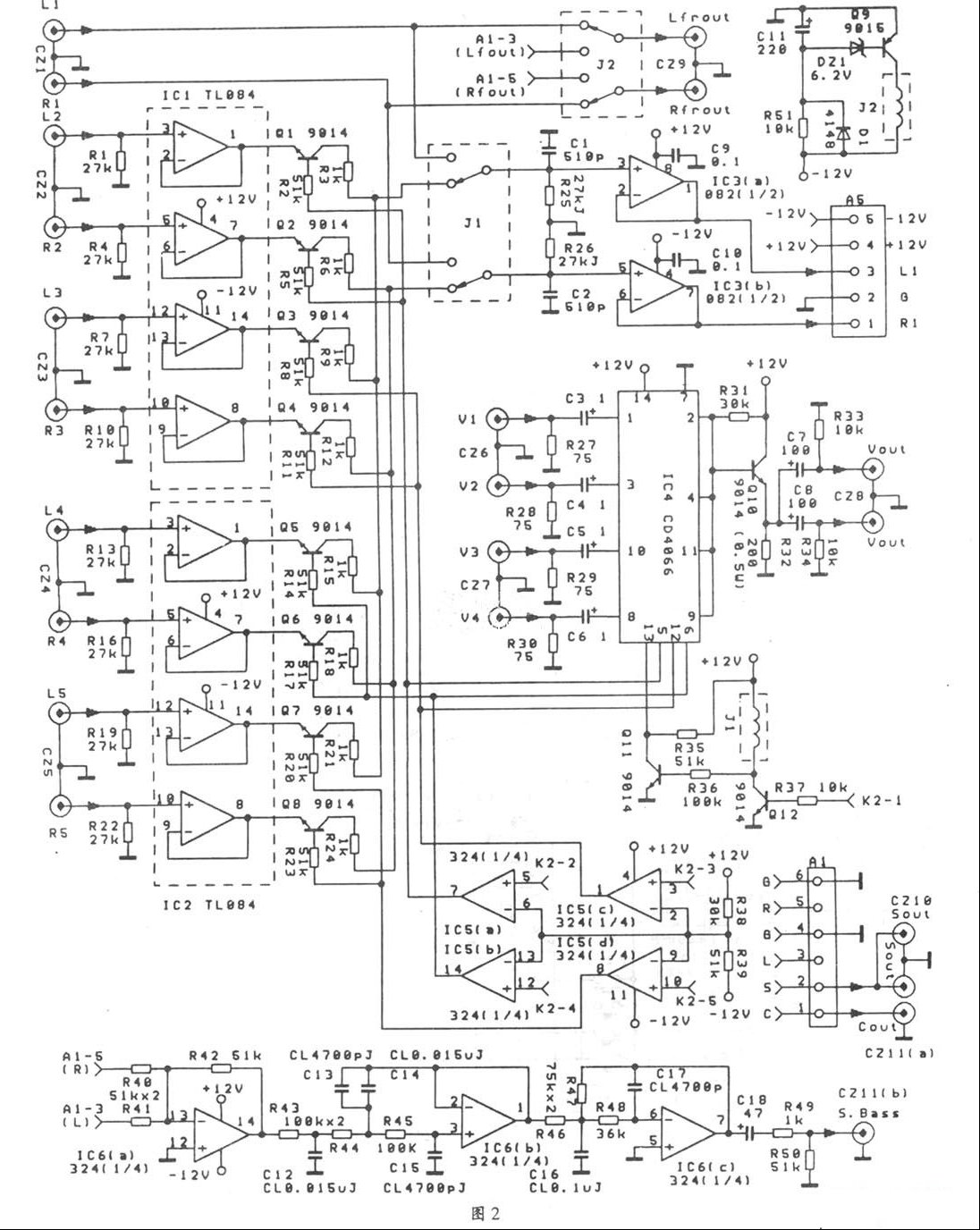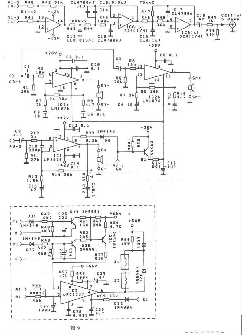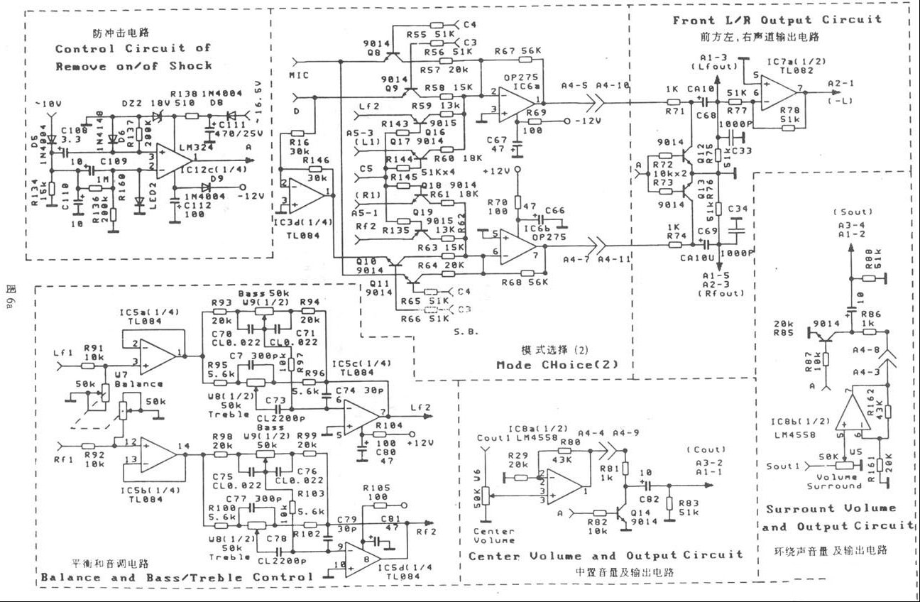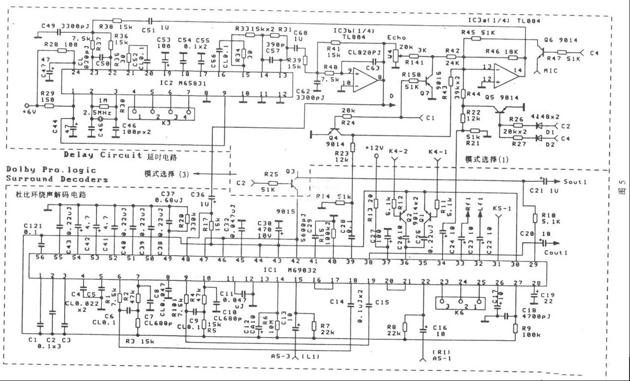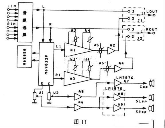 | 天逸牌AD-5100A型和AD-3100A型杜比定向逻辑解码AV放大器,是成都亚迪机电研究所开发生产的一种新型家庭影院设备,已获得杜比实验室认证,其中AD-5100A型是带有五声道功放的AV放大器,而AD-3100A型只带有中置声道和环绕声道功放,其余电路均完全相同。 一、天逸AD-5100A型、AD-3100A型放大器性能及特点简介 AD-5100A/AD-3100A机的主要性能指标如下: 输出功率:主声道(AD-5100A)80W×2(RMS) 中置声道 50W(RMS) 环绕声道 25W×2(RMS) 信噪比:(AD-5100A) >90dB(A计权) 频率响应:(AD-5100A) 25Hz~50kHz(-3dB) 失真度:(AD-5100A) <0.1%(主声道20Hz~20kHz。50W) 声道分离度:(杜比解码)典型40dB,最小25dB 动态裕度:>15dB 此外,它们还具备杜比定向逻辑解码所必须的全部功能,包括输入自动平衡电路,自适应矩阵解码电路,修改型杜比B降噪电路,数码延时,测试噪声发生器,各声道独立的音量调节和四联同步调整音量控制器等,同时还设置了两种DSP数码声场处理模式,可以在放送任何类型软件的情况下(包括杜比软件、普通立体声软件和单声道软件),均能得到较好的环绕声效果,此机还带有性能较好的卡拉OK电路,采用数码混响,两路话筒输入,话简信号激励等,卡拉OK演唱效果较好。 设有Hi-Fi工作模式,在此模式时输入信号直达后级音量控制,使电路具有较好的保真度和信噪比,而AD-3100A型可外接收到其他维修同行的一台高保真纯功放后组成家庭影院系统,并具有“关机信号直通”功能。AD-5100A型的主功放采用分立元件的超甲类偏置方式放大器,消除了开关失真。 二、AD-5100A/AD-3100A电路原理简析 1.电路方框图(见图1) 图1中标注的信号额定电平和增益分配数据可以供专业技术人员和音响爱好者制作AV设备时参考。下面先以方框图谈谈整机工作原理。 音源信号从音频输入插座输入。经音源选择电路选择后送入杜比定向逻辑解码器进行解码处理。输出左、右前方声道(Lt、Rt)、中置声道(C)、环绕声道(S)信号以及左、右声道和信号(Lt+Rt)。其中前方声道信号送入到平衡和音调控制电路进行调控,再经主音量控制调控音量,送入主功放电路放大后输出到主声道音箱放音(仅对AD-5100A型,AD-3100A型机则直接输出左、右主声道信号到外接主功放)。当整机选择双声道工作模式(即2CH模式)时,解码器输出的C、St、Lt信号均关闭,使整机工作在普通立体声放大器状态,图上的控制电路可控制杜比解码器的工作状态,包括中置声道模式控制和DSP模式与杜比解码的转换等。 在杜比定向逻辑解码工作模式时,解码器输出的中置声道信号(即C信号)经中置声道音量控制后,先经20dB放大,再经四联主音量电位器中的单独一联调控中置声道音量后,送入到中置声道功放电路放大,经中置音箱放音。解码器输出的环绕声信号(即S信号)先经信号选择,再送入数码延时电路进行20ms延时处理。延时电路输出信号再送回M69032内的修改型杜比B降噪电路进行降噪处理。然后经信号选择和环绕声音量控制调控以后再放大,被送入主音量控制电位器中的一联进行同步音量控制后,输出到环绕声道功放,经环绕音箱放音。延时电路中有一回声(ECHO)反馈环路,此环路仅在卡拉OK状态和DSP状态时工作,以得到一定的混响效果,但是在杜比解码状态时此环路关断,以满足杜比定向逻辑解码的要求。 在卡拉OK工作状态时。两路话筒信号输入后,先经放大和信号选择电路,再送入延时混响电路对话筒信号进行处理,经延时混响处理后的话筒演唱信号,从主音量控制电位器之前混入到音乐信号通道,最后经功率放大后输出到音箱放音。 2.信号输入选择电路(见图2) AD-5100A/AD-3100A机有五组音频信号输入端子,每组输入端子(CD/VCD除外)输入的信号均经过一个运放(1/TL084)接成的跟随器,再经开关管(Q1-Q8)和继电器J1控制,送人到IC2(TL082)。经IC3跟随后的音频信号通过接插件A5送入到后级。 图中J2为关机信号直通控制继电器。当电源未接通时,图中Q9截止,继电器J2的常闭触点接通,使CD/VCD输入信号直通到左、右主声道信号输出端子(Lfrout、Rfrout),这样可使信号在关机时不经过任何信号处理电路而保持最高的保真度。 输入信号选择都是由K2—1~K2—5输出的电平控制的(下节将介绍)。开机时,K2—1输出高电平,使J1吸合,CD/VCD输入信号经J1送入IC2,经IC3跟随后,输出到后级。依此类推,当信号选择按钮LD按下后,K2—2为高电平(’K2—1转为低电平),Q1和Q2的基极得到正偏置而导通,使LD的左、右声道信号通过,经j1常闭触点送到IC3,然后输出到后级。为了满足控制Q1~Q8开关管通、断所需电平的幅度和极性,这里又加入了由IC5(LM324)四运放接成的四个电平转换电路,都接成正相输入的电压比较器,可将K2—1~K2—5控制信号转换后去控制音源转换电路。 ICA(CD4066)接成视频信号转换电路,由K2—1~K2—4的电平控制,因此四路输入的视频信号可与四路音频信号进行同步转换。CD4066的第13脚控制第①、②脚通断,第⑤脚控制第③、④脚通断,第⑥脚控制第⑧、⑨脚通断,第12脚控制第⑩、11脚通断。当开机时,音源选择自动置CD/VCD,K2—1为高电平,使Q12导通;Q12集电极呈低电平,使Q11截止;Q11集电极呈高电平,使ICA第⑩脚控制的第①、②脚导通,这样就使V1的视频输入信号经射随器Q10送到视频输出端Vout1和VOut2。同理,当选择LD、VFR、TV时,相应的控制输出K2—2、K2—3、K2—4分别呈高电平,这样就可以分别选择V2、V4视频输入信号。可与音源选择同步控制的视频选择电路是AV放