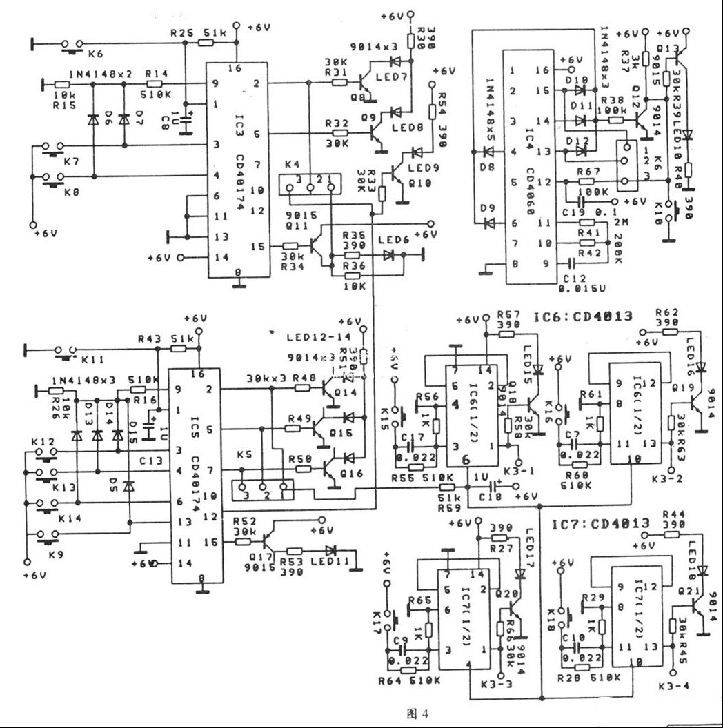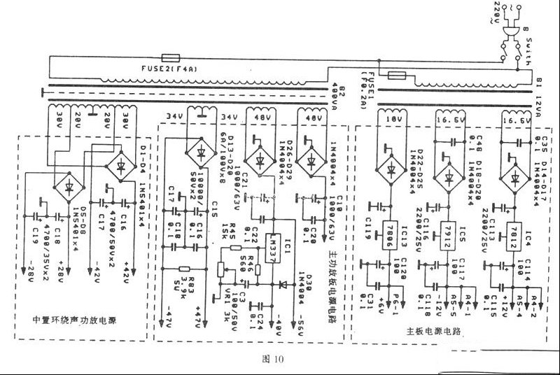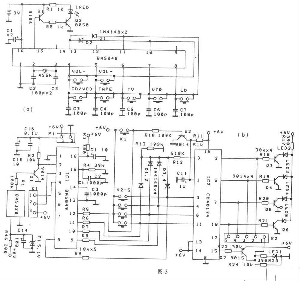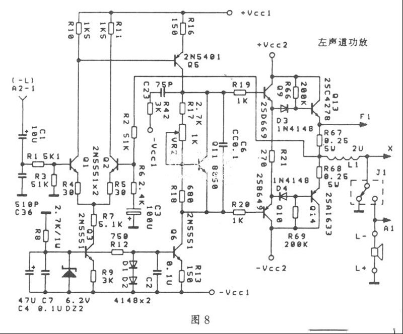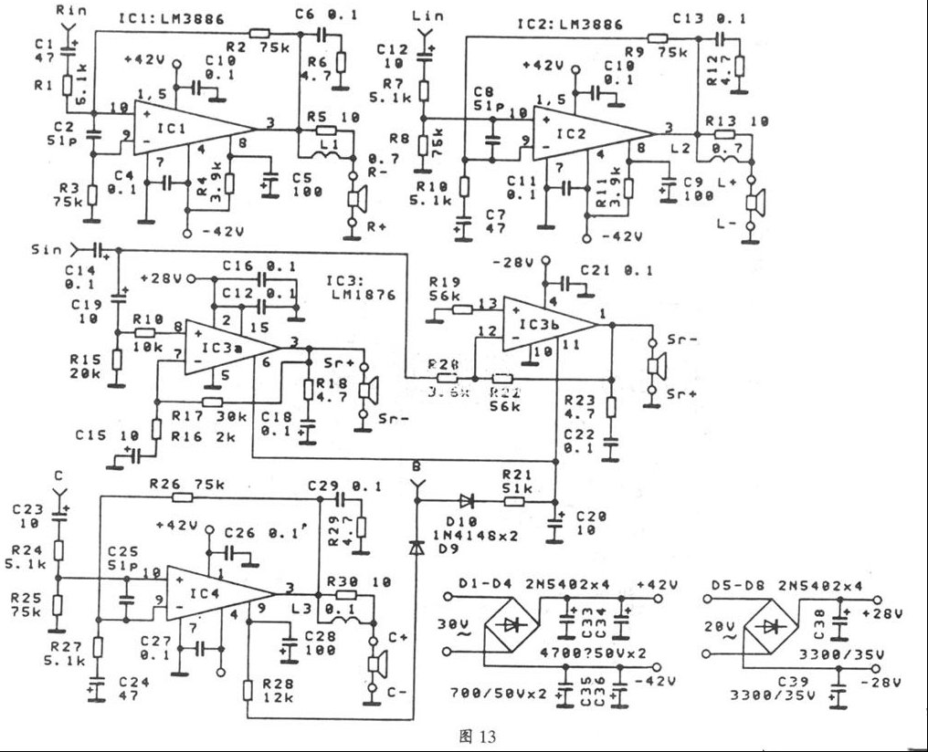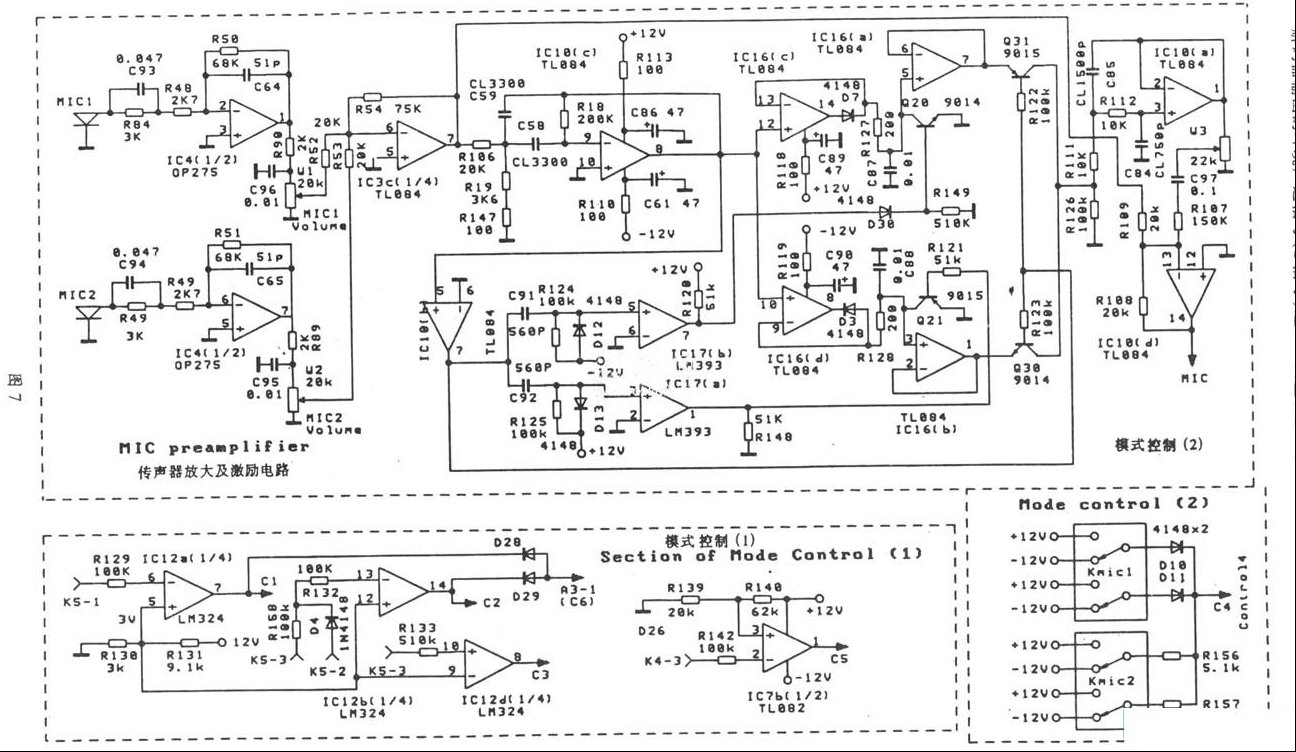 | 天逸牌AD-5100A型和AD-3100A型杜比定向逻辑解码AV放大器,是成都亚迪机电研究所开发生产的一种新型家庭影院设备,已获得杜比实验室认证,其中AD-5100A型是带有五声道功放的AV放大器,而AD-3100A型只带有中置声道和环绕声道功放,其余电路均完全相同。 一、天逸AD-5100A型、AD-3100A型放大器性能及特点简介 AD-5100A/AD-3100A机的主要性能指标如下: 输出功率:主声道(AD-5100A)80W×2(RMS) 中置声道 50W(RMS) 环绕声道 25W×2(RMS) 信噪比:(AD-5100A) >90dB(A计权) 频率响应:(AD-5100A) 25Hz~50kHz(-3dB) 失真度:(AD-5100A) <0.1%(主声道20Hz~20kHz。50W) 声道分离度:(杜比解码)典型40dB,最小25dB 动态裕度:>15dB 此外,它们还具备杜比定向逻辑解码所必须的全部功能,包括输入自动平衡电路,自适应矩阵解码电路,修改型杜比B降噪电路,数码延时,测试噪声发生器,各声道独立的音量调节和四联同步调整音量控制器等,同时还设置了两种DSP数码声场处理模式,可以在放送任何类型软件的情况下(包括杜比软件、普通立体声软件和单声道软件),均能得到较好的环绕声效果,此机还带有性能较好的卡拉OK电路,采用数码混响,两路话筒输入,话简信号激励等,卡拉OK演唱效果较好。 设有Hi-Fi工作模式,在此模式时输入信号直达后级音量控制,使电路具有较好的保真度和信噪比,而AD-3100A型可外接收到其他维修同行的一台高保真纯功放后组成家庭影院系统,并具有“关机信号直通”功能。AD-5100A型的主功放采用分立元件的超甲类偏置方式放大器,消除了开关失真。 二、AD-5100A/AD-3100A电路原理简析 1.电路方框图(见图1) 图1中标注的信号额定电平和增益分配数据可以供专业技术人员和音响爱好者制作AV设备时参考。下面先以方框图谈谈整机工作原理。 音源信号从音频输入插座输入。经音源选择电路选择后送入杜比定向逻辑解码器进行解码处理。输出左、右前方声道(Lt、Rt)、中置声道(C)、环绕声道(S)信号以及左、右声道和信号(Lt+Rt)。其中前方声道信号送入到平衡和音调控制电路进行调控,再经主音量控制调控音量,送入主功放电路放大后输出到主声道音箱放音(仅对AD-5100A型,AD-3100A型机则直接输出左、右主声道信号到外接主功放)。当整机选择双声道工作模式(即2CH模式)时,解码器输出的C、St、Lt信号均关闭,使整机工作在普通立体声放大器状态,图上的控制电路可控制杜比解码器的工作状态,包括中置声道模式控制和DSP模式与杜比解码的转换等。 在杜比定向逻辑解码工作模式时,解码器输出的中置声道信号(即C信号)经中置声道音量控制后,先经20dB放大,再经四联主音量电位器中的单独一联调控中置声道音量后,送入到中置声道功放电路放大,经中置音箱放音。解码器输出的环绕声信号(即S信号)先经信号选择,再送入数码延时电路进行20ms延时处理。延时电路输出信号再送回M69032内的修改型杜比B降噪电路进行降噪处理。然后经信号选择和环绕声音量控制调控以后再放大,被送入主音量控制电位器中的一联进行同步音量控制后,输出到环绕声道功放,经环绕音箱放音。延时电路中有一回声(ECHO)反馈环路,此环路仅在卡拉OK状态和DSP状态时工作,以得到一定的混响效果,但是在杜比解码状态时此环路关断,以满足杜比定向逻辑解码的要求。 在卡拉OK工作状态时。两路话筒信号输入后,先经放大和信号选择电路,再送入延时混响电路对话筒信号进行处理,经延时混响处理后的话筒演唱信号,从主音量控制电位器之前混入到音乐信号通道,最后经功率放大后输出到音箱放音。 2.信号输入选择电路(见图2) AD-5100A/AD-3100A机有五组音频信号输入端子,每组输入端子(CD/VCD除外)输入的信号均经过一个运放(1/TL084)接成的跟随器,再经开关管(Q1-Q8)和继电器J1控制,送人到IC2(TL082)。经IC3跟随后的音频信号通过接插件A5送入到后级。 图中J2为关机信号直通控制继电器。当电源未接通时,图中Q9截止,继电器J2的常闭触点接通,使CD/VCD输入信号直通到左、右主声道信号输出端子(Lfrout、Rfrout),这样可使信号在关机时不经过任何信号处理电路而保持最高的保真度。 输入信号选择都是由K2—1~K2—5输出的电平控制的(下节将介绍)。开机时,K2—1输出高电平,使J1吸合,CD/VCD输入信号经J1送入IC2,经IC3跟随后,输出到后级。依此类推,当信号选择按钮LD按下后,K2—2为高电平(’K2—1转为低电平),Q1和Q2的基极得到正偏置而导通,使LD的左、右声道信号通过,经j1常闭触点送到IC3,然后输出到后级。为了满足控制Q1~Q8开关管通、断所需电平的幅度和极性,这里又加入了由IC5(LM324)四运放接成的四个电平转换电路,都接成正相输入的电压比较器,可将K2—1~K2—5控制信号转换后去控制音源转换电路。 ICA(CD4066)接成视频信号转换电路,由K2—1~K2—4的电平控制,因此四路输入的视频信号可与四路音频信号进行同步转换。CD4066的第13脚控制第①、②脚通断,第⑤脚控制第③、④脚通断,第⑥脚控制第⑧、⑨脚通断,第12脚控制第⑩、11脚通断。当开机时,音源选择自动置CD/VCD,K2—1为高电平,使Q12导通;Q12集电极呈低电平,使Q11截止;Q11集电极呈高电平,使ICA第⑩脚控制的第①、②脚导通,这样就使V1的视频输入信号经射随器Q10送到视频输出端Vout1和VOut2。同理,当选择LD、VFR、TV时,相应的控制输出K2—2、K2—3、K2—4分别呈高电平,这样就可以分别选择V2、V4视频输入信号。可与音源选择同步控制的视频选择电路是AV放