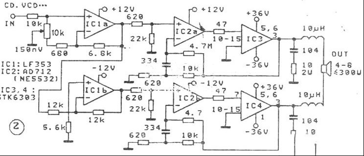 | STK6303是三洋公司的一种大功率厚膜集成电路,一块电路分或A、B两面,在国内尚很鲜见。估计是专用于某些进口大功率变频调速用马达伺服。笔者通过反复试验,发现用其B面(见图1)做后级功放的电流放大,用发烧运放作激励,再用二个型号为AA12480、输出为DC36V4.2A的进口开关精密稳压电源,作成一款发烧功放,效果极佳。 电路如图2,这是一部极简洁的准直流BTL300W合并功放,稍加改动,也可接成OCL100W+100W的大功率立体声功放。其中IC1a为负反馈式音量控制,增益约为0-10倍可调。IC1b为增益为1的反相器,IC3、IC4分别为STK6303F,接成准直流功放模式,增益约15倍,且与上述电路配合,接成BTL形式,输出灵敏度约为150mV,可在4欧负载得到约300W的不失真功率输出,足以推动任何家用大音箱。 该放大器装配简单,不用调试,其开关电源自带过压过流过热保护。装配时注意厚膜电路的散热一定要足够,有条件最好能用仪表风扇强制风冷。 |