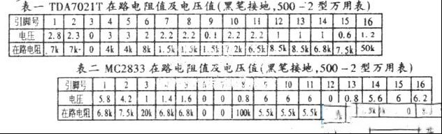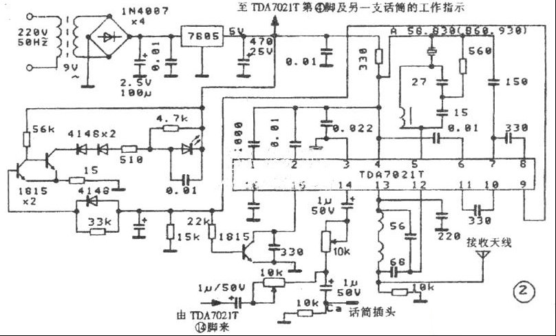 | 概述:ICM-306无线麦克风系统是由ICM-306接收机和ICM-306A、B手持话筒发射器组成,可用于任何卡拉OK或扩音系统。笔者依据实物寻找相关资料后将实际电路绘制如下。 上图1中的话筒发射器集成电路是莫托洛拉公司的MC2833 图中MC2833⑤脚为话筒信号放大器输入端,15、16脚为射频振荡,经调制后的话筒信号送入缓冲器,14脚外接吸收回路,⑧脚内接发射管,⑨脚输出调频发射信号。调节①脚和16脚所接L或晶振可改变振荡频率,从而使发射与接收频率相一致。Ic⑩脚为电源,9V电池供电。ICM-306的麦克风接收器(图2)的Ic型号为TDA7021T,在ICM-306接收器中采用了两片这样的块子分别为A话筒和B话筒解调。接收天线接收的信号经。TDA7021T 12脚送入,经解调后14唧送出,A、B两话筒的音频信号经Ca混合由同一话筒插头输出。接收器中发光二极管唯有在发射与接收频率相一致时才被点亮。改变Ic⑤脚所接L与晶振可使其接收频率与发射频率相一致。为避免A话筒和B话筒的相互干扰,厂家使用了不同的相差一定频率的晶振,而且两组话筒在电路上也相互蚀立。 |