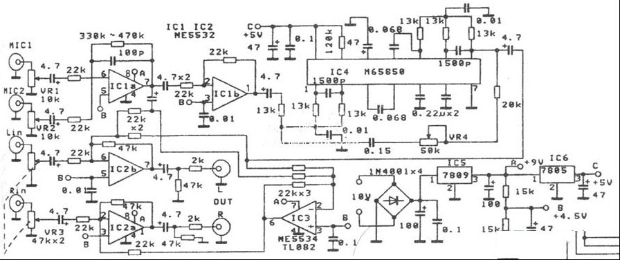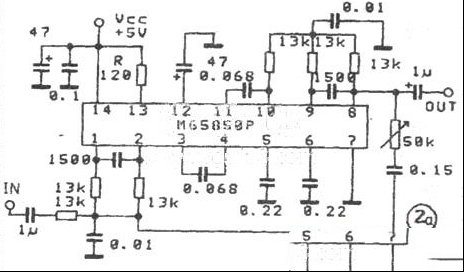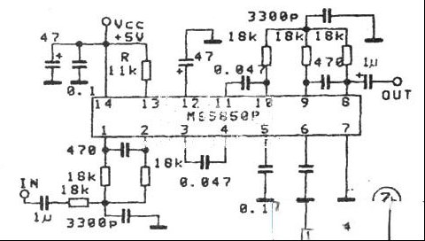 | 家电维修小编给大家分享这篇文章介绍的数码卡拉OK处理电路M65850P由日本三菱公司97年推出,内含输入、输出低通滤波器、A/D、D/A变换器和SRAM静态存贮器、时钟振荡器以及自动复位、开机静音、延迟、主控逻辑电路等,内部方框图见图1。该电路采用ADM对音频信号进行A/D、D/A转换处理,并使用内置20kB的SRAM静态高速存贮器进行信号存贮,此种数字模拟处理方式最大特点是用较小的存贮器容量,也能达到高效低失真的处理效果,属目前性价比高的优秀数码处理方式。在处理环绕声信号时,其总谐波失真小于0.2%,在作卡拉OK混音处理时,其总谐波失真小于1.2%。 M65850P采用双列直插式14脚塑料封装。典型应用见图2a、2b,电路中R决定延迟时间约164ms,带通频率约5kHz,主要用于卡拉OK处理电路。在图2b中,R为11k时,延迟时间约20ms,带通频率约7kHz,主要用于环绕声信号处理。 图3为M65850P用于卡拉OK的典型电路,电路设置有VR1、VR2话筒音量控制,VR3音乐输人信号控制,VR4回响次数深度控制,电路延迟时间约164ms,带通频率约5kHz。该电路混响性能优于M50195P,并可与M65831AP比美,而它的售价则为M65831的一半,确实物超所值。 |