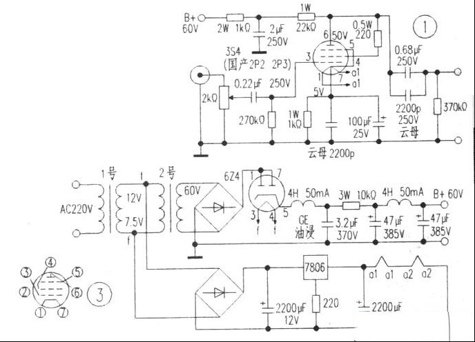 | 欧美产电子管3S4,是上世纪五六十年代非常著名的直热式小7脚强放管,屏极呈银白色。别看它个头小,功能却强大,一只3S4做成的再生式发射电路,可以轻易地将电波送到境外。那个年代玩电子管单管收音机,朝思暮想购买一只3S4,不但价格很贵买不起,而且还要公安局的证明。老一辈无线电爱好者中,一提起3S4,眼睛里都会放射出神秘的光芒。 这么好的胆管,能不能用来做音频放大器呢?不少胆机发烧友都觉得,直热式电子管比旁热式的声音好听;灯丝电压低的比灯丝电压高的声音温暖。3S4正好符台这两点。笔者经过几个月的实践,采用两只3s4精心制作出收到其他维修同行的一台袖珍胆前级(电路见图1),底座利用一只废弃的USB声卡外壳改造,宽140mm,深150mm,高120mm(正好是油浸电容高度)。该机外观小巧玲珑,像一件艺术品(实物照片见图2),每每把玩有加,非常喜爱。用其推动胆功放后级,声音靓丽,胆昧浓郁,别有一番风味。自认为是满意之作,现介绍如下,供发烧友参考。 一、3S4的技术参数: 类型:直热式阴极五极管 主要用途:功率放大 灯丝电压(Uf)=2.8/1.4V 灯丝电流(If)=0.05/0.1A 第一栅极电压(Ug1)=7V 跨导(S)=1.8mA/V 内阻(Ri)=100k (A类单端放大直用数据): 阳极电压(Ua)=90V 阳极电流(Ia)=7.4mA 第一栅极驱动信号电压(Ug1rms)=5V 第二栅极电压(Ug2)=67.5V 第二栅极电流(Ig2)=1.4mA 阳极负载阻抗(ZL)=8k 输出功率(Po)=0.27W 3s4的代换型号:3S4T、3Q5。国产相似可代换型号:2P2、2P3(3S4是五极管,2P2、2P3足四极管,注意区别管脚接线)。引脚图见图3。 二、电路特点 3S4按三极管接法,屏极电压45V-90V都能够正常工作,可根据自己手里的电源变压器选择屏极电压,电阻全部采用AB碳精电阻,AB碳精电阻虽然误差较大,但声音温暖淳厚,特别是低频和中频的表现极佳。输出隔直耦合电容采用国产CZM型的方块电容,耦合电容和阴极旁路电容均并联云母电容,有利于提升高音。阴极旁路电容采用国产的轴向引线电解电容,取其声音平衡。音量调节采用两只单连电位器分别控制两个声道。灯丝采用直流供电,两只3S4灯丝串联供电,实际测量每只3S4灯丝电压2.9V,屏压50V,屏流5mA。 三、制作过程 电源变压器利用现成的两只220V/7.5V/12VA R型变压器改造。改造步骤是将两只R型变压器分别编号为1号和2号,1号是主变压器,2号是升压变压器。在2号变压器线圈外面用φ0.20mm漆包线穿绕54匝,与已有的7.5V绕组串联,得到12V电压绕组,作为升压变压器的初级。 连接时注意同名端,简单实用的检测方法是:将新绕线圈的一根出线与原7.5V的任意一根出线连接,次级接220V市电,用万用表电压挡测量两组线圈其余2根出线的电压,如果读数为12V左有,说明连接正确,如果读数为4.5V左右,说明同名端接反,只需将其中一个线圈的引线对调就行了。 两只变压器的连接方法为:1号变压器的初级绕组接市电220V,次级7.5V绕组接2号变压器的初级12V绕组,组成一只升压变压器。2号变压器的次级原220V绕组输出大约60V的交流电压,首先经摩托罗拉快恢复二极管进行桥式整流,然后进入6Z4二次整流软化,从6Z4输出的直流直接进入第一级扼流圈,经过LCRCLC的三次滤波网络,输出60V的B+电压,供3S4屏极使用。调整10k电阻可以改变B+电压。6Z4灯丝接ff点,也就是1号变压器的次级,满负载时电压6V左右。 两只扼流圈用舌宽12mm,叠厚25mm的小铁芯,φ0.15mm的漆包线绕2600匝,硅钢片顺插,空气隙0.1mm。 3S4灯丝采用摩托罗拉快恢复二极管进行桥式整流,因为3V的稳压集成块不好找,所以将两只3S4的灯丝串联供电。在调试7806稳压输出过程中,发现其带负载输出电压才4.2V,于是在7806的接地端串联一只220Ω电阻,抬高其电位,使其带负载输出电压达到5.8V,满足3S4灯丝需要,如果用金封的7806更好。灯丝滤波电解电容选用金色ERO或者思碧,滤波效果会好一些。前级放大只画出一个声道,电源部分共用。 本机耗电极省,整机功耗不大于12W。 |