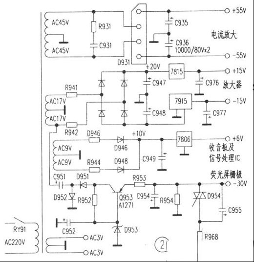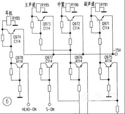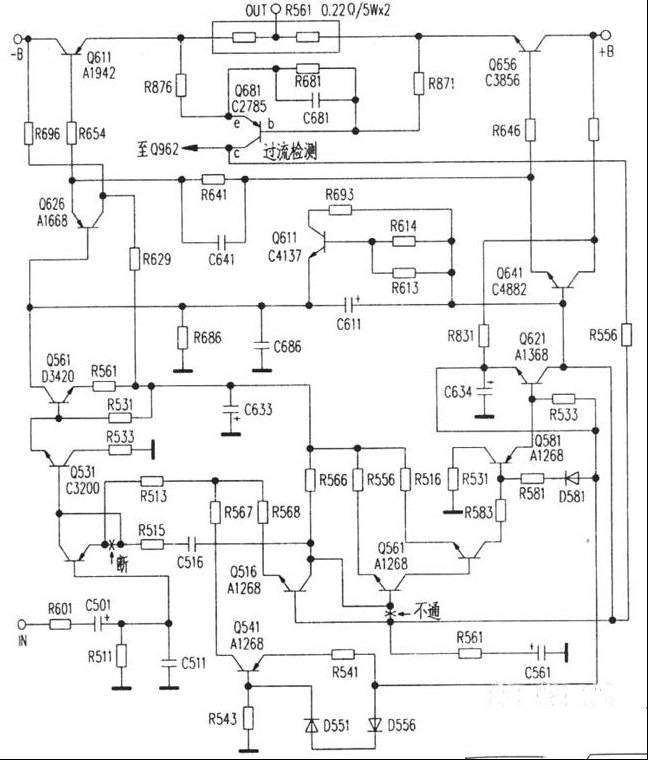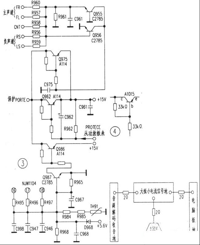 | 笔者收到同行送来的故障机壹台马兰士SR5000型AV功放,其损坏原因为发烧友在摩机时喇叭输出板孔插错位,导致烧坏,开机没有反应。 该机有两个变压器,辅变压器为CPU与交流开/关机继电器RY91供电,安装在一块小的稳压板上。这个板子有RY91继电器。该板电路图实测如图1所示。 辅变压器次级电压为AC15V,经桥式整流滤波后输出直流电压为+18V。通过Q901稳压后得+12v直流电压。+12v电压有两路负载:一路是交流继电器RY91,由Q903控制(Q903由CPU控制。CPU型号为MP87MP178B);+12V另一路通过Q902稳压得到+5.6V直流电压。在交流继电器未吸合前,整机只有+5.6V电压。由CPU发出POWER—ON信号,使RY91吸合,主变压器得交流电压.对整机进行供电。 主变压器供电系统图实测如图2。 其次级交流45Vx2绕组,整流滤波后,获得+55V电压,供功放板用:17V×2绕组整流滤波后得+20V。通过7815、7915三端稳压器稳压后得±15V电压,供运算放大器用;9Vx2绕组整流滤波后,得+10V直流电压,经7806稳压得+6V电压。此电压供收音板及大板IC用电。交流3Vx2供屏光屏灯丝用电。屏光屏栅极-30V电压是由AC17V绕组倍压整流Q953稳压后获得。 屏光屏发光必要条件是CPU发出开机信号,有交流3V电压,栅极有-30V电压。由于交流继电器RY91不吸合,主变压器初级无电,故灯丝、栅极电压均无,所以屏不亮。测Q903的b极POWER—ON信号电压为零。测903的c极电压有+12V电压。但对CPU供电的+5.6V电压为0V。测稳压调整管902的c、e极开路。用2SD669代用后开机,测+5.6V正常。但仍三无。 用导线强制短接一下RY91触点,荧光屏亮一下,又马上黑了。强制开机测±55V正常,说明主变压器正常,功放板没有短路现象。拔去从电脑板到大板29芯排线,这时交流继电器能吸合,荧光屏可显示信号切换,调音量等面板操作信息正常,说明CPU工作正常,问题出在大板上。 排线共9芯,全用上了,其中值得关注的是29 SP-ON主声道喇叭控制,28 MUTE静音,27 S—ON副声道喇叭控制,26 PORTE保护。保护接口PORTE扩展电路实测如图3。 保护接口吸收了4路保护信号:第1路为功放过压保护:第2路为功放过流保护;第3路为信号处理板工作不正常保护;第4路为主变压器过热保护。 过压保护工作原理:5个声道输出口都接有32k电阻到检测三极管Q955的c极及Q956的b极。这5个声道只要有1个声道输出端超过了+0.7V电压,则Q956导通、Q957导通,PORTE口为+15V电压,CPU发出关机命令。当输出端出现-0.7V电压时,Q955导通、Q975导通,CPU也发关机命令。 当功放板输出管电流大于0.7V时电流检测管Q681导通,-B电压经降压后加到Q962的b极,Q962导通,CPU发出关机命令。 当信号处理板正常时IC NJW11041 16、17、18(CSB、CS、AD0)电压为-4.7V,检测三极管截止:当信号处理板异常,CSB、CS、AD0为正电压时,Q987导通,CPU发出关机命令。 主变压器过热保护通过热敏电阻TH91检测。TH91紧紧安装于铁芯上,其正常阻值300Ω。当大变压器过热时,TH91阻值增大使Q987的b极电压抬高,使Q987导通,再使Q986导通,CPU发出关机指令。 断开功放板,以排除过压过流保护,继电器RY91仍不吸合。测PORTE口为+13V电压。说明大板有保护电压。依次小心焊下保护输出管。当拨到Q962时PORTE口+13V电压消失。测Q962的c—e极击穿。Q962型号为A114,是带偏置电阻的复合管。不能用普通PNP三极管代换,否则,一装上便烧,可按图4方法解决。把改装后的A1015装上原位,开机,荧光屏显示正常。但装上功放板,仍不能交流开机。说明功放有过压或过流故障。 该机5路功放电路线路完全相同,所用元件也相同。只要实测出一个声道即可了解其他声道。实测R声道电路原理图如图5。 该功放电路很有特色。它没有采用平常所见差分输入电路,而是采用全对称,直流耦合,带中点电压校正交直流负反馈电路。输出对管采用名管:A1942/C3856。推动中功率管采用A1668/C4882。该放大电路有过流检测管Q681。当A1942/C3856过流时,Q681导通,其c极会出现负电压,使保护管Q962导通,CPU发出关机命令。 由于开机仍然三无,在线测主板大功率管(用数字万用表二极管挡检测),发现中置声道输出管击穿开路,再测推动管A1668/C4882也开路。大功率管用A1186/C2837(150V,10A,100W)代换,中功率管用A1859A/4883A代。不接音箱,开机,交流继电器RY91吸合,荧光屏显示正常。把音箱接好,输入CD信号,各声道推动音箱发出优美音乐。 马兰士SR500E/KIG喇叭控制继电器电路如图6所示。 CPU检测输出门电压电流正常后,HEAD-ON,S-ON,SP-ON发出+4.7V电压,四个继电器吸合。 马兰士SR500E/KIG AV功放有四个地,如上图7所示。 |