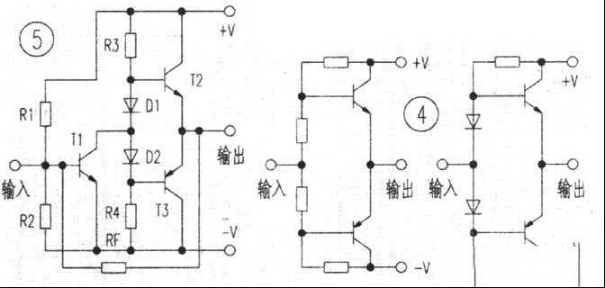 | 一、功放的基本原理与电路组成 功率的大小取决于电压和电流的乘积,因此要进行功率的放大,不仅要放大信号的电压,还要放大信号的电流,为了完成功率放大器的电压和电流的放大,可以先用共射电路对信号的电压进行放大,再用共集电路对信号的电流进行放大。 二、功放电路的形式 三极管的共集电路有一个十分重要的特点:射极的电压始终比基极低一个固定的0.7V,如图1所示电路,如果在它的基极加上一个输入电压,它的射极就会对负载电阻输出一个比输入电压低0.7V的电压,如果改变负载电阻的阻值,这个电压是不会变化的(实际上是变化很小)。这就给我们一个方便,如果将负载电阻设得很小,为了保证有足够的电压输出,三极管就必须从射极输出足够大的电流,这就是为什么共集电路具有电流放大能力的缘故。 如果三极管是NPN型,它只对基极输入的正极性电压进行放大,负电压会使它截止,因此使用NPN型三极管只能放大信号的正半周;同理,如果三极管是PNP型,则它只具有放大信号负半周的能力。为了能使信号的所有部分都得到放大,就必须将两种三极管配合起来使用,这就是互补对称型的功率放大器,简称OCL电路,如图2所示。 但这个电路有一个闻题,三极管的基极都有一个0.7V的死区电压,如果信号小于死区电压,则发射极不会有输出,这会使互补对称的输出电路产生交越失真,如图3所示。 为了解决这一问题,可以通过真流电路使每个三极管都有一个避开死区电压的偏置电压。NPN型三极管给一个正的略高于0.7V的偏置电压,而PNP型三极管则给一个略低于0.7V的负偏置电压,这个电路既可以使用电阻,也可以使用二极管,还可以两者都使用,如图4所示。 再加上前面的共射电压放大器,以及为了保汪电路正常工作和提高放大质量的反馈电路,音频功率放大器的基本组成如图5所示。电路中,T1的作用是进行电压放大,T2、T3的作用是进行电流放大,两个放大一起构成了功率放大。请注意,这个电路仅是基本骨架,它还难以胜任工作,但可以帮助你理解功率放大器的电路构成。 三、功放电路的两个要点(1)电路要采用双电源供电,两个电源电压相同,极性相反。但有时并不方便使用双电源,此时可以采用单电源供电的方式,但输出必须加上一个隔离用的电容(该电容器还有供电的作用),简称OTL电路,如图6所示。 (2)T2和T3的两个基极间的电路是保证两只三极管进入微导通(即避开死区)的偏置电路,这个电路不允许开路,一旦开路,会使上面的NPN三极管获得很高的正偏置、下面的PNP管获得很高的负偏置,结果是两只三极管都进入饱和状态,产生极大的电流,极易导致三极管的损坏。 四、功放电路调试的两个要点(1)中点电压:在没有输入信号的情况下(即静态),两只三极管的发射极应保持在中点电压,也就是说,如果是OCL电路,则这点的电压应为0V,如果是OTL电路,则这点的电压则应为电源电压的一半。中点电压一般是通过对前级(电压放大级,也常称为前置级)的工作点来完成的。 (2)工作电流:在静态,应用一个较小的电流流过两只三极管,使电路工作在甲乙类状态,这个电流标志了三极管的工作状态:电流太小,三极管有时会工作在截止状态(即电路工作在乙类状态)而产生交越失真;电流太大,则电路工作在甲类状态,导致效率降低。测量时可将电流表串接到任一只三极管的集电极上,这个电压是通过两只三极管的偏置电路来调节的,一般调节两只三极管基极之间的电路,如果电流过大,两基极间的电阻应减小,反之应加大。 |