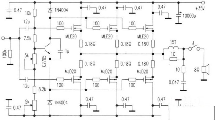 | 笔者近日打造了收到其他维修同行的一台分体结构纯甲类功放,将电压放大器和0dB功率输出级分置于两个机箱内,这样既避免了两者间的相互干扰,同时又便于今后更换不同的电压放大器。电压放大器由并联式稳压电源供电,采用单端放大电路结构,这种电路相对于全对称推挽电路具有更为温暖圆润的音响效果。 电压放大器第一级为共源共基电路,每管工作电流为3mA。第二级为缓冲级,用于隔离输入级和主放级,降低第一级的负载效应,并使主放级得到更充分的驱动,本级工作电流设为5mA。主放级和推动级静态电流取得较大,约为25mA,使之工作在纯甲类状态,为提高整机转换速率和拓宽频率响应打下了必要的基础。本机功率输出级采用三垦新款MOSFET,其特有的负温度特性,非常适合作纯甲类功率输出管。 调试时可先单独调试电压放大器,将CA两引脚短路,调VR1使第一级2k负载电阻上压降为6V,调VR2使输出中点为0V即可。最后调试功率输出级,使末级每管工作电流为550mA,每声道静态电流为1.65A,可输出约45W纯甲类功率(8Ω负载)。调试结束后取消CA短路线,煲机3个小时就能投入使用了。本机表现可概括为:温暖细腻,玲珑剔透,用它来重放人声堪称一绝,电路见图。 |
