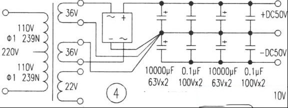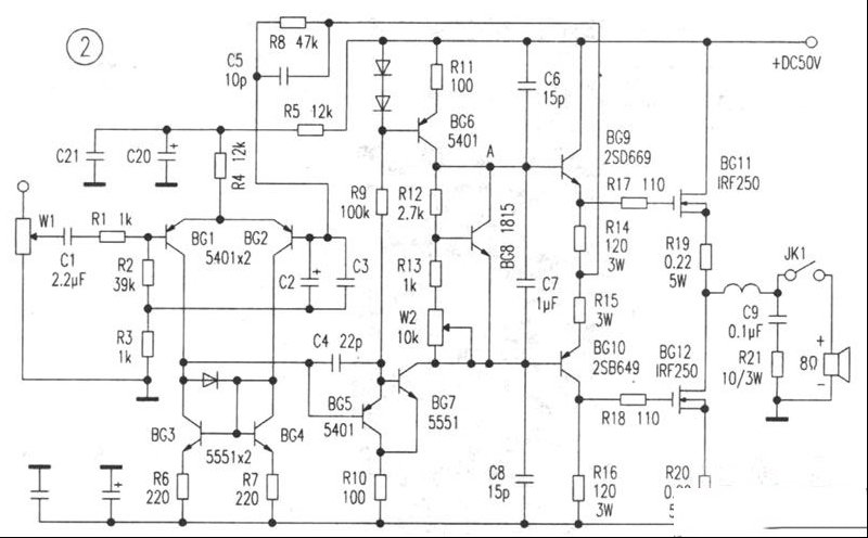 | 笔者用绝缘栅VMOS大功率场效应管IRF250制作纯甲类功率放大器。这类管子在音响界里是冷僻管,不大受人喜欢。该类管通常用于开关电源中,由于该类管高频区线性好、开关速度快、输出电流大、耐压高,让笔者很感兴趣,把它用于音频放大器中作功率输出管,在甲类输出状态下,声音极具“胆”味。该管的价位低廉,拆机品2元/只,便宜好找,适合工薪族发烧,何乐而不为? 一、场效应管与电子管的原理比较有相似之处 场效应管与电子管的原理相比较如图1所示。场效应管的源极供应电子,相当于电子管的阴极,漏极泄漏电子,相当于电子管的屏极(阳极),栅极是控制电子流的大小,和电子管的栅极作用完全一样,都是通过栅极“G”来输入控制,开大或开小电流从漏极流向源极(电子管是阳极流向阴极)。它们都属于电压控制器件。 二、VMOS管的缺点与制作中的克服 对于电源开关管IRF250、IRF240而言,确与音频名管中的K135、J49等有差异,使众多的发烧友不大喜欢用这类管子。笔者认为其成了冷僻管的原因有两点,一是开启电压的差异,IRF250达到3V~5V不等,给推动级增加了极大的负担。二是该管的一致性差,不好配对,N沟道和P沟道的异极型就更难配对了。 音频CMOS管在0.2V-1.5V的范围就能开启,并进入良好的线性工作区,对推动级的驱动能力要求低,且一致性好,容易配对。因此用IRF250给制作带来一定难度,工作中有时一部分管子已到甲类状态,而另一部分管子还在乙类状态,甚至有的工作在开启与夹断之间,劣化了音质。 针对IRF250这类管子的特点,笔者认为可以避开它的缺点,挖掘它潜在的优点,如高耐压、大电流和好的高频放大线性等。 实际制作中,应将电路的重点放在推动级上,只要推动级能输出驱动末端场效应管所需的开启电压3V~5V,也就克服了上述的一大难点。另一个是对差分电压放大管和中功率驱动管的配对误差要在2%的范围内(用数字表配对),每声道只用一对输出管,就不存在配对难的问题。IRF250管子的功率本身就大,没有必要采用多管并联。每声道使用一对输出管,纯甲类最大不失真输出功率在60W-100W,能胜任大多数家庭的使用要求。 三、线路的选择和改进 笔者选用的是日本雅马哈(YAMAHA)功放的线路,把输出级进行了改造而成(见图2)。IRF250这类管子都是同极型N沟道,因为没有与之功率、耐压、栅偏压值相近的异极型P沟道管子,所以对同极型的管子采用准互补推挽输出。 四、器件的选择要求 三极管的选择要求BG1和BG2、BG3和BG4、BG6和BG7的配对误差在2%以内,BG9和BG10的配对误差在5%之内,其余照图选择就行。中功率驱动管功率要求在20W以上(大功率管更好),才能满足驱动输出3V~5V的电压,这时末端管子的栅压差异在2V-5V。驱动管也工作在10mA-40mA的甲类,发热较高,要求加装散热器。C1、C3、C7用聚丙烯电容,C2用钽电容,电阻按图上要求即可。 电源变压器应在500W左右,笔者用的是630W的C型铁芯,按图4的电压参考自制。机壳用1.5mm厚的铝板,制作成400mm×340mmx115mm的底座,面板厚5mm,也可用旧机壳改制。 五、整机的调试 1.通电前应先检查电路各焊点及所有连接线是否正确,整流电源的正负电压是否对称。 2.先不接末端场效应管,通电测量R14与R15的中点是否为0V,待正确后再接入输出场效应管,慢慢微调R9使输出中点为0V。一般相隔15分钟有一次变化,要多次调节,该电阻或可调电阻的功率不能小于1/2W(尽量大些),小了易在装机后产生漂移不稳定。 3.用数字表毫伏挡检测输出源极电阻0.22Ω两端压降,再慢慢微调W2,使0.22Ω电阻两端压降在100mV,两个驱动管的基极AB端的压降在7V~10.5V不等,使输出管的静态电流在1A~1.5A左右,进入纯甲类状态,发热很利害,要求铝材散热器重量每声道不小于2.5kg(从这个角度看,石机的耗电不比胆机小,特别是在甲类大功率情况下,有时还要超过胆机——编者)。W2要用小型多触点的精密微调电位器,以免有跳动或者悬空,损坏输出管。 4.喇叭保护器的调节应按图3设定。 因为大于1.5V会烧喇叭小于1.2V又会频繁地保护而产生不稳定,所以把它设定在1.4V左右为宜。具体调校法:用1.5V和1.2V电池各一节,第一步将两节电池负极接地,正极分别碰触ROUT、LOUT两端。正DC电压经过R22和R23给BG15基极建立电位导通ec脚,使BG16的基极被拉下为0V截止,致使BG17截止,继电器失电眺开切断扬声器。第二步将两节电池正极接地,负极分别碰触ROUT、LOUT两端。当负DC电压经过R22和R23给BG13的be脚建立起电位并导通ec脚,使BG14基极建立电位导通,同理,又使BG16和BG17截止,也使继电器跳开切断扬声器,达到保护的目的,调节R23将动作电压调整到正负1.5V和1.2V均动作为止。 该功放声音十分甜润,弹跳力度好,低音威猛强劲,高音细腻。发烧友们自己去动手感受吧! |