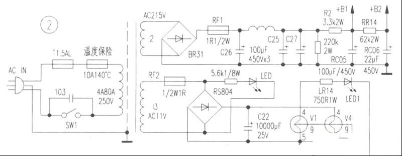 | 很多音响爱好者喜欢胆机优美、柔和的音色,但往往又因为已有了晶体管放大器而不想“另起炉灶”配置一套胆机。实际上完全可以利用已有的晶体管放大器,在前面加一个胆前级,亲自体验一回胆机的音色。这里介绍一款方便自制的胆前级放大器,这是参照成品胆机的成熟电路自制的胆前级放大器,此放大器是采用著名的靓声胆管12AX7和12AU7制作的两级电子管放大电路,原理见图1。 电路非常简洁,制作较为简便,而性能却较好,符合高保真音响没计“简洁至上”的原则。现以一个声道(R声道)为例,来简要分析放大器的基本工作原理。 当音频信号输人RIN端子后,先经音量电位器V2 (250k)调节,再经RR01输入到1/2V1(12AX7)的栅极后进行预放大;1/2 V1和下一级电子管1/2 V4之间是直接耦合的,这样不仅可简化电路,还可以达到较好的信号传送性能。1/2V4(12AU7)接成阴极输出电路,以便能获得较低的输出阻抗,去驱动后级的晶体管放大器。 前级的噪声对后级影响相当大,因此前级的电源电路要考虑有很低的残留纹波和较好的级间去耦合,这样才能保证信噪比达到要求,原成品机的电源电路见图2所示。 供给电子管的阳极高压电源由电源变压器的AC215V次级绕组提供,先经桥式整流,π型LC滤波电路滤波后,再经两级RC滤波电路为前级放大电子管提供电源。RF1为熔断电阻,可以在阳极电源短路时保护电源电路。前级电子管V1和V4的灯丝采用直流电源供电,以便消除前级交流声。这里用AC11V经整流、滤波后供给V1、V4的灯丝电路同时还供给电源指示灯。此机电源电路的每一组均加了熔断电阻进行保护,变压器的初级串有保险丝,还串联了熔断电阻和温度保险丝,这样对胆前级的安全性更有保证。实际制作时可以适当简化电源电路,例如,可以将滤波阻流电感去掉,用一个390Ω2W电阻代替,滤波电容也可适当减小一些。有的熔断电阻也可不用。 这里谈谈此胆前级放大器的元器件选择问题。前级电子管12AX7和12AU7目前还好买到,我用的是曙光管,性能还好,价格也较便宜。据说进口的12AX7EH和12AU7EH的声音要柔美一些,只是我手上还没有现成的胆管,因此还没有试过。从资料上来看,12AX7可以用国产6N4代替,12AU7可以用国产6N10代替,如果发烧友手上有现成的国产6N4或6N10管不妨试试。 电路中的耦合电容RC04可用聚丙烯薄膜电容,也就是音箱分频器中常用的CBB型,放大电路中的输出耦合电容LC06可选择性能较好的音响专用电容;电阻的数量不多,可都用金膜电阻。阳极高压电源电路中的整流桥堆可采用彩电开关电源整流桥堆,前级灯丝电源的电流只有数百毫安,整流器件可以采用4个1N4002硅整流管;其余元器件的规格型号可按电路图上标注的选择,应尽量选择优质的元器件,以保证制作成品的安全和质量。电源变压器的制作也很关键,如果有现成的胆机变压器,高压绕组电压较接近图纸上的电压值,但往往灯丝绕组只有AC12.6V的,这种变压器也是可以用的,只是要在整流输出上串联合适的降压电阻(功率要足够),使电子管的灯丝电压实测达到12.6V即可。 由于这一电路较为成熟,因此只要装配时连接正确,一般不需要调整即可正常工作。我将此胆前级连接到收到其他维修同行的一台天逸AD-66A放大器前面,播放CD音乐节目,感觉音色确实有一定的改变,总体感觉声音要悦耳动听一些。特别是播放一些女声独唱歌曲,感觉歌手的声音更柔美、清晰、温暖。播放小提琴独奏音乐时,小提琴的声音显得要淳厚一些。 我又连接飞利浦SA165型MP3机,试播放几首压缩较好的MP3音乐,感觉声音明显要柔和、厚实一些,音乐的细节也似乎要丰富一些,虽然是播放的MP3压缩音乐,但听起来真有点播放CD音乐的感赏! |