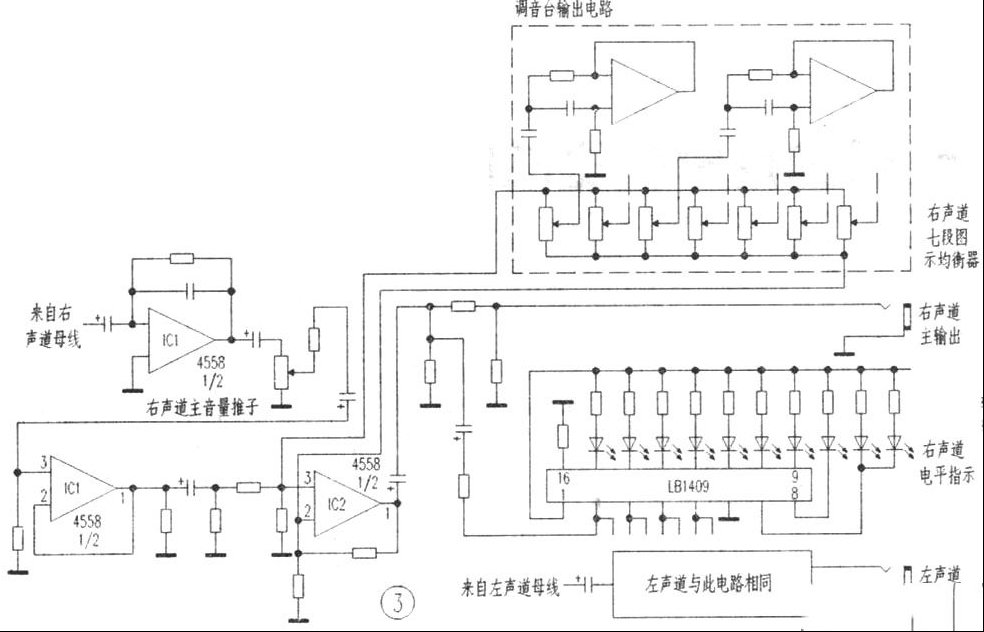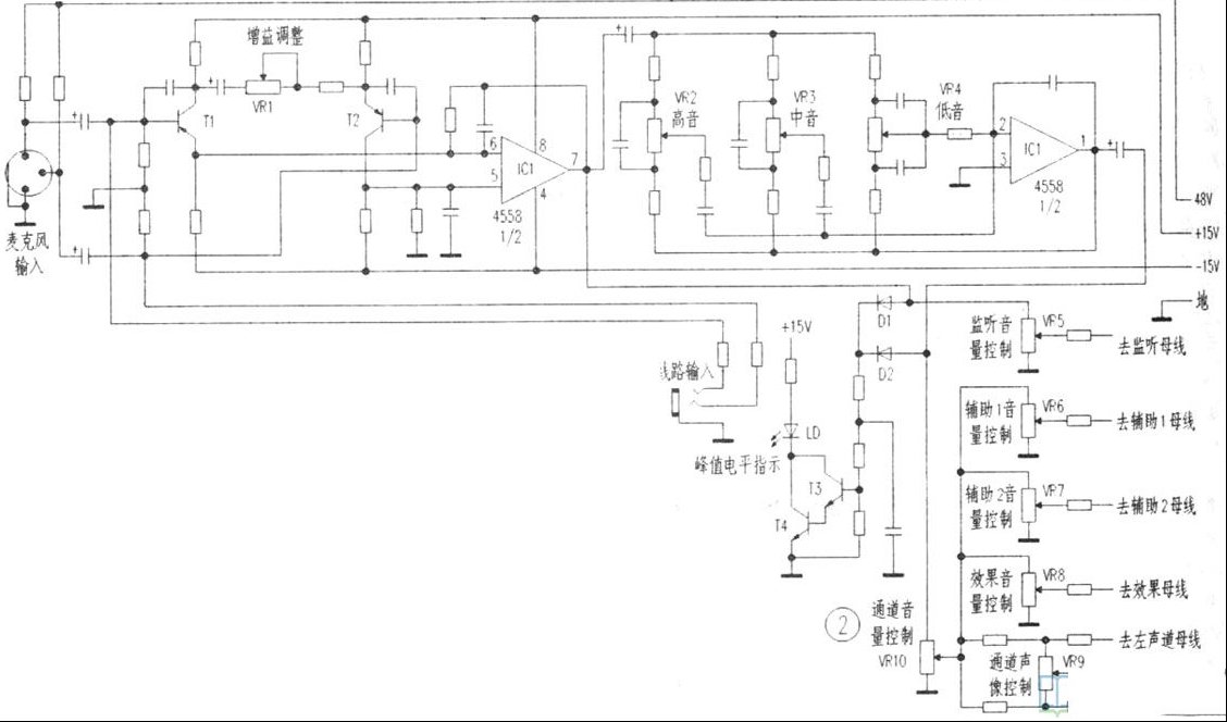 | 调音台自8路、10路、12路、16路和24路等多种规格。按电路组成有常规型和内置功放型两大类。常规型又分内置电源和外配电源两种,各机型主要电路和结构大同小异。图1是结构框图,每个通道单独做在一块印刷板上,各通道电路通过多条母线与各输出电路和供电电路连成一体,完成信号输入、放大,调音、混音、效果、监听、输出等功能。从框图中可以全面了解音频信号是如何从各通道输入放大后分配到各个母线,各母线又是如何把信号送到各输出电路。 一、通道电路原理 图2是一般调音台通道电路图,以8路调音台为例,有8块一样的通道电路板被各功能电位器螺母固定在面板下,用扁平排线作母线与后级连接。 线路输入口一般都采用φ6.35mm大三芯插座,同样是平衡输入方式。是卡座、CD、VCD、电声乐器等音乐信号线路输入口,输入信号电平是775mV,这是音响设备标准线路输出输入电平。因干扰后号相对小得多,常用独芯屏蔽线接成非平衡方式使用。线路信号电平比麦克风信号电平强数百倍,所以用电阻衰减后才进入差动放大器。差动输入级由T1、T2组成,两管基极分别是平衡式输入的两端,两管发射极间可调电阻VR1是输入增益控制钮,通过它可改变放大器的负反储,对输入信号增益进行控制。放大后的信号经集电极输出后进入双运算放大器IC1(4558)的⑤、⑥脚,放大后由⑦脚输出给由另一半4558组成的三段均衡电路,调整VR2、VR3、VR4可分别对中心频率为10kHz、3kHz、100Hz的高音、中音、低音进行12dB的提升或衰减。经放大和均衡后的信号由通道衰减推子VR10控制后分配给各母线送往后级。 监听信号取自三段均衡前,是让调音师监听原信号以便均衡补偿。VR5用于送往监听母线的音量调整。VR6和VR7是辅助1、辅助2送住辅助母线的音量控制电位器,经辅助母线送至辅助输出电路,辅助输出可配接外置效果设备或舞台返听监听功放等。VR8控制送住效果母线的信号强度,经效果母线送至效果输出口和机内延迟混响电路,经效果处理后的信号再由效果输入口返回至左右声道母线。一般只在使用麦克风时才需开启此钮,用混响润色人声。 每个通道信号都是单声道信号,经VR9声像调整后分配给左右声道母线。适当调整该旋钮位置可改变该路声源在左右音箱中间的空间位置感,形成立体声效果。峰值电平指示灯LD是检测信号放大过程中是否仃信号过强造成削顶(饱和)失真现象,被检测信号取自三段均衡前和三段均衡后两处。两处信号各经二极管D1、D2检波后分压给推动三极管T3、T4,当有一处信号过大时,三极管便导通,LD点亮,提示操作员调整通道增益旋钮VR1和三段均衡调整钮VR2、VR3、VR4做相应的衰减控制。通道音量推子VR10只对输给母线的信号有衰减作用,对通道削顶失真无调整作用。 二、输出电路原理 图3是主输出一个声道的电路,右声道母线的信号经4558放大后通过主音量电位器(主推子)控制主输出信号电平,再经另一半运放缓冲后进入由多个运放组成的七段频率均衡电路。经对不同频率的信号进行提升或衰减,最后由主输出插座输出给配接的功率放大器。 辅助输出、监听输出、效果输出电路基本一样,如图4所示,由母线送来的信号经放大并通过音量电位器衰减后缓冲输出。辅助输入、效果返回电路也基本一样,先经音量控制再进入运放放大,通过声像电位器分配给左右声道母线。 机内混响电路是通过双触点插座接入效果电路的,在不外接效果器时机内混响电路送回左右声道母线。当效果器插头插入时机内混响器被断开。机内混响电路与卡拉OK混响电路基本一样,常使用BBD、M50195等。也有采用育预没功能和数字显示的音效处理电路的。调音台面板中英文对照与功能说明见附表 |