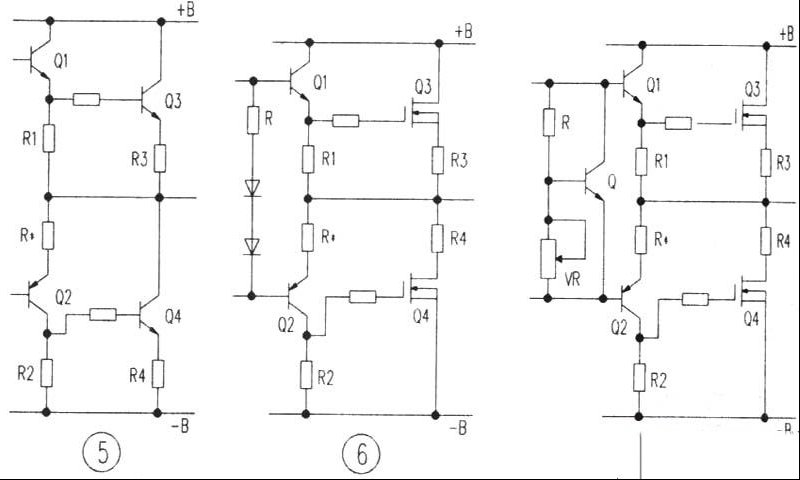 | 在日常的功放维修中,遇到功率管烧坏但无合适的对管替换时,可以考虑用不同型号、不同类别的功率管来代换,如用常见的NPN管替代PNP管,用场效应营替代功率三极管,或用三极管替代场效应管。特别是场效应管中N沟道管可代蹦管型号很多,P沟道可选品种较少,可用同极性管代用。 在当前流行的功率放大器中,除集成功放电路外几乎都是采用OCL电路。其电路结构繁简有别,但末端推动级和输出级基本一样,如图1至图4所示。 图1中将电阻R1用两个电阻串联即与图2一样,将图2中R1、R2连接点与输出中点连接即与图3一样。将图3中两个三极管换成场效应管便与图4一样。将图1、图2改成图3电路对整个电路没有任何影响。 将图3中NPN、PNP对管改成用两只NPN管(如图5所示),只需将图3中Q2集电极与负电源断开,把R2拆下跨接在断开处,在原R2电阻处增加一个100Ω的反馈补偿电阻R*,用NPN管换下Q4,将原Q4基极电阻移接在Q2的集电极,替换就完成。 图4是场效应对管输出电路,将场效应对管换成三极管对管或将三极管对管换成场效应对管只需对恒压偏置作一点改动就可。 三极管对管偏置是±0.5V,场效应对管偏置是±1.8V,调整图6、图7中R的阻值满足±0.5V或±1.8V即可。全用N沟道场效应管的方法和全用NPN管方法一样。如果原电路用的是场效应管,改用三极管后要把原来数百欧姆基极电阻换成4.7Ω,同样将原三极管换成场效应管时应将原来4.7Ω电阻换成470Ω。 |