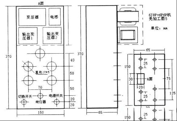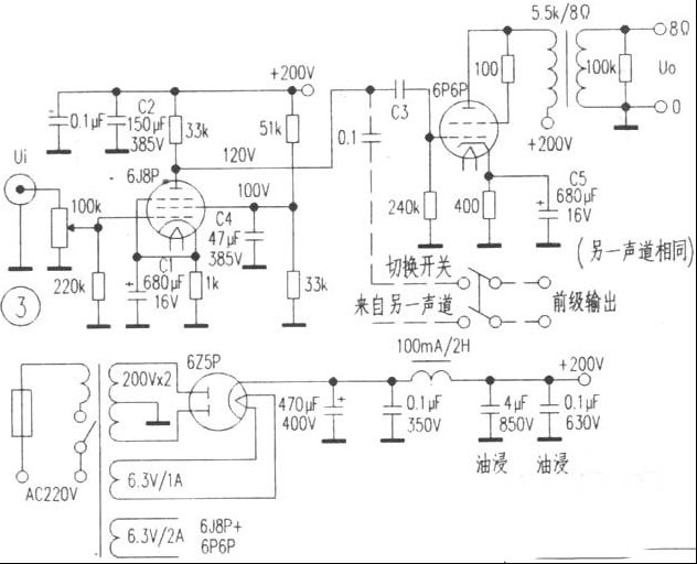 | 一、6P6P单端甲类胆机的设计 1.前级放大:采用国产中高频电压放大五级管6J8P(欧美型号5693、1514、EF86、俄罗斯型号6*8C),该管以音乐味浓郁而著称,曾被多种世界名机采用。其特性曲线如图1所示。其第二栅电压Ug2为100V,使用分压电阻51k、33k分压得78V,再经电容滤波可稳定在100V左右。 本机电源电压为200V,根据6J8P的静特性曲线,阳极电流为6mA,负载电阻则为Ra=200V/0.006A≈33k。连接横座标轴200V(N点)和纵坐标轴6mA(M点),即为该管的动特性曲线,在线段MN上的a、b两点之间确定中心点Q(相对应的栅极电压Ug=-3V、阳极电流la=3mA、阳极电压Ua=120V。 为了让Ug=-3V,阴极电阻Rk=3V/0.003mA=1k,从图1可以看出,6J8P采用标准接法的最佳静态工作点Q为Ua=120V、Ia=3mA、Ug=-3V,以保证“Q”点处在甲类放大状态下,动特性曲线上Q点的电压变化在0.5V~1V时,输出交流信号电压(指横坐标Ua)就可达到50V左右,输出交流信号电流(指纵坐标Ia)同样可达到3mA左右,这样推动6P6P作功率放大绰绰有余。 2.功率放大:6P6P采用无负反馈单端甲类输出电路。其三极管接法的静态特性曲线如图2所示,输出变压器初级端的交流阻抗Ra=5.5k。 在图2上确定静态工作点Q(甲类状态Ia=30mA、Ua=200V),由于交流负载线也通过Q点,其斜率tgα=1/Ra,经过Q点做此斜线交坐标轴于M点和N点,MN即为6P6P的动特性曲线,MN上a点(Iamax=60mA,Uamix=60V)和b点(Uamax=340V、Iamix=4mA)之间即为a、b段的中心“Q”点其相应的栅偏压为Ug=-12V,通过同样的方法算出6P6P的阴极电阻Rk=400Ω。 最大理论输出功率为: P=1/2[(Eamax-Eamin)/2]×(Ia-max-Iamin)/2] =1/2((340V-60V)/2)×((60mA-4mA)/2) =1.96W≈2W 整机电路图如图3所示。 二、元器件的选配与制作 机座设计图纸见图4,采用1mm厚的钢板冲压制作。选择较好的4芯铜线绞合成一股(实践证明这样做,交流干扰声特别小)作为前级交流灯丝的连接线。且紧贴干底板走线。开机首先检查各灯丝电压是否正确。信号线和音量电位器连线紧贴底板边缘走线。 三、检查与调试 连接8Ω假负载或者扬声器,开机测量各点电压尽量符合电路所标出的具体数据,使其6J8P、6P6P的静态工作点Q都位于甲类状态。耳朵距离音箱30cm应听不到交流声,否则就应检查布线及滤波电路是否正确,使用的滤波元件容量是否够标称值。 四、自我感觉 播放弦乐时音色滑润、低频延伸和控制力较好,尤其是使用了俄罗斯的6*8以后,音色更显华丽而优美,意境宽阔。 |
