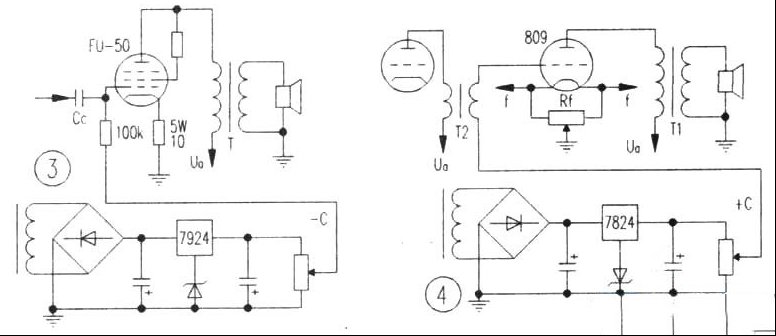 | 在电子管放大电路中,由于电子管的放大作用,很小的栅偏压变动就会造成屏流较大的变化,因此栅偏压不稳会造成电子管工作点的漂移。另外,栅偏压是与输入信号串联加在栅极与阴极之间的,栅压供给电路的噪声杂波,同样也会在放大信号时被放大,造成信噪比下降。由此可以看出对栅压供电电路的要求比屏压要求更高。现介绍几种常用的栅压供电方式及特点。 1.自给栅负压供电电路 自给栅负压供电方式是功率放大器中最常用的方法(见图1)。其工作原理是利用屏流在阴极电阻Rk上产生电压降,使阴极产生Uk=Ia·Rk的对地为正极性的电压。而栅极通过栅漏电阻Rg接地,其对地电位为零。这样,栅极电压相对阴极来说为负极性,形成栅负压。当电子管工作于甲类放大时,虽然屏流的直流成分是稳定的,但随着输入信号的变化,屏流中交流成分每个瞬时值都是变化的,阴极电阻Rk上的压降也随着变化形成电流负反馈。为了避免这种现象产生,一般在Rk两端并联一个大容量的电容,使交流成分“短路”。图1中影响栅负压的Ck元件的容抗Xc=0.2Rk。当Ck容量>100uF时,可采用几只电容并联,或在Ck上并联0.1uF~0.47uF小电容,使其频响得以改善。自给栅偏压的优点除电路简单、输入阻抗高、频率特性较好以外,还具有自我保护的能力。由于某些原因使屏流增大时,阴极电阻的电压降也增大,造成栅负压的增加,栅负压的增加将使屏流减小,从而保护电子管不致损坏。 2.栅漏式栅负压电路 此种栅负压形成电路的特点是无阴极电阻,栅漏电阻值取得较大(见图2),一般为3M-5M。其工作原理是电子管工作时栅极与阴极电位差为零,当电子由阴极向屏极发射时,有一部分电子撞到栅极上被栅极吸收,使栅极变成负电位。为了使栅极尽量多地捕获电子,一般采用栅极距阴极近、距屏极远的电子管。而且栅极的金属丝绕制密集,如高u三极管或五极管。另外Rg的阻值较一般放大电路的屏极电阻值大许多,这样可使屏极场强较小,吸引力减小,使栅极捕获较多电子。此类电路的优点是电路简单。另外,阴极直接接地,可有效地降低灯丝电压对放大器的干扰,信噪比高。但此类放大器栅极负压一般为1V左右,输入信号幅度不得超过0.5Vp-p,主要用于小信号放大。如电磁式电唱盘放大,话筒放大或磁头放大等。 3.固定栅压电路 此类电路单独用一组栅压电源为电子管提供栅压。见图3、图4。根据电子管型号不同、工作状态不同,其栅压有正负之分。一般A类、AB1类放大器的栅压为负极性,A2类、B类等工作在有栅流状态的放大器栅压为正极性。固定偏压电路的优点是工作点稳定,不受屏流变化影响。相同屏压下电子管可输出较大功率。缺点是采用固定式栅负压电路的电子管无自我保护能力,一旦栅负压电源电路失效,会造成屏流迅速增大,使之损坏。但A2类、B类放大器则无此虑。固定式栅偏压电路一般应用于功放级。 |