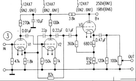 | 一款经典名机Marantz-7线路,曾经影响过一个时代,迷倒一代玩家,现在,还引起不少发烧友的迷恋。笔者出于对该前级线路的极大兴趣,采用改进线路,使用国产胆管,取得比较满意的效果。 动手前,笔者准备了图1和图2两款线路。图1为早期Marantz-7“原始图”。图2为现代玩家的妙手之作(改进线路)。笔者先按图1进行打造,品尝名机的风味。结果,音乐背景杂乱无章,让笔者大失所望,分析可能是老线路不适合现代CD声源。于是又改按图2打造,但也没有让笔者感受到书中说的一丝甜润,不耐听。反复思索,难道是管子的差异?真的要使用进口名管ECC803S和ECC802C,非得用上几百元1只的管子,才能过关或感受名机的味道吗?抑或是线路有差错呢?经分析其他几款改进的线路,都谈到用12AU7代V3,其动感和高音有所改善。根据资料比较,12AX7和12AU7(6N10)差别很大,12AX7为高u值和高内阻,小屏流,12AU7为低u值和大屏流(10mA),内阻也低,可作推动用的中功率管,用该管可作阴极输出跟随器,以减低阴极输出阻抗,增大输出负载能力及动态控制。 别无捷径,只好对该线路作重新调整和改进,如图3所示,使之适应国产的6N1、6N2、6N4、6N6等管子,在该电路中,这几种管子都能工作在最佳的线性区,也就没有不出好声的理由。 首先,在图2的基础上调整各级的输入输出阻抗,让线路适应CD高达2Vp-p的信号电平而避免过荷失真。 第二步是调整V3的负载电阻R10,使V3的阴极输出电压从原来的183V降为:6N6 45V,6N1 98V。6N1的屏极电压250V左右,6N6的屏极电压150V-190V。即V3用6N1时的电流应在5—6mA的甲类状态,若使用6N6会自动进入12mA-30mA的理论值。这有点像一些玩家使用功率管6P14作阴极输出的原理。目的是降低阴极输出的负载阻抗,提高输出的动态范围。不过,电源的质量和负载能力要跟上,不然会有很大的折扣。 把习惯用于输入端的音量电位器改放到输出端,有利于提高信噪比。并把两声道音量电位器分离,以减少两声道的相互影响。 收到其他维修同行的一台机器理论指标的好与坏,终须通过人的耳朵来验证和接受,本机的低音动态感强,中音甜润,高音细腻,十分诱人。V1、V2使用6N2、6N4或6N1时,效果差别不大,把V3换用6N2、6N4或6N1、6N6,在人声的某些细节上,6N1和6N6的线条要比6N2清晰一些。即6N1和6N6略胜于6N2和6N4。 对不同牌号的管子,尽管理论指标相同,但总还有些细微的差异,对此是可以通过线路上的改进,在调整上下功夫来达到管子的最佳工作状态。 |