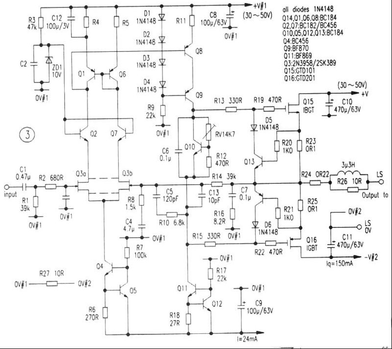 | IGBT是最近十几年来使用很广的大功率半导体器件。IGBT的主要运用一般是在电力电子领域,它接通电阻小于VMOS管而工作频率高于双极型大功率晶体管的基本优点使之成为VMOS和双极大功率晶体管的强烈竟争对手。新型IGBT的工作频率超过100kHz而单管输出功率已愈10kW。把IGBT运用到Hi-Fi的音频功放,似乎不太可能。但是日本东芝公司曾推出一对专门用于音频功放的IGBT管,即本文介绍的GTD101(NPN型)和GTD201(PNP型),并运用它成功制作出Hi—Fi级的音频功放。 这一对音频功放专用的IGBT管在电路设计上克服了常规IGBT管的一个缺点。如图1所示,IGBT管在设计制作时,一个NPN型的寄生晶体管在其内部形成。如果IGBT管内部为一PNP三极管的集电极电流输出超过给定值,这个寄生NPN晶体管将引起IGBT管关闭。 再则若流经IGBT管P基区电流足够大,内部NPN晶体管可以正偏,如同PNP器件一样,成为永久导通的晶闸管。本设计解决办法是在IGBT管的输入端连接一只NPN晶体管,如图2所示,此举起了个关闭保护功能作用。如IGBT管的输出电流超过设计值,输入晶体管就会导通。 一般设计最大电流值为峰值16A,而GTD101为20A。 东芝公司设计的IGBT音频功率放大器电路示于图3。这个电路给出音频输出功率可达40-80W,而总谐波失真小于0.05%。 需要指出,除前面提到的关闭现象外,IGBT管是比双极大功率晶体管更耐用且与VMOS管相比,其门极/源极击穿不敏感的器件。IGBT高的峰值电流有助于在音响领域驱动低阻抗的扬声器。众所周知,双极型大功率管常需防二次击穿的保护电路,而VMOS管在电流还很小时即可能引起波形钳位。 图3放大器输出功率尽管达40-80W,但IGBT功放的输出波形却不错,图4是放大器输出的10kHz方波信号,其负载为容性的2uF。 |