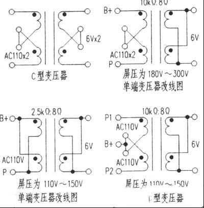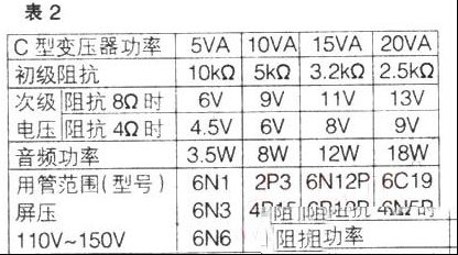 | 用C型铁芯控制变压器改制电子管音频输出变压器,其品质与功率相同的成品音频输出变压器难分伯仲,尤其在清晰度、结像力、大动态等方面要胜一筹,此法无需改绕线圈,有趣者不妨一试。 一、C型控制变压器性能与特点 1.C型铁芯具有磁通密度大,体积小,重量轻和漏磁小(仅为EI型变压器的五分之一)等特点,用于音响设备效果比EI型铁芯变压器要好。 2.由于C型铁芯变压器初级220V绕组和次级各低压绕组,均分两段分别绕在两个骨架上,因此层间分布电容小,高频损耗相应也小,将其改制音频输出变压器,正好利用其结构优势。 二、C型控制变压器的改制 1.改制单端输出变压器 由于C型铁芯控制变压器初级绕组是按交流220V电压50Hz频率确定匝数的,如果要改成6P1、6P14、6P3P等工作电压在250V左右,中心频率在400Hz的单端输出变压器时,初级绕组不必改动:如果要改成并管6N1、6P12P等工作电压在110V左右的单端输出变压器时,可将初级220V两个绕组(中心连线断开)首首相连,尾尾相连。以上两种情况,次级两个绕组(中心连线断开)均同名端(多抽头)相连,由于改成单端输出变压器,为防止铁芯直流磁化,要将铁芯拆开,垫上纸片(厚度见表1),这项工作要首先进行,改制后变压器初次级阻抗与C型控制变压器功率大小及原标电压值相同,应根据欧姆定律计算,有关数值及用管范围见表2。 2.改制推挽输出变压器 此法比较简单,将C型变压器初级中心连线引为连接B+电压的抽头,次级(中心连线断开)同名端相连(即并连)即可,不需拆开铁芯。有关阻抗及用管范围见上表。改制接线图见附图。 |