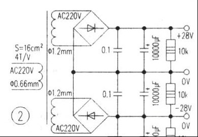 | 本文笔者制作的收到其他维修同行的一台造价低、音质高的2×50W功放,造价低,该机在广场上可供多达600人的晨练,放音效果相当满意。图1是电路图。与过去介绍的功放电路相似,但本图特殊地方是增加了由R4、R5、R6和C2组成的电流负回授,能有效消除扬声器音圈感应电压造成的失真,进一步提高了本机的音质。改变R9能改变本机工作状态,R9值增大输出向甲类工作状态靠近,R9值变小输出向乙类状态靠近,43Ω是甲乙1类状态。本机选管用500型万用表测Q5、Q4的β值要接近,Q6、Q7的β值要接近,Q1、Q2的β值接近。 Q1、Q2、Q5用国产N5551,Q3、Q4用N5401,Q6、Q7用达林顿管D1277。R6、R14、R15用5W瓷电阻,其他阻容元件无特殊要求。如果焊接无误开机就能正常工作,输出功率50W,装两套组成双声道。配上两只音箱,在户外使用经久耐用,音质相当满意。 电源要求有200W功率。图2是交流电源,图3是直流供电,以便在户外使用,用4只12V 3Ah铅酸蓄电池,能保证连续2小时工作。图4是印板图,笔者是用手工刻出所需敷铜板,工具用废钢锯条,将敷铜板用铁尺压好,用手均匀一拉,一条条的断条就出来了。附表是所用三极管特性资料,当然还有更好的三极管。 |